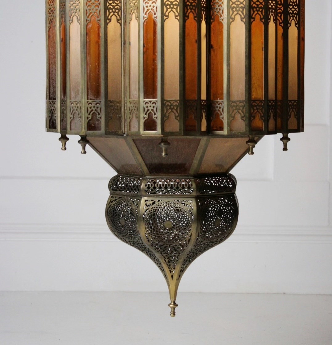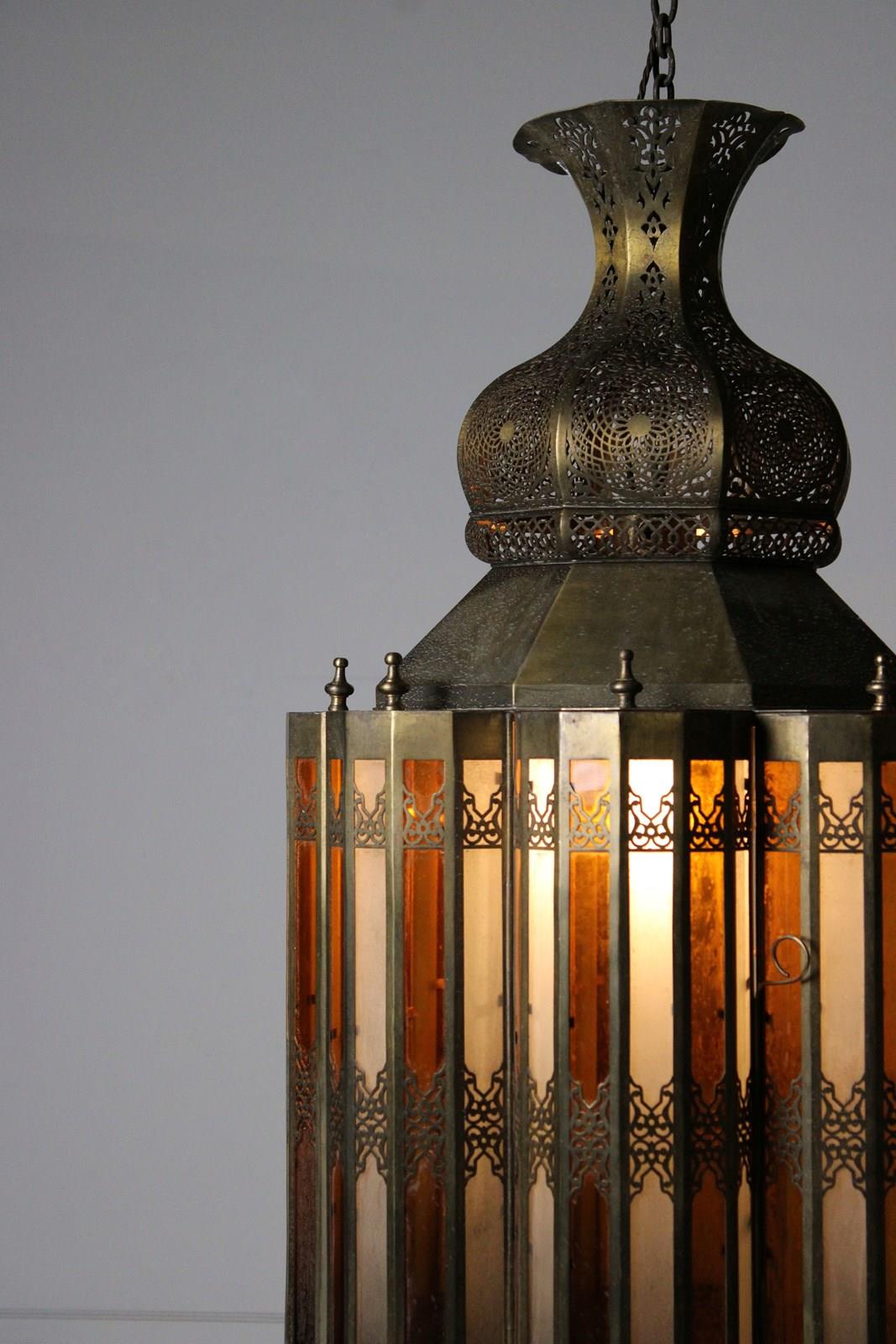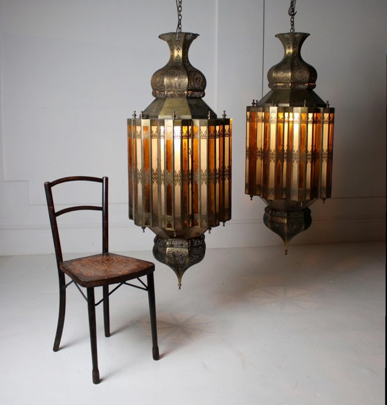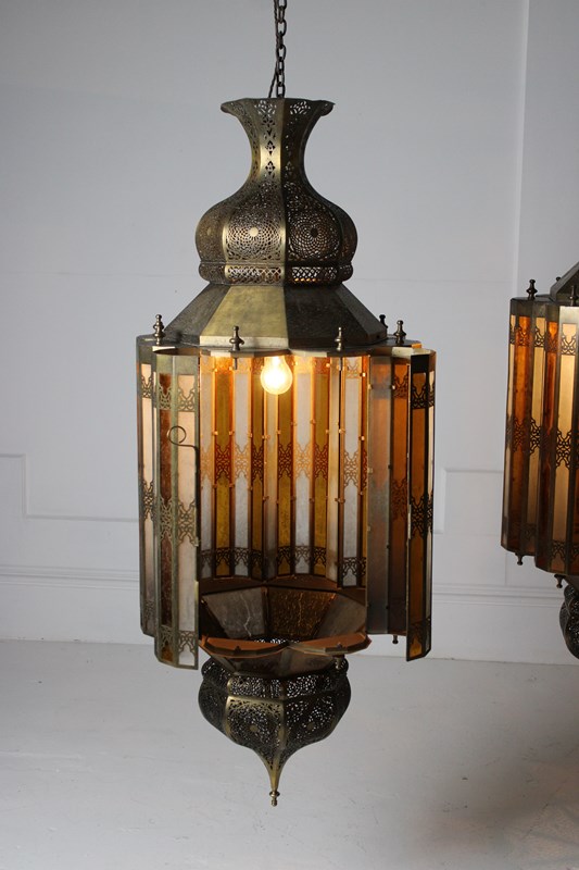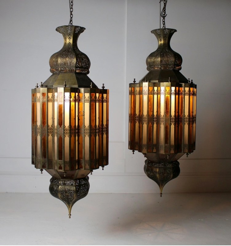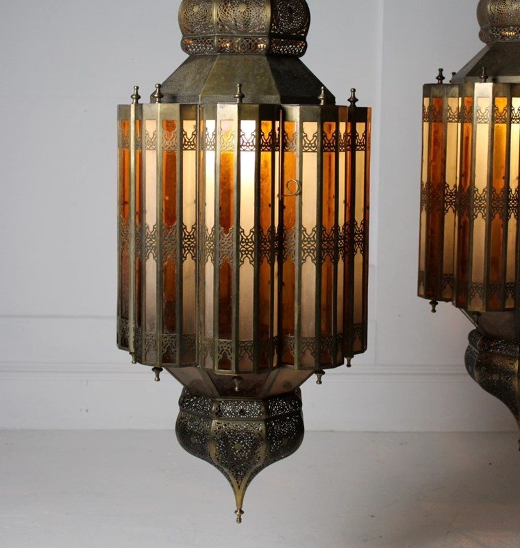 A remarkable pair of monumental Moroccan lanterns, finished in intricate pierced brass, each standing 4.5ft tall and 2ft Diamter.