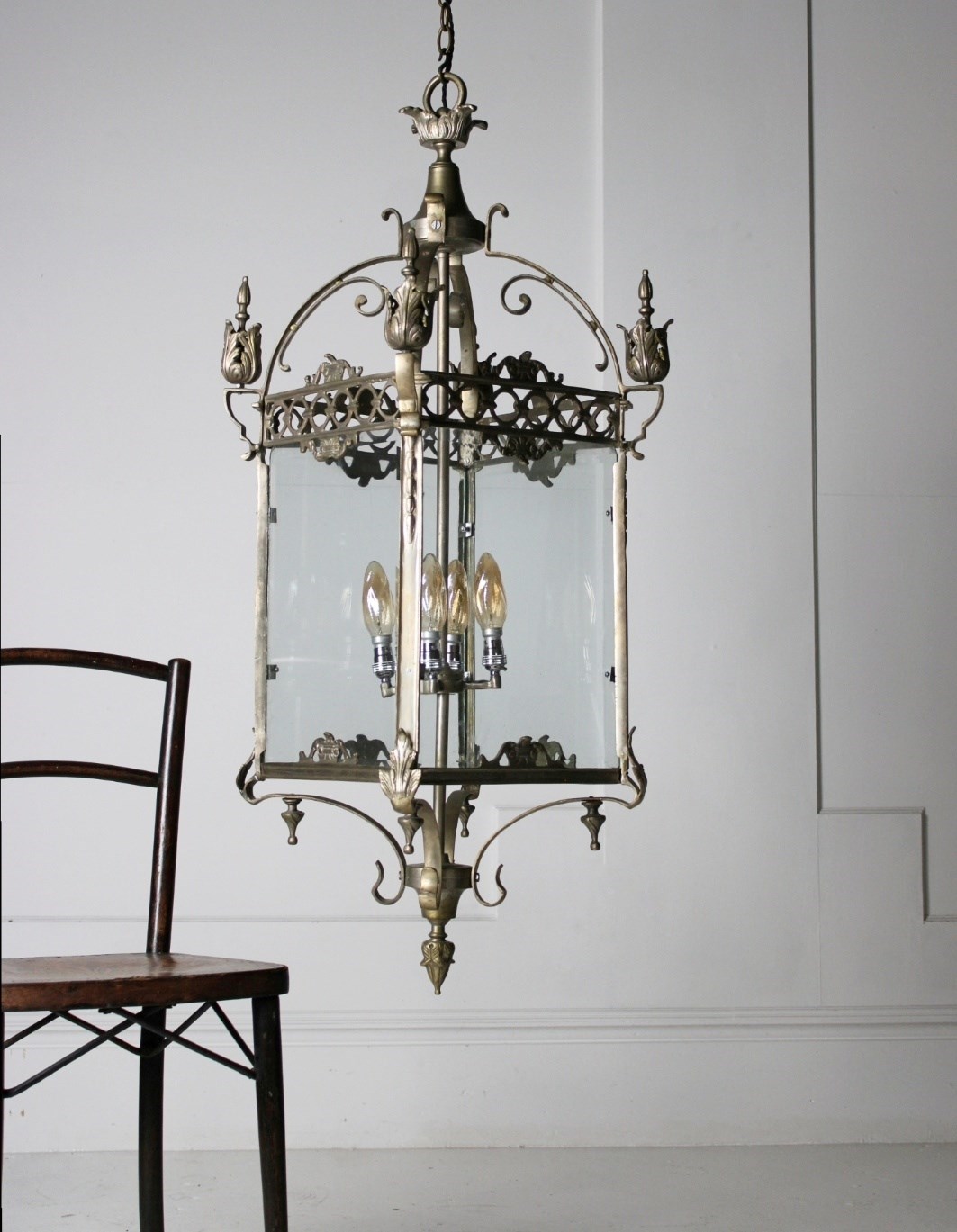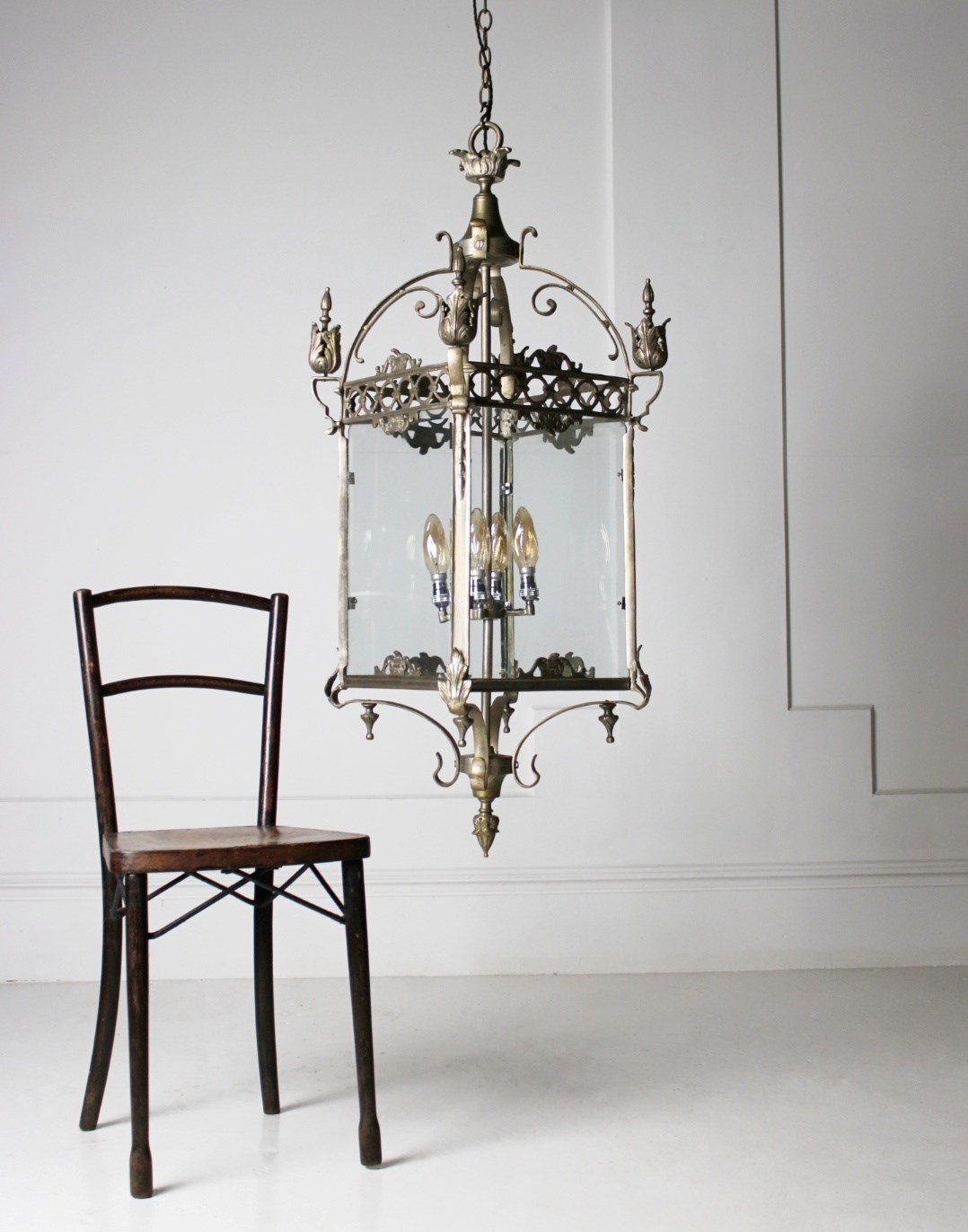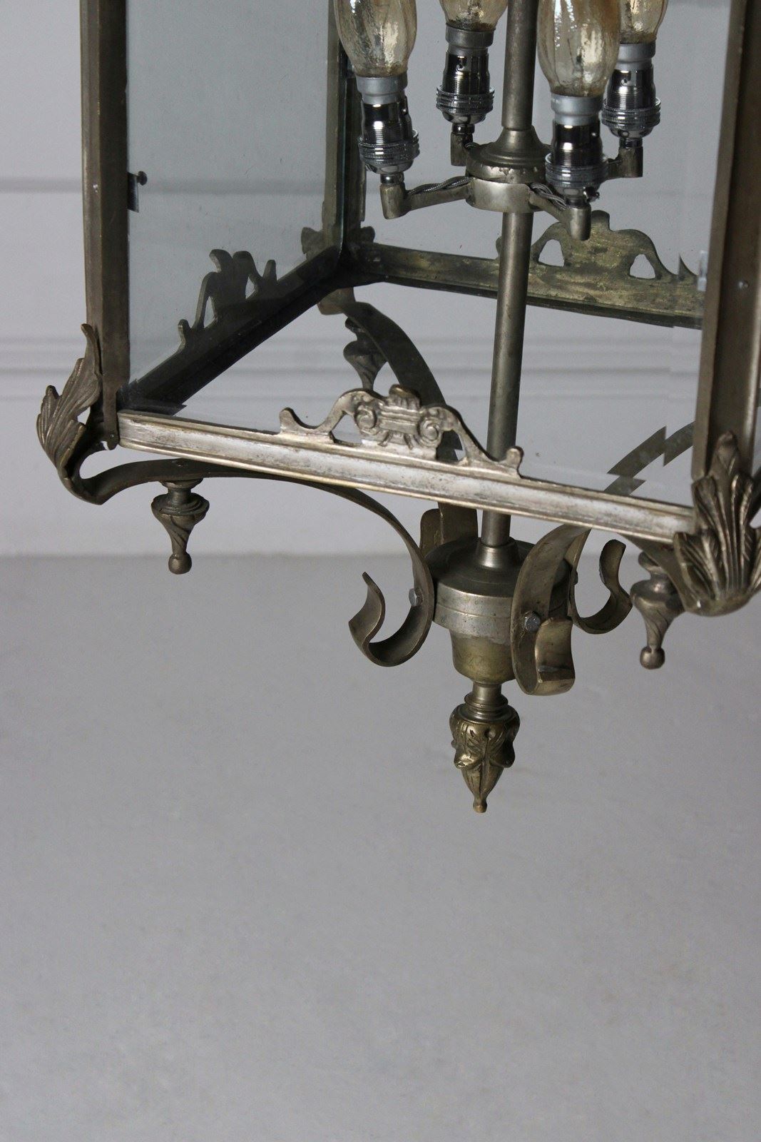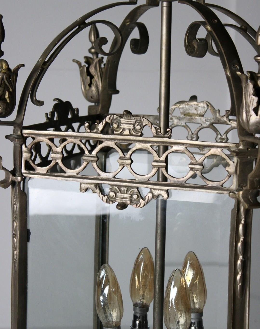A monumental nickel plated brass lantern, boasting great scale and wear, retaining its original thick bevelled glass panels.
