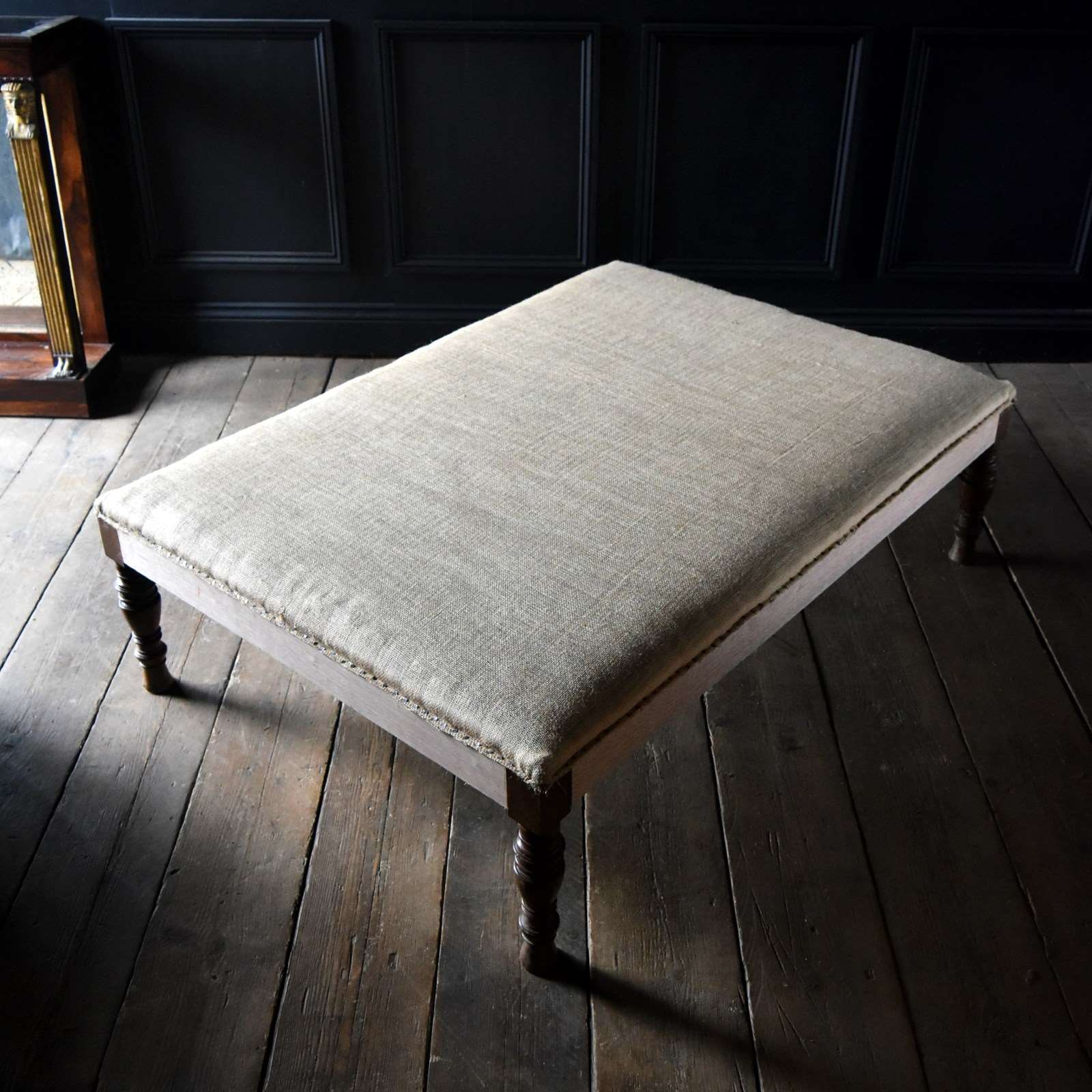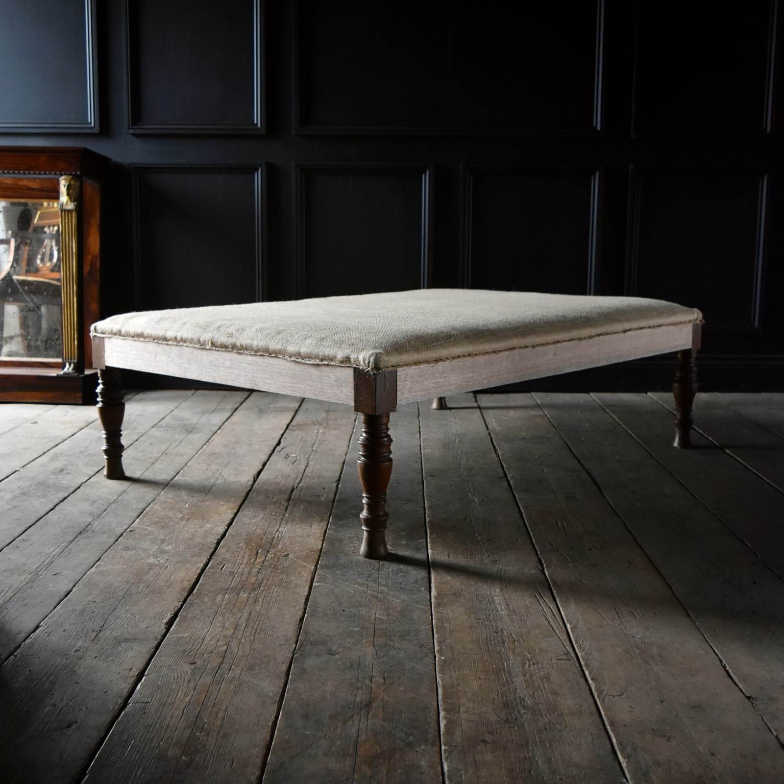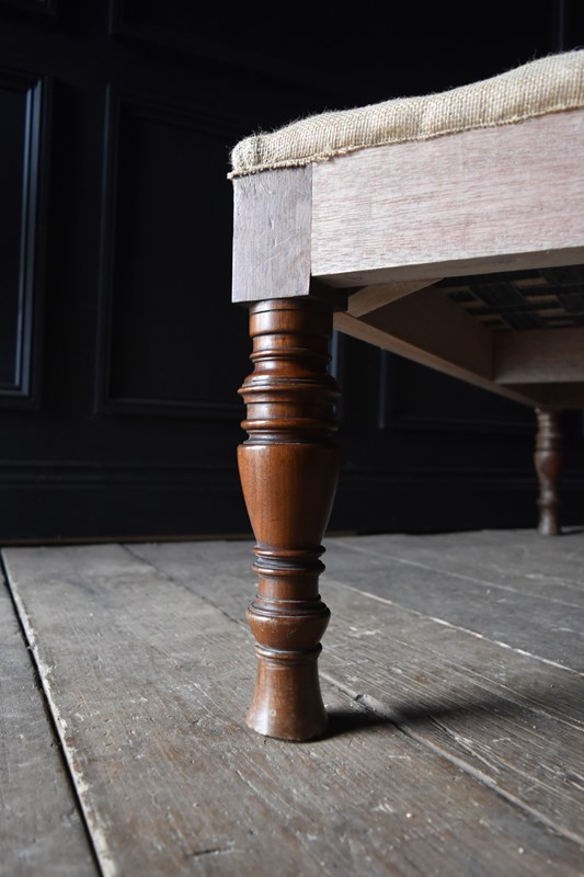Raised on turned and polished 19th century walnut legs integrated within the traditionally built thick cut hardwood meranti (mahogany) frame. Traditionally upholstered using natural materials. The hair and coir top is soft but firm enough to be used as a coffee table (with trays). A solid durable ottoman built to last.