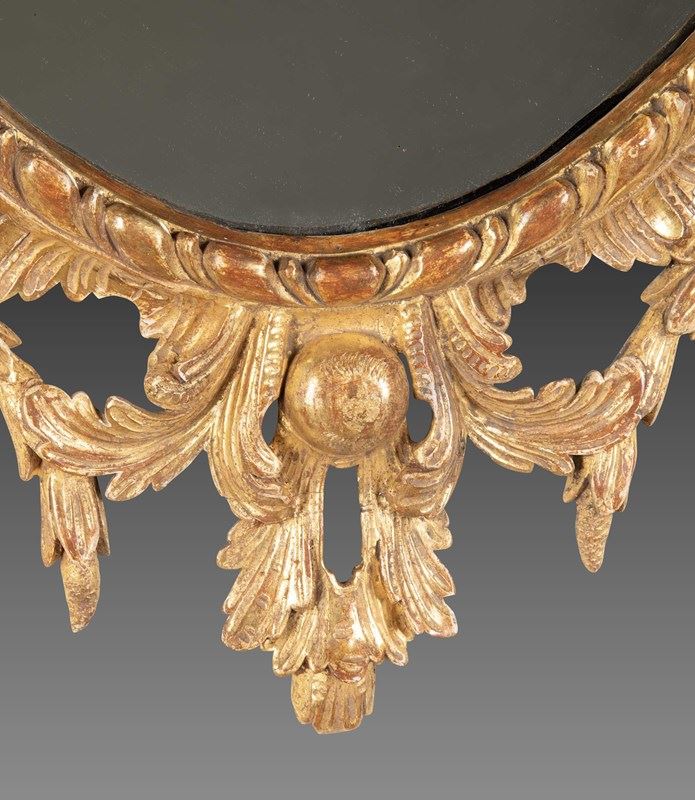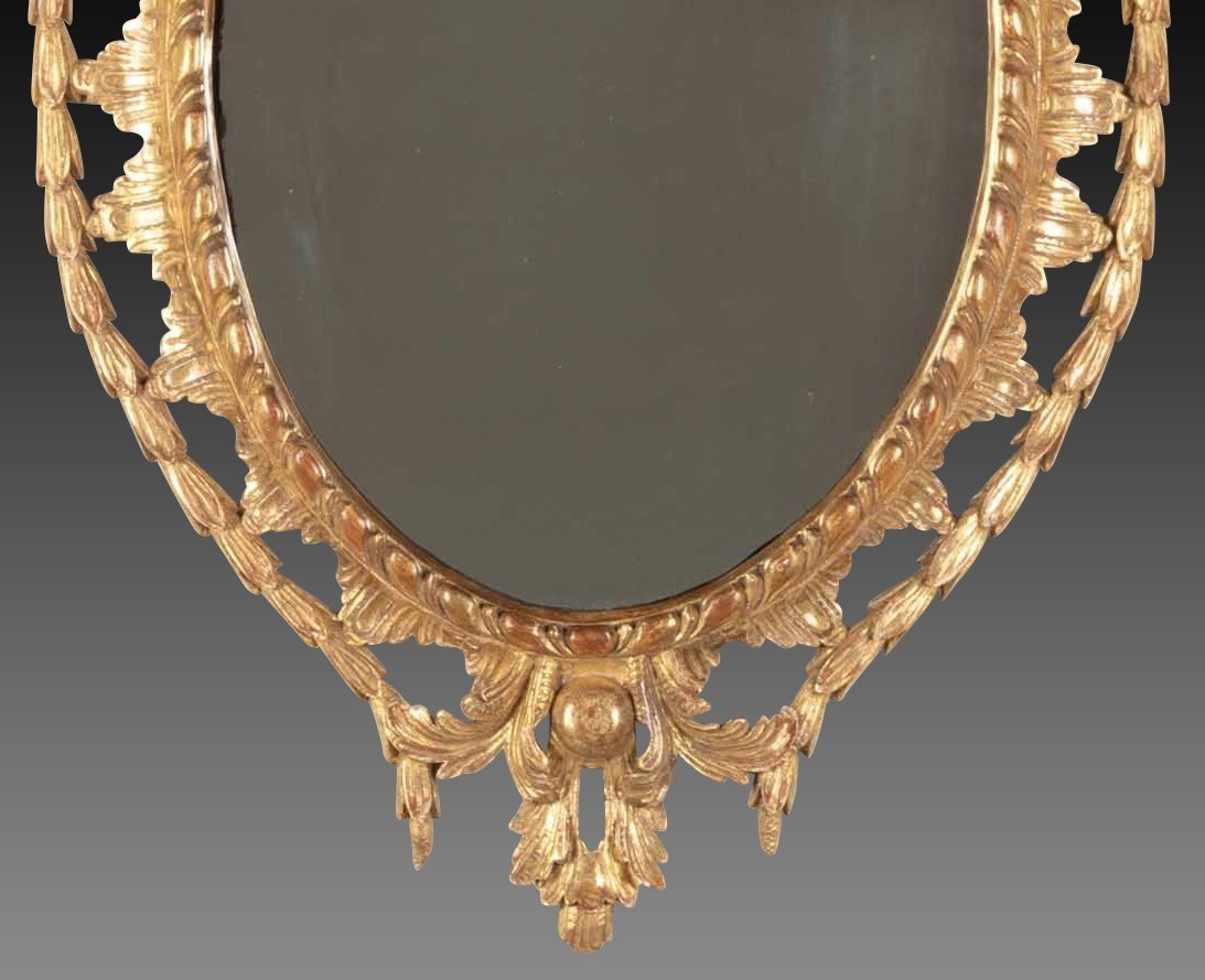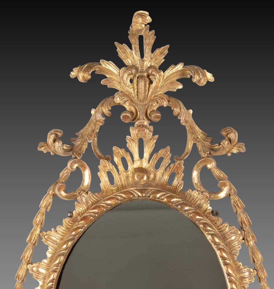 An exceptional quality mid C18th oval giltwood wall mirror, with elaborate overhanging scroll acanthus crest, above pierced rococo and C-scroll carving and a trailing lines of laurel. Still retaining its original water gilding. Circa 1770. In remarkable good original condition and finely carved throughout. Attributed to design of John Linnell.