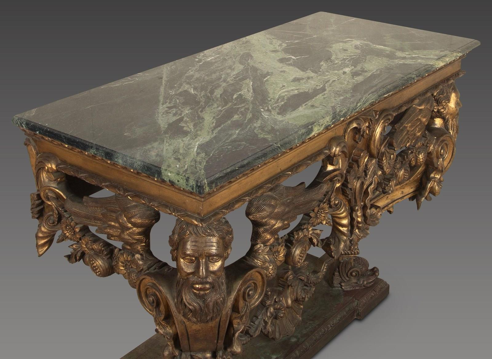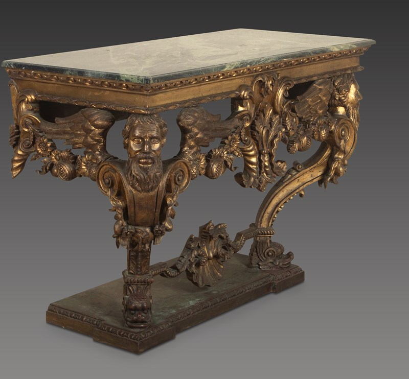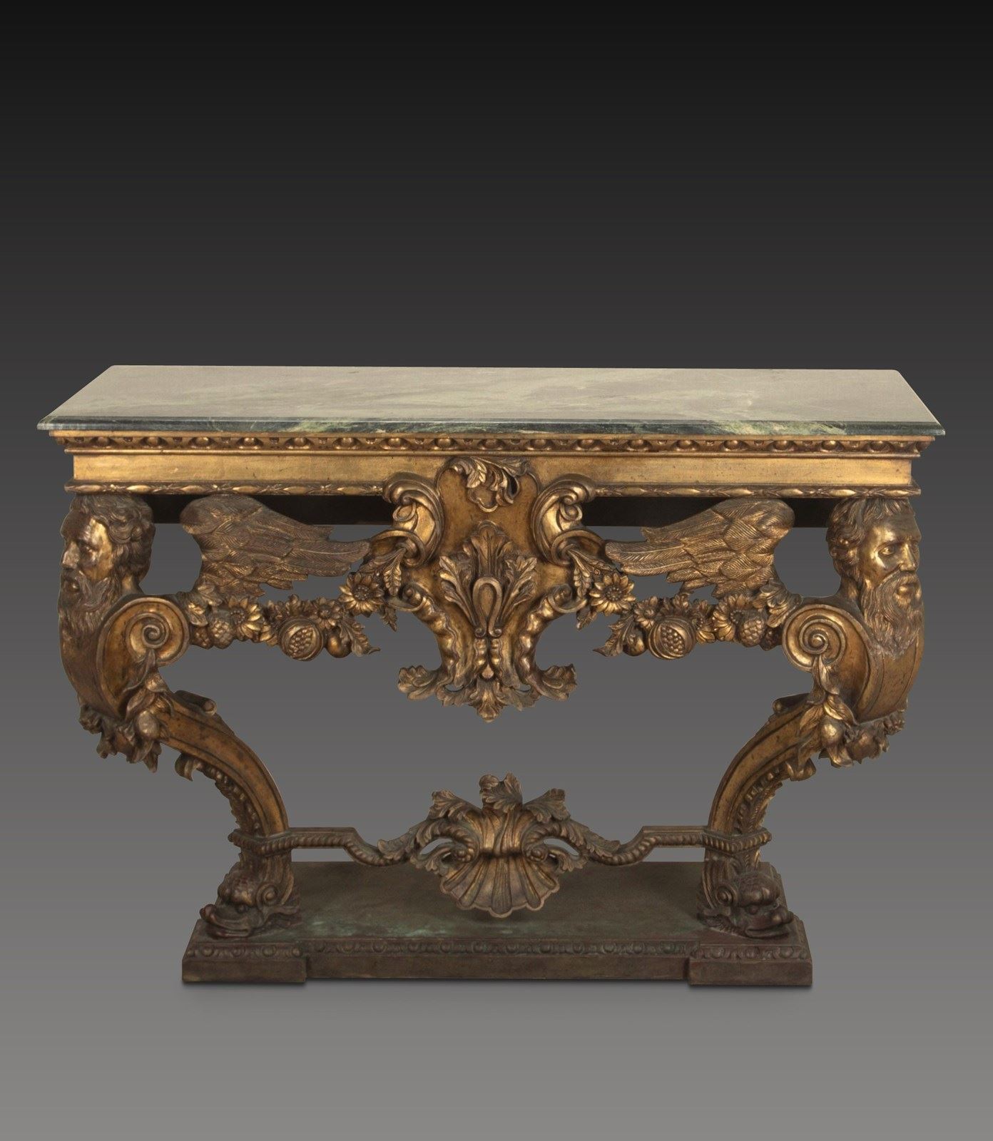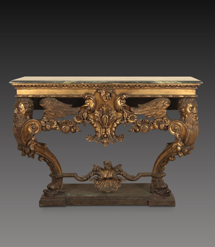 An impressive carved Italian console table in the early 18th century style, the green marble top with moulded edge above a bold carved base, with egg and dart moulded frieze and central cartouche, flanked by fruiting and foliate swags and supported on shapely winged Herm figures terminating in Godolphin feet, raised on a simulated marble plinth with further egg and dart carving. Circa 1900. A good quality table faithfully recreating the original models of table made in circa 1720. In good presentable condition, with no damage.