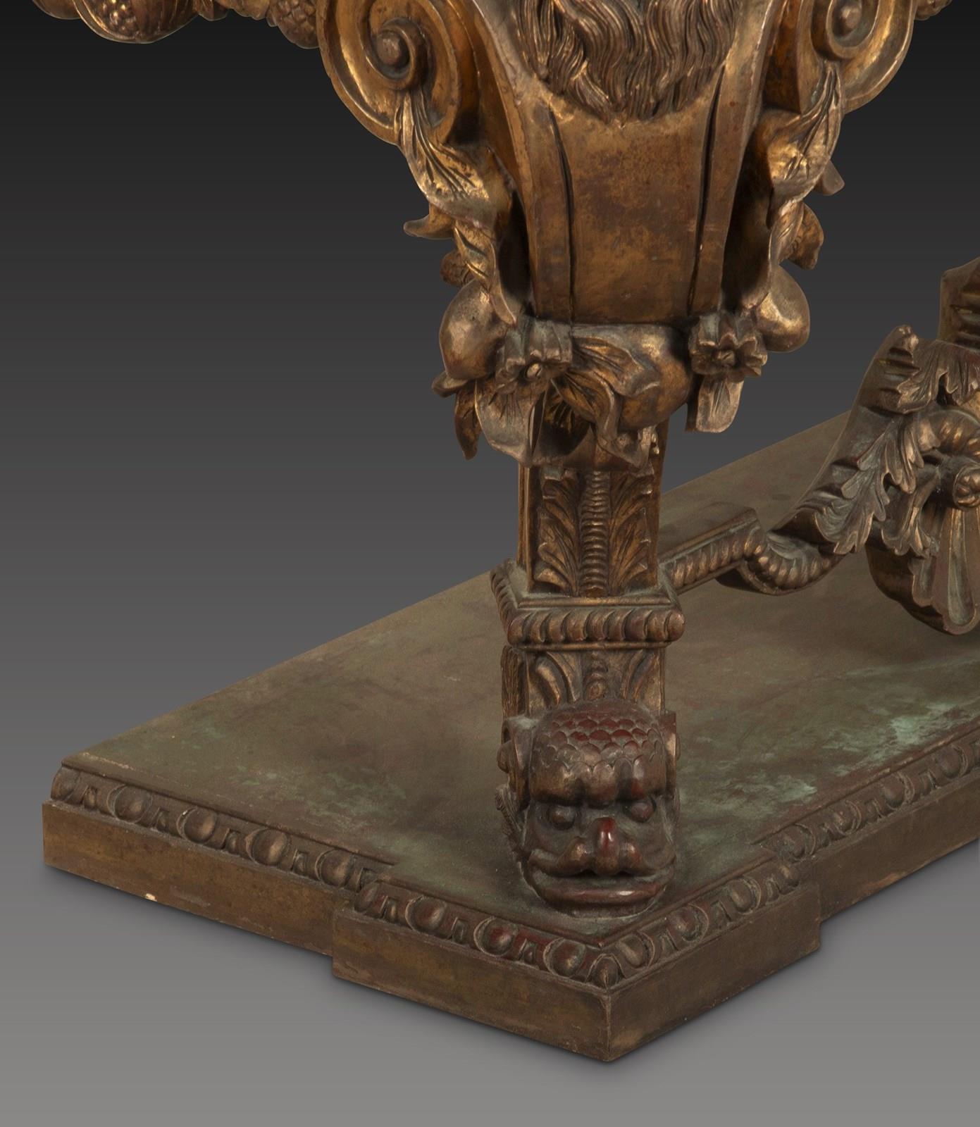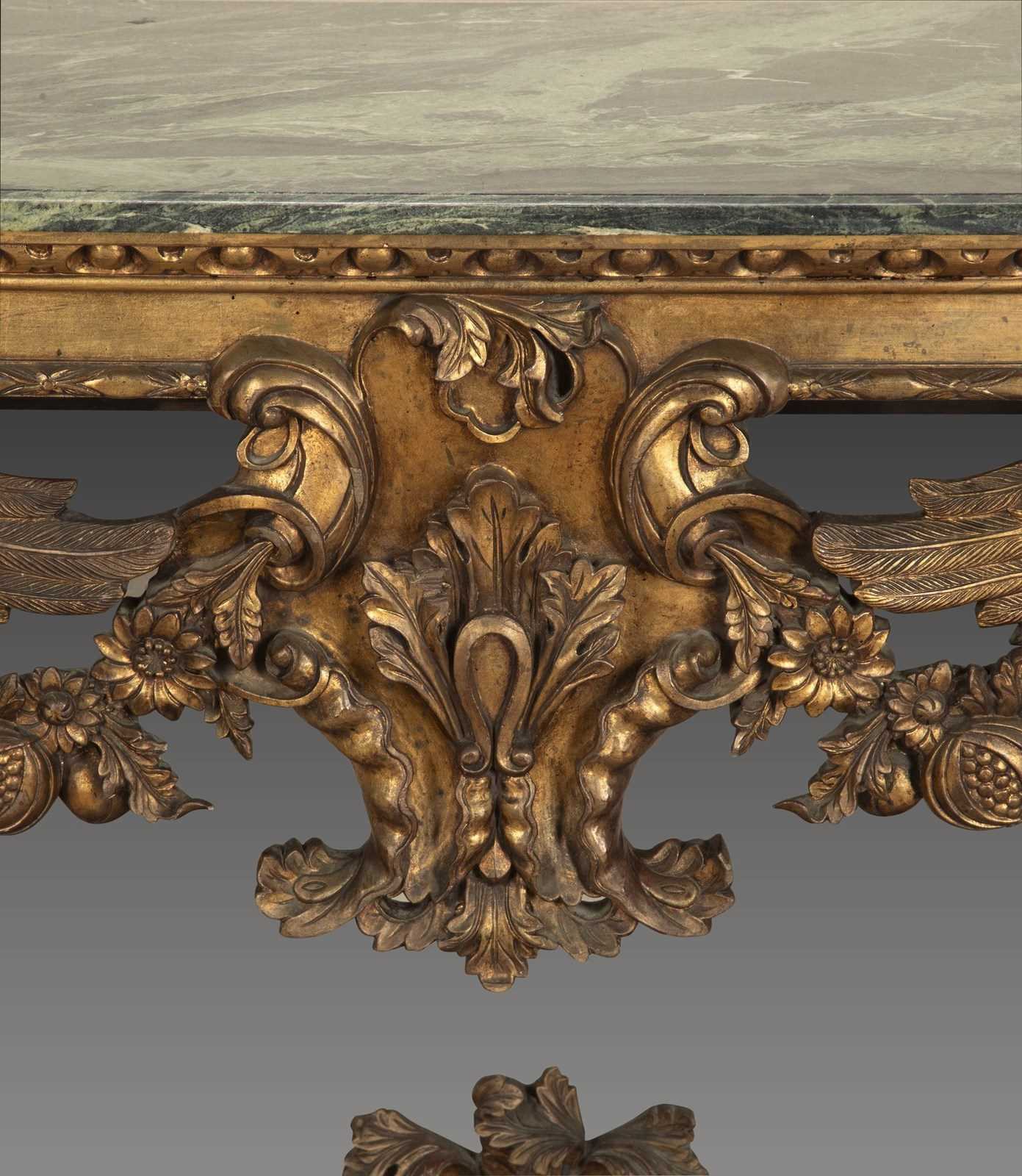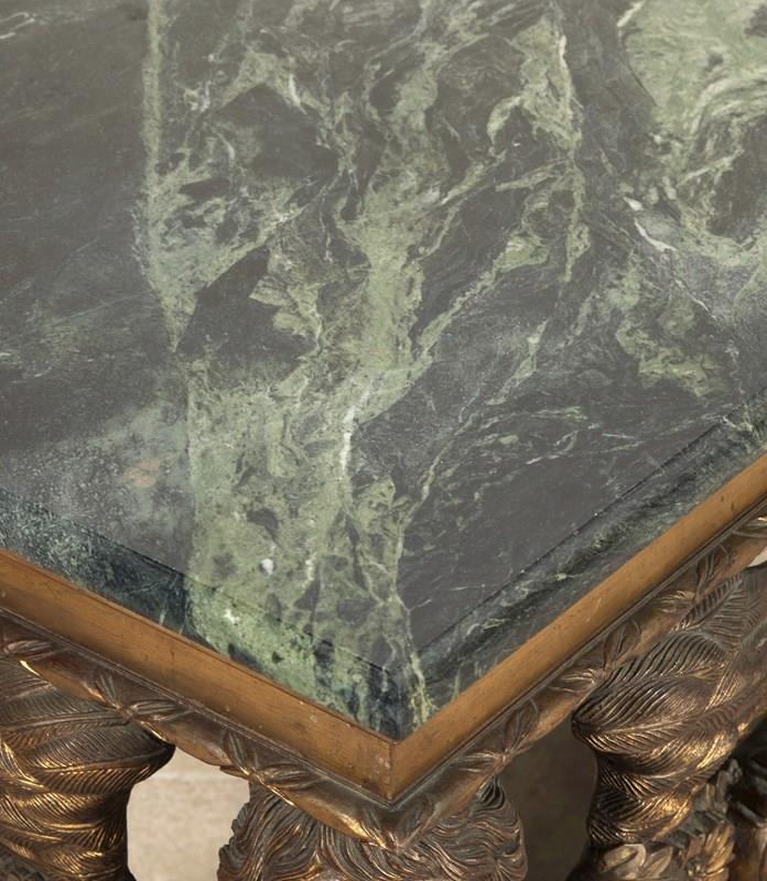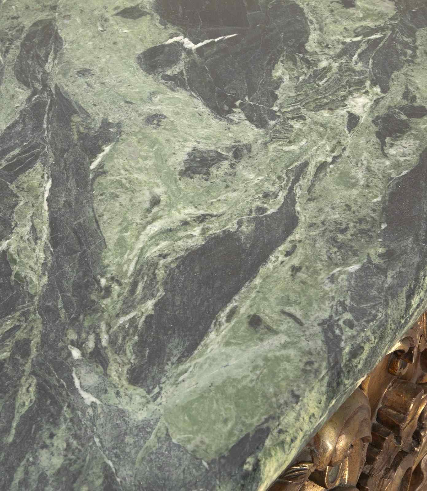An impressive carved Italian console table in the early 18th century style, the green marble top with moulded edge above a bold carved base, with egg and dart moulded frieze and central cartouche, flanked by fruiting and foliate swags and supported on shapely winged Herm figures terminating in Godolphin feet, raised on a simulated marble plinth with further egg and dart carving. Circa 1900. A good quality table faithfully recreating the original models of table made in circa 1720. In good presentable condition, with no damage.