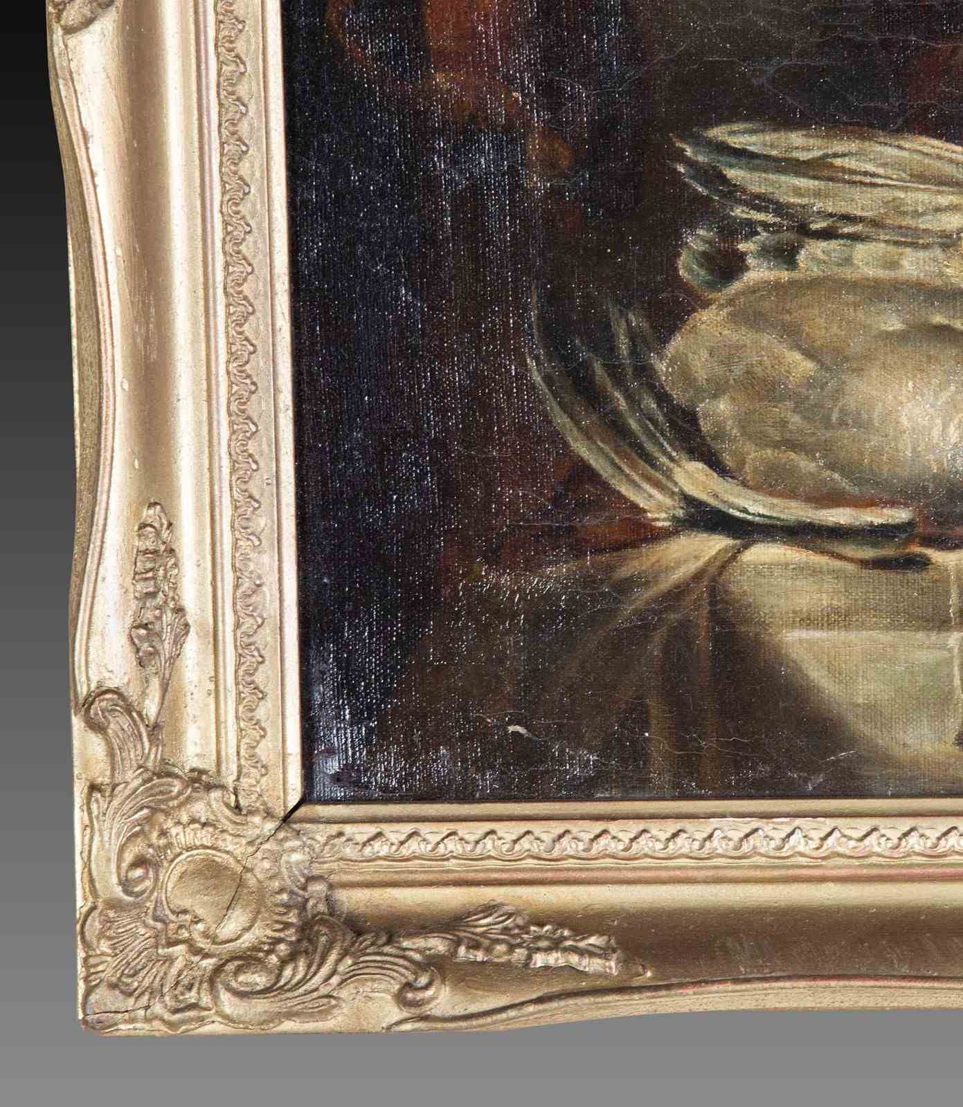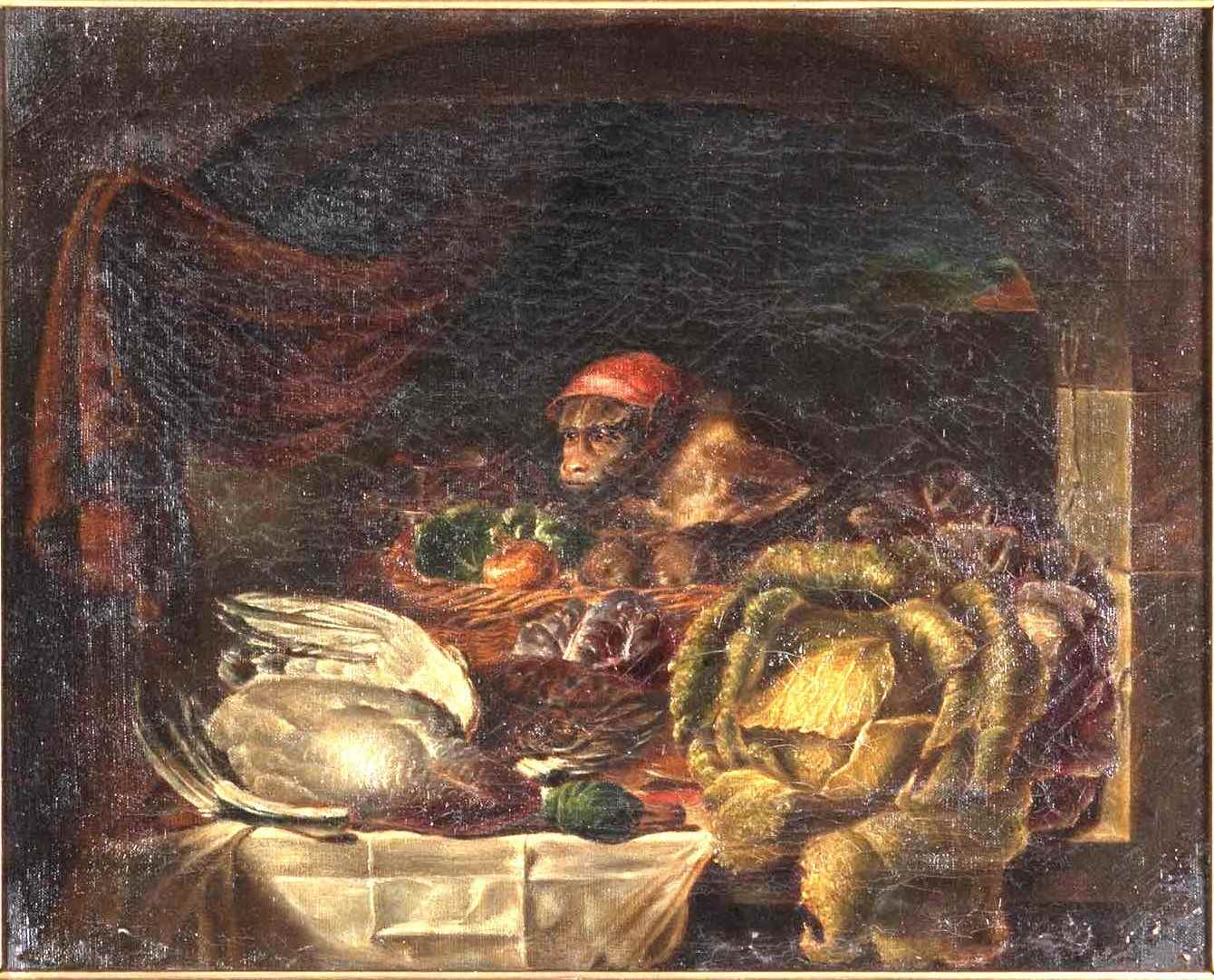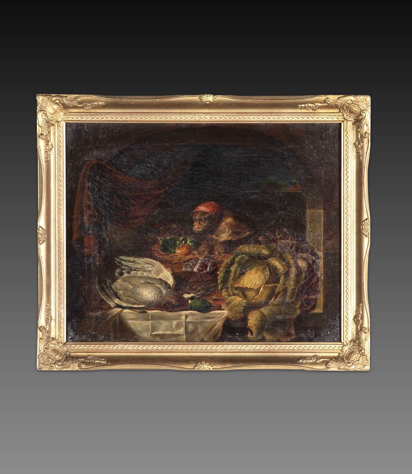 Depicting a monkey in a window setting, with a basket of fruit and vegetables and game. In a gilt frame, Circa 1850.