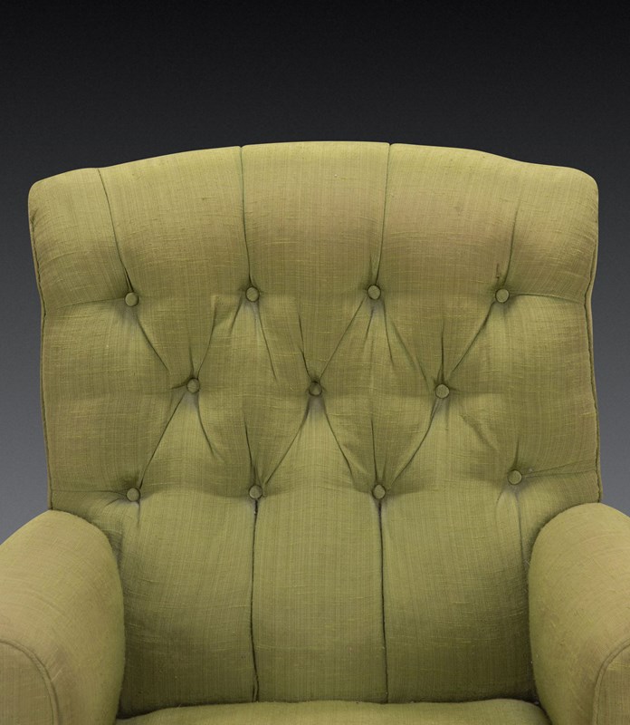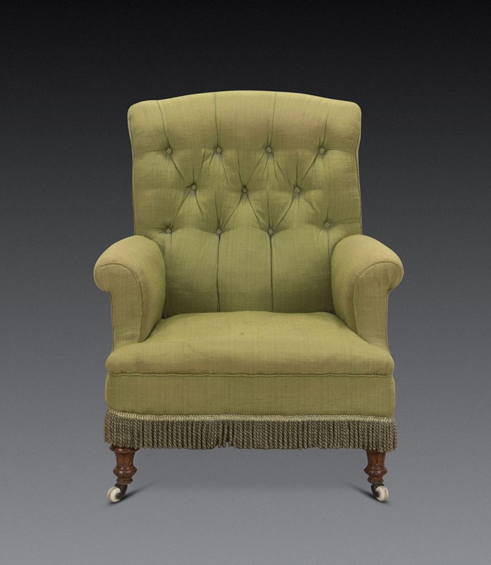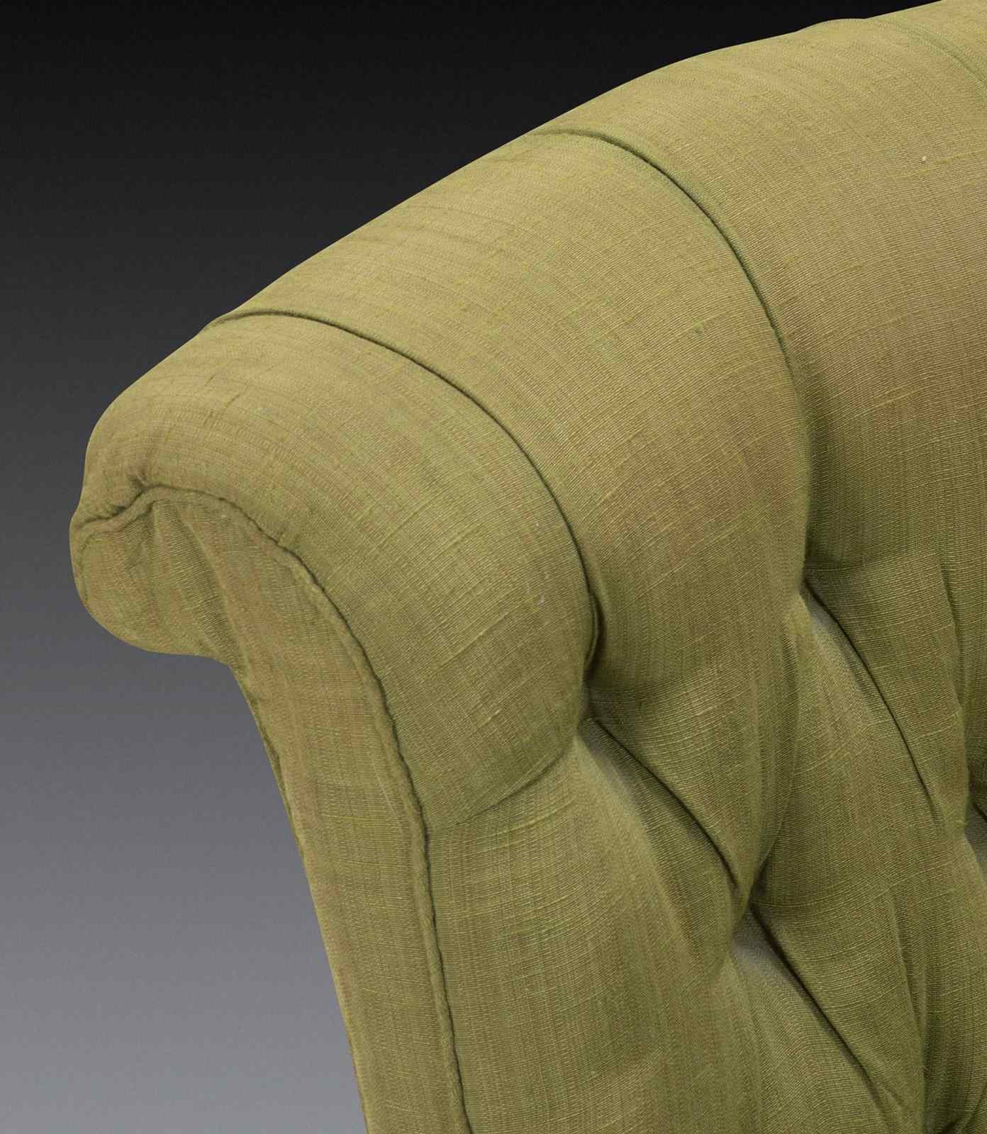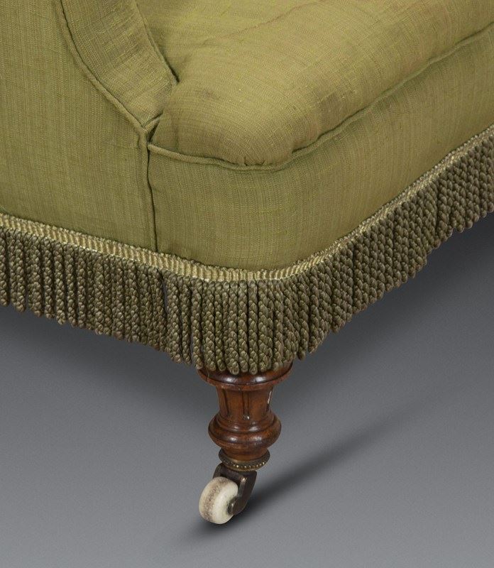 Neatly upholstered in brushed sage green linen fabric, with a buttoned back. Raised on turned and fluted walnut legs with original castors, behind woven tassels.