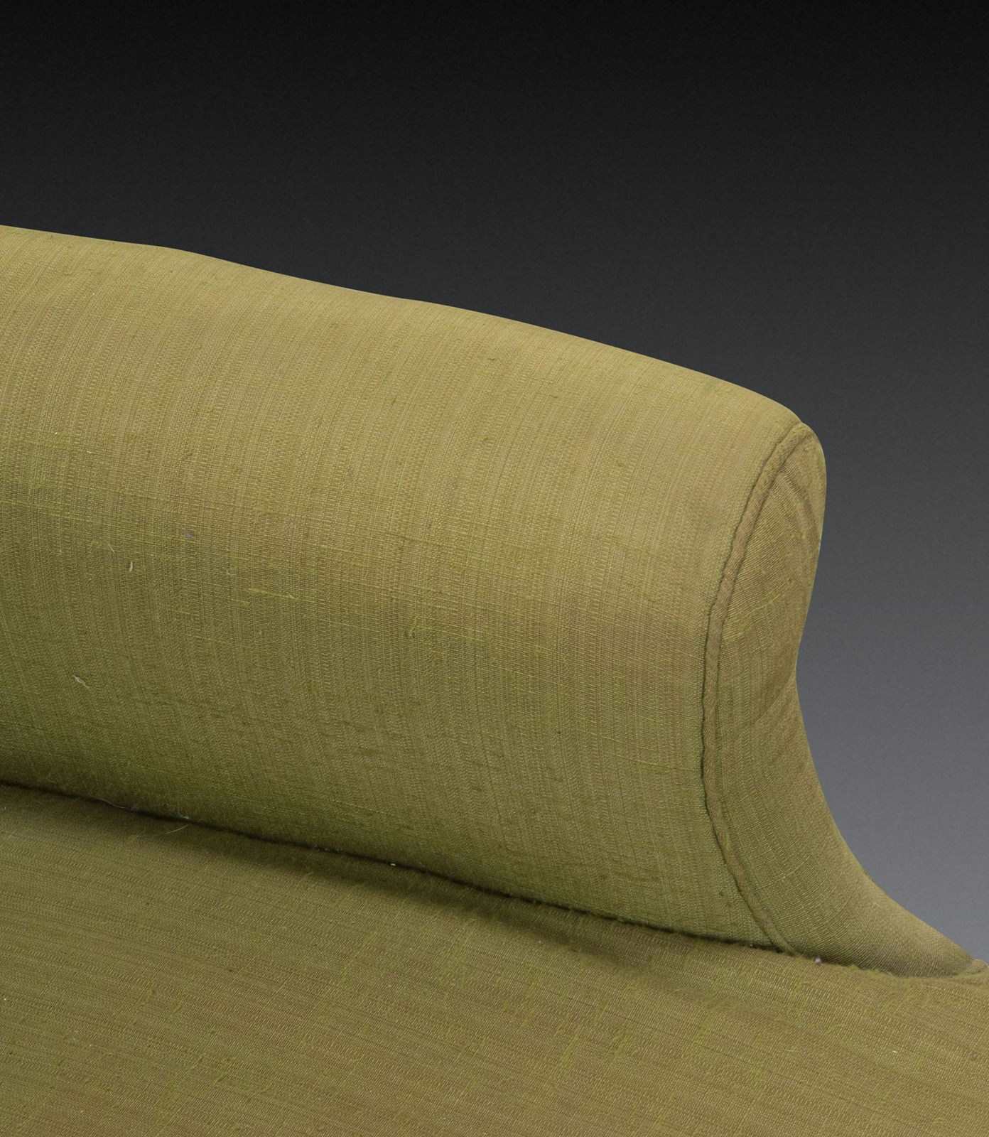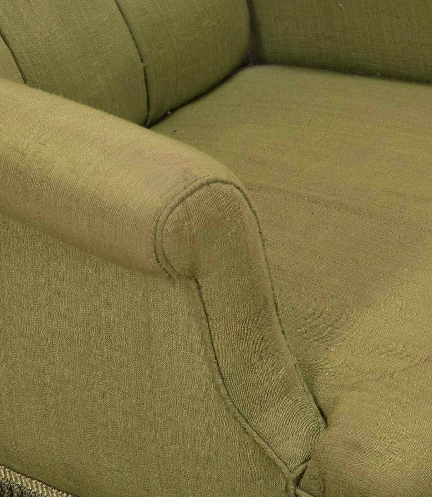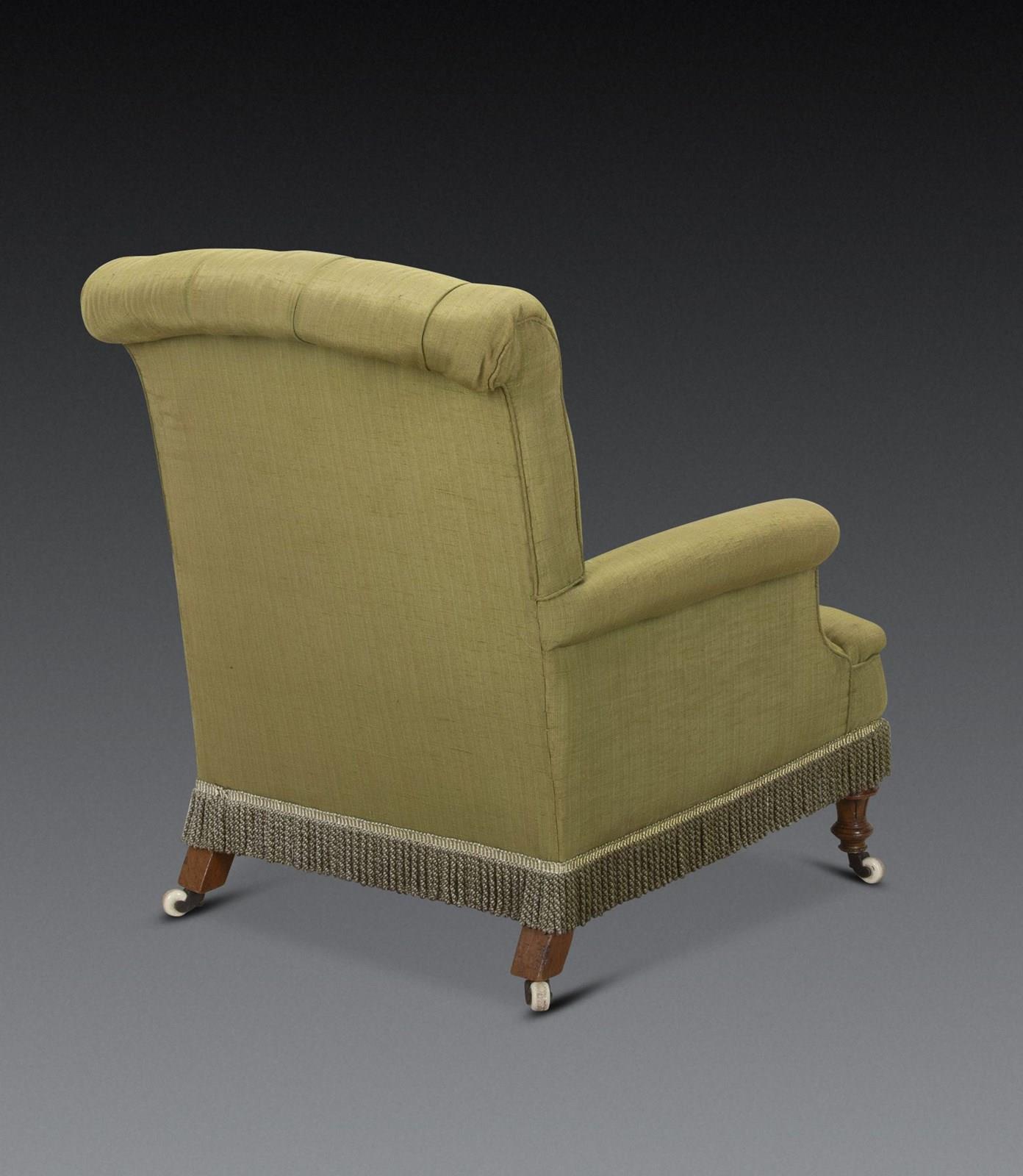Neatly upholstered in brushed sage green linen fabric, with a buttoned back. Raised on turned and fluted walnut legs with original castors, behind woven tassels.