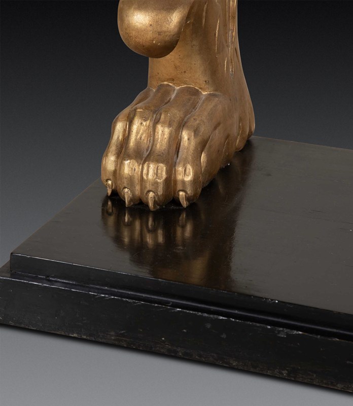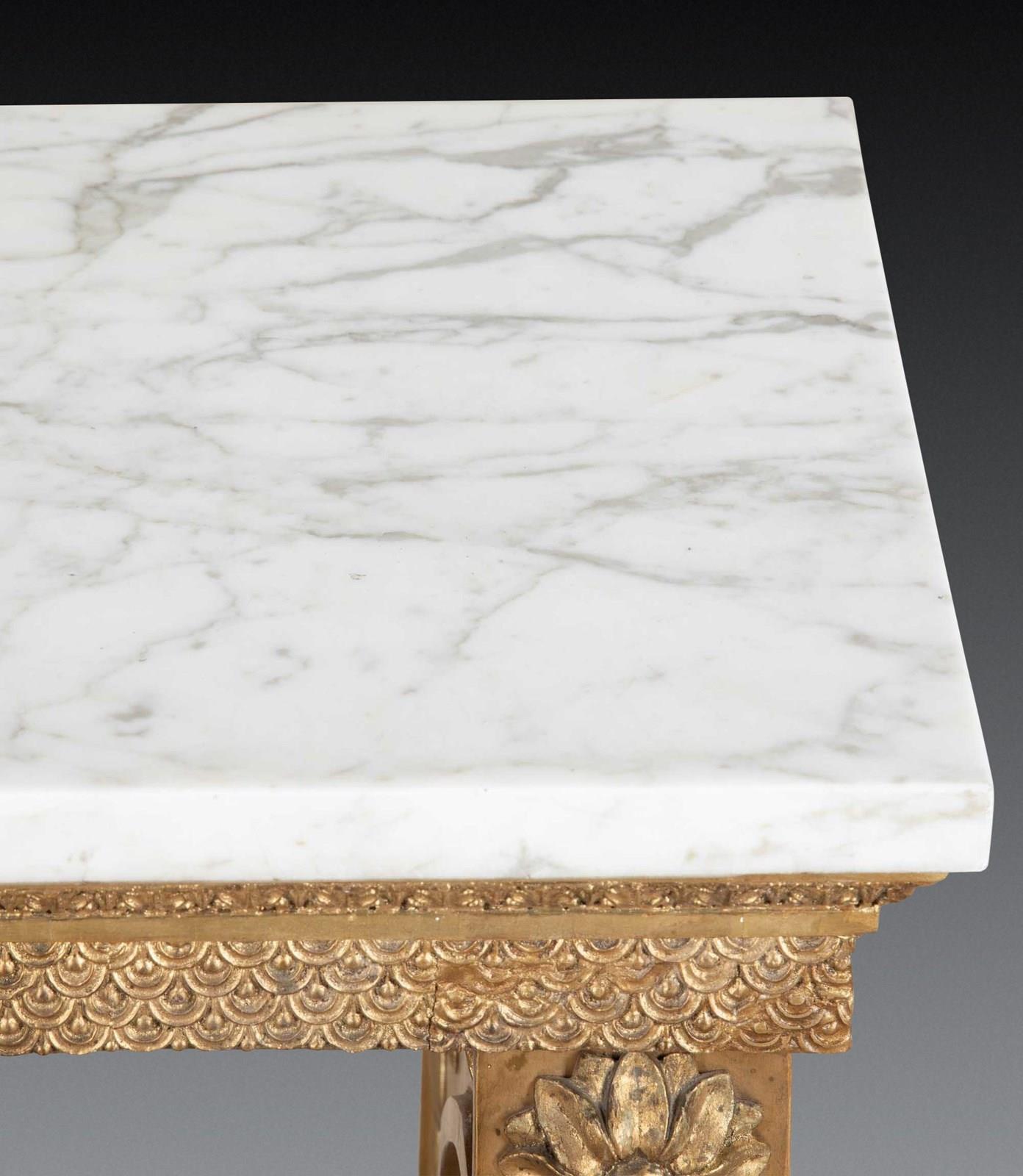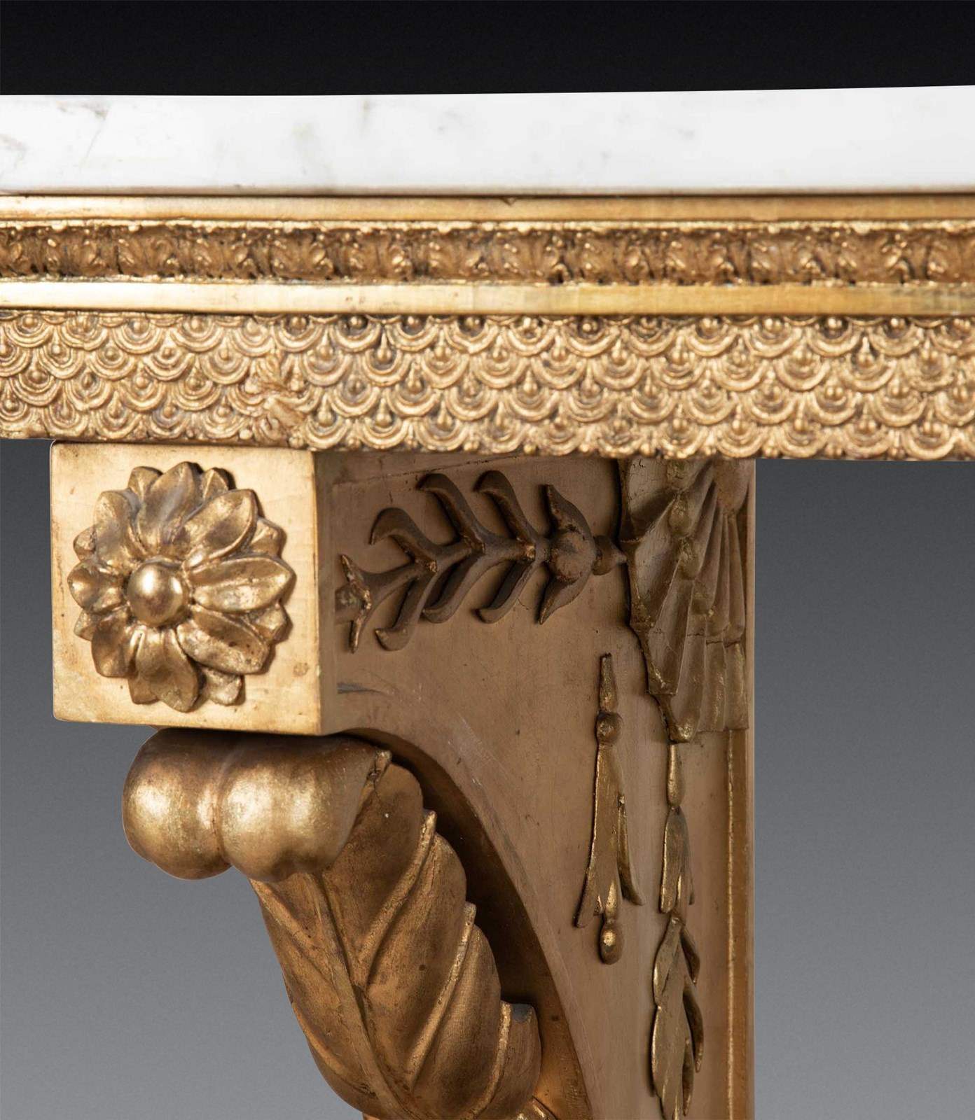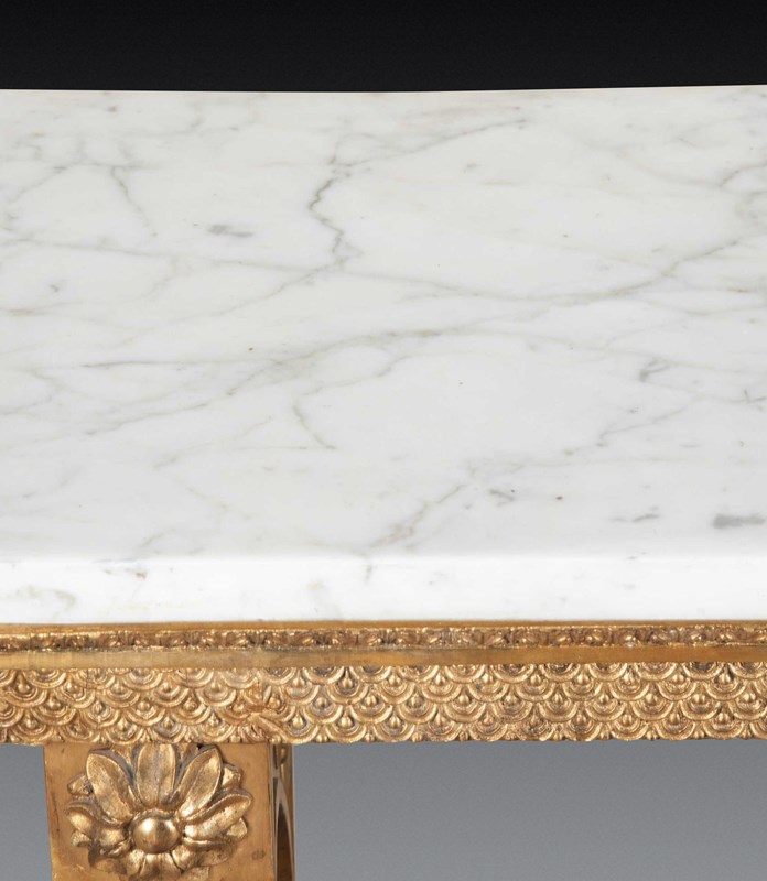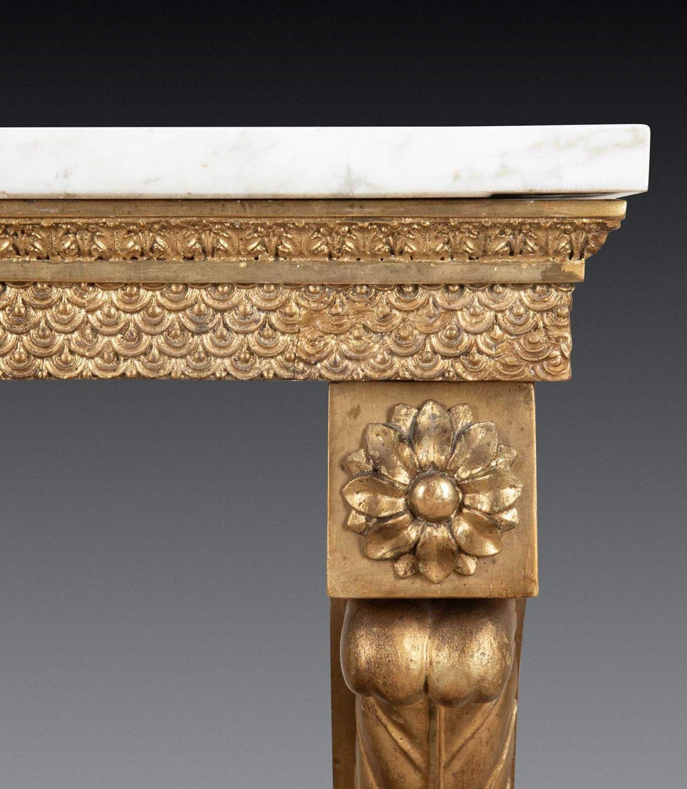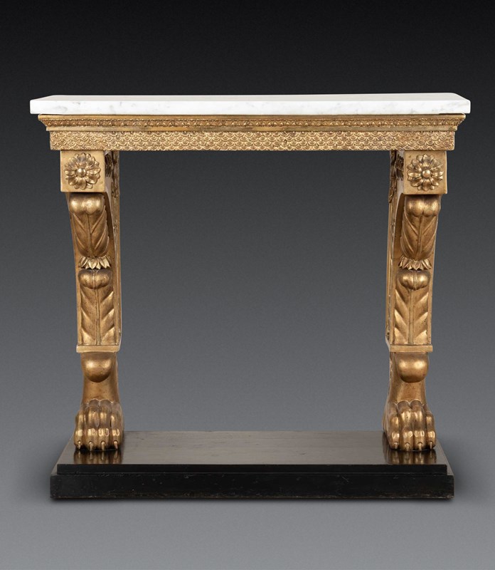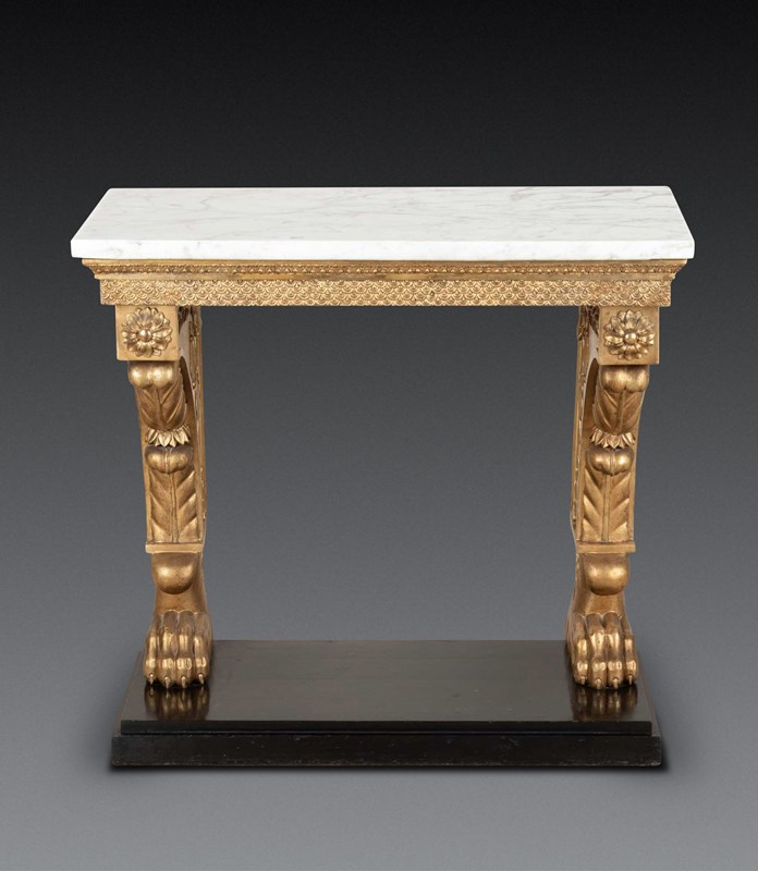 A stylish Early C19th Swedish console table, the original Carrara marble top above a giltwood base with carved acanthus and fish scale frieze, raised twin monopodium supports with central rosettes and scroll corbels with decorative carvings to the sides, terminating in bold lion paw feet, resting on an ebonised plinth base. Stands with a strong bold presence and classical design. In good original condition with no breaks or repairs. Circa 1820.