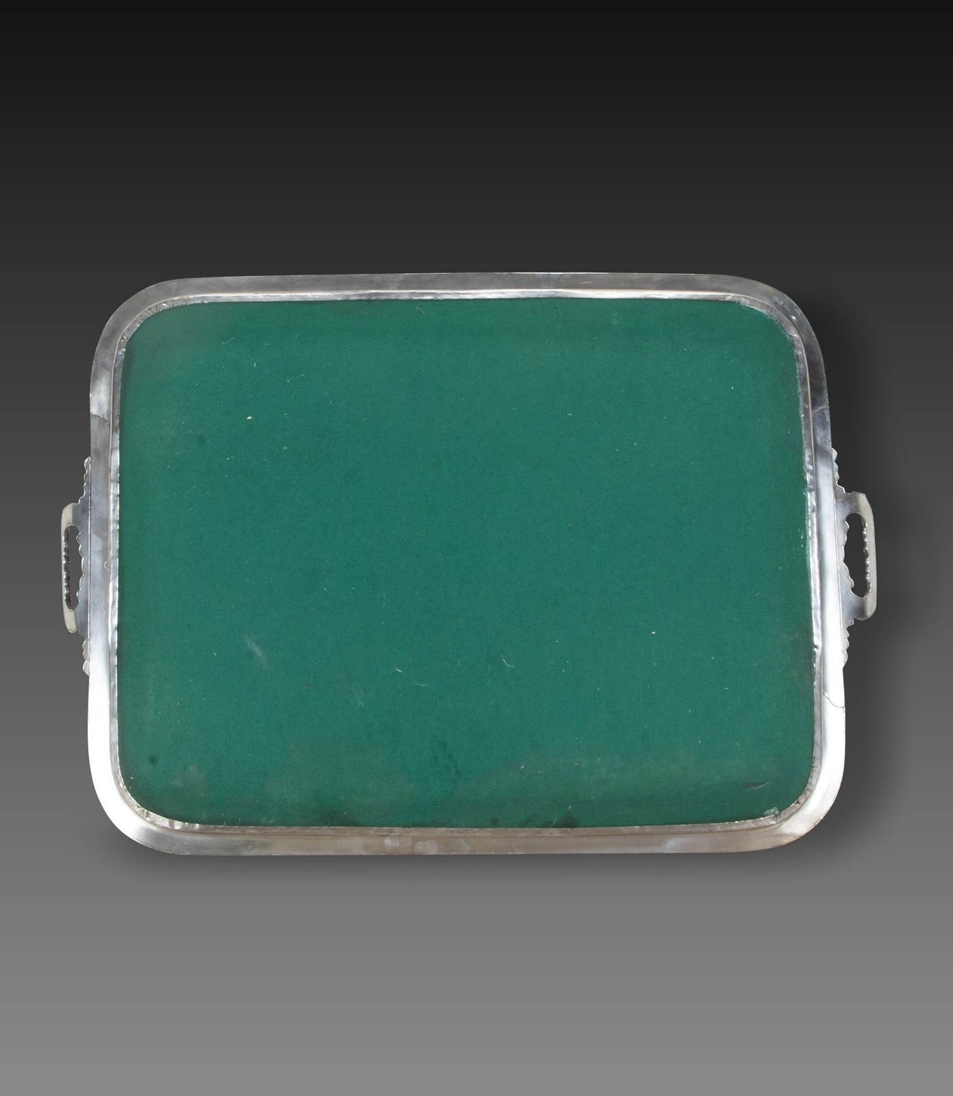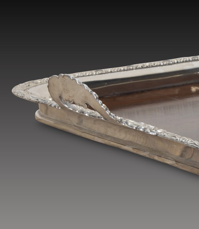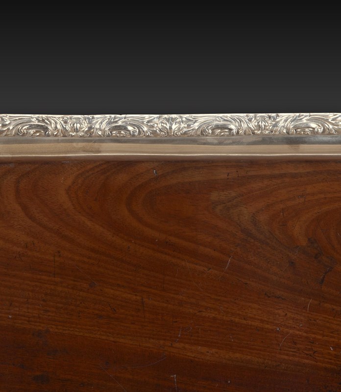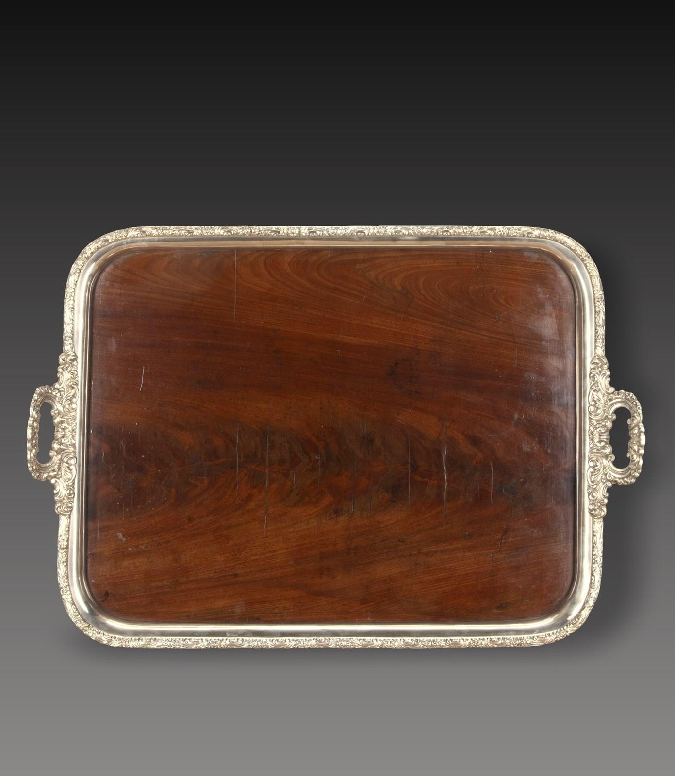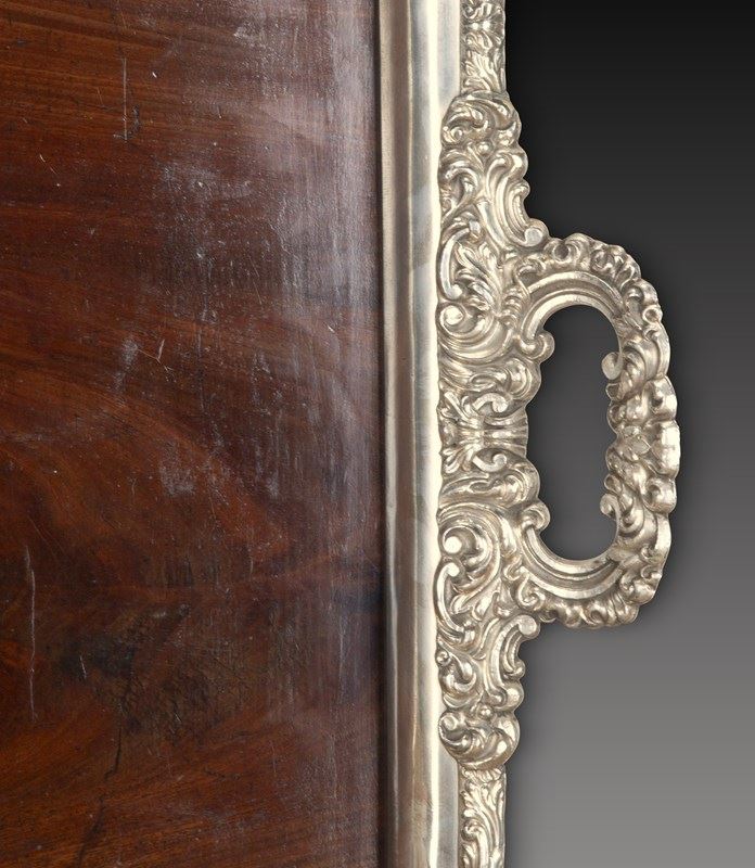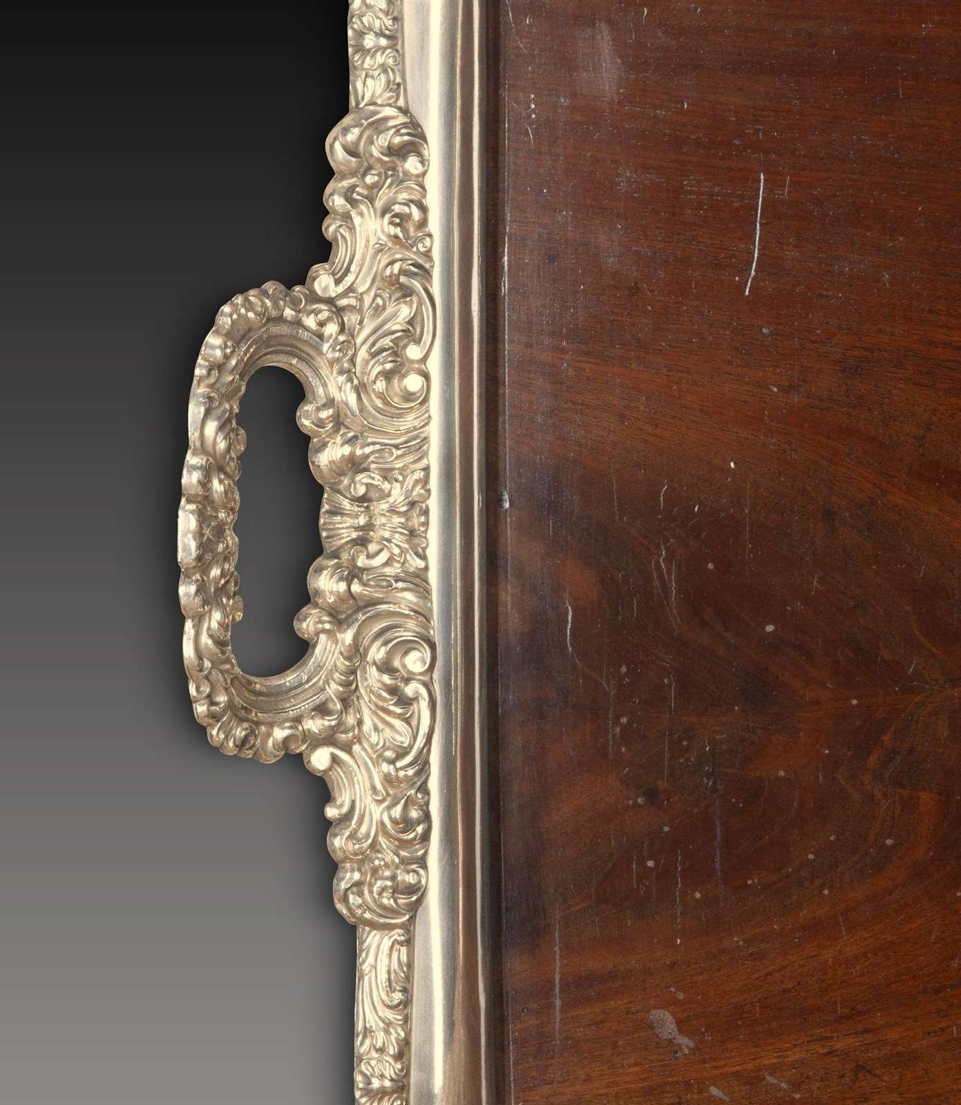 Large late 19th Century French butler's tray, composed of an exceptional silver plated border of Rococo design with a pair of bold carrying handles, centred with a superb piece of flame mahogany with excellent colour and surface. Baize lined to the underside for resting on furniture. In good original condition. Circa 1880.
