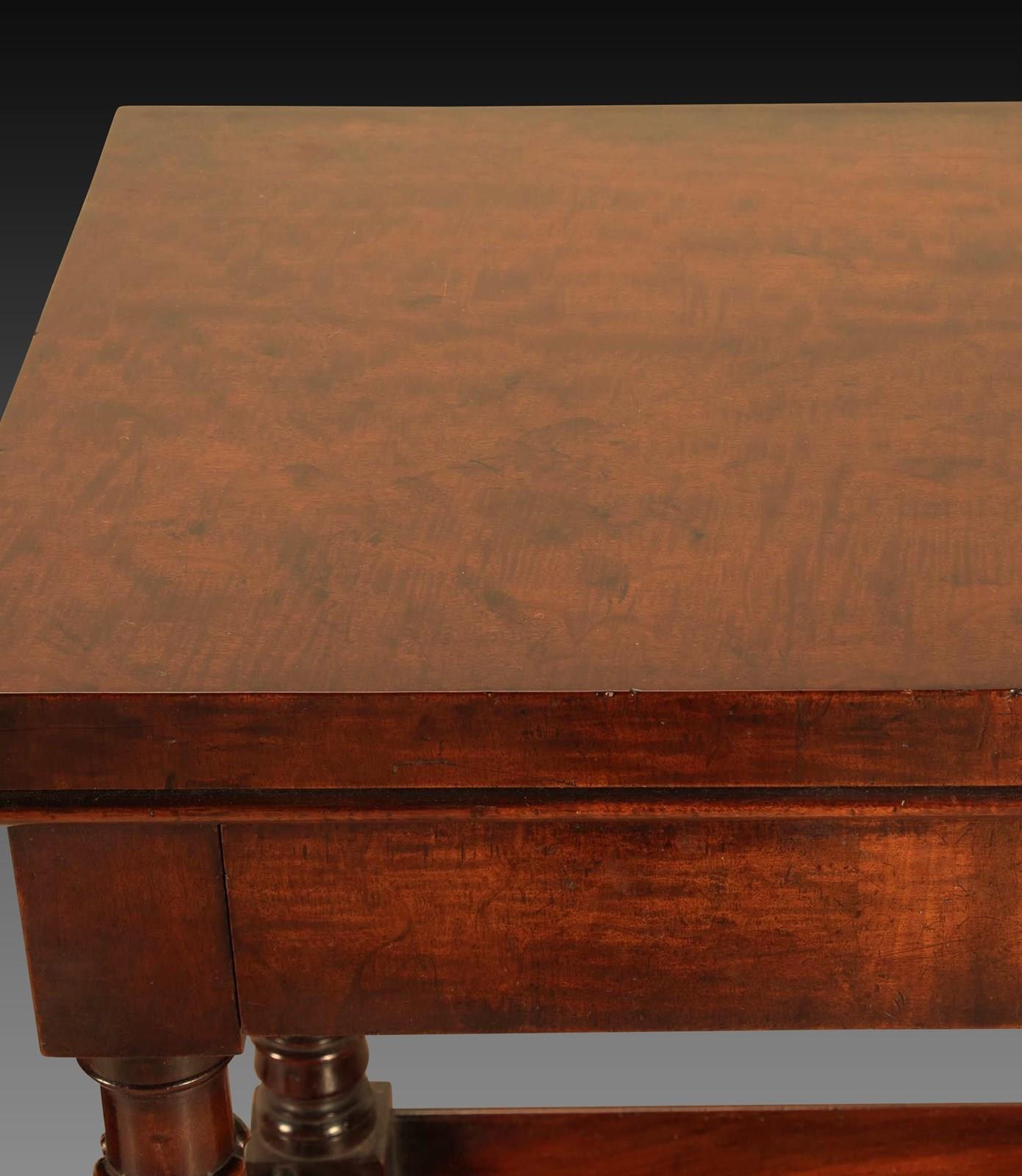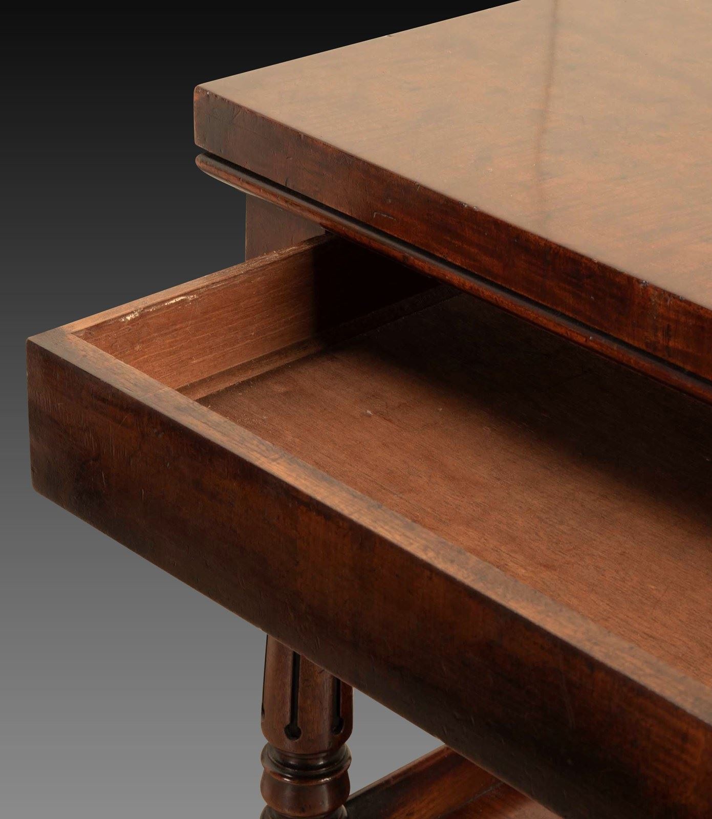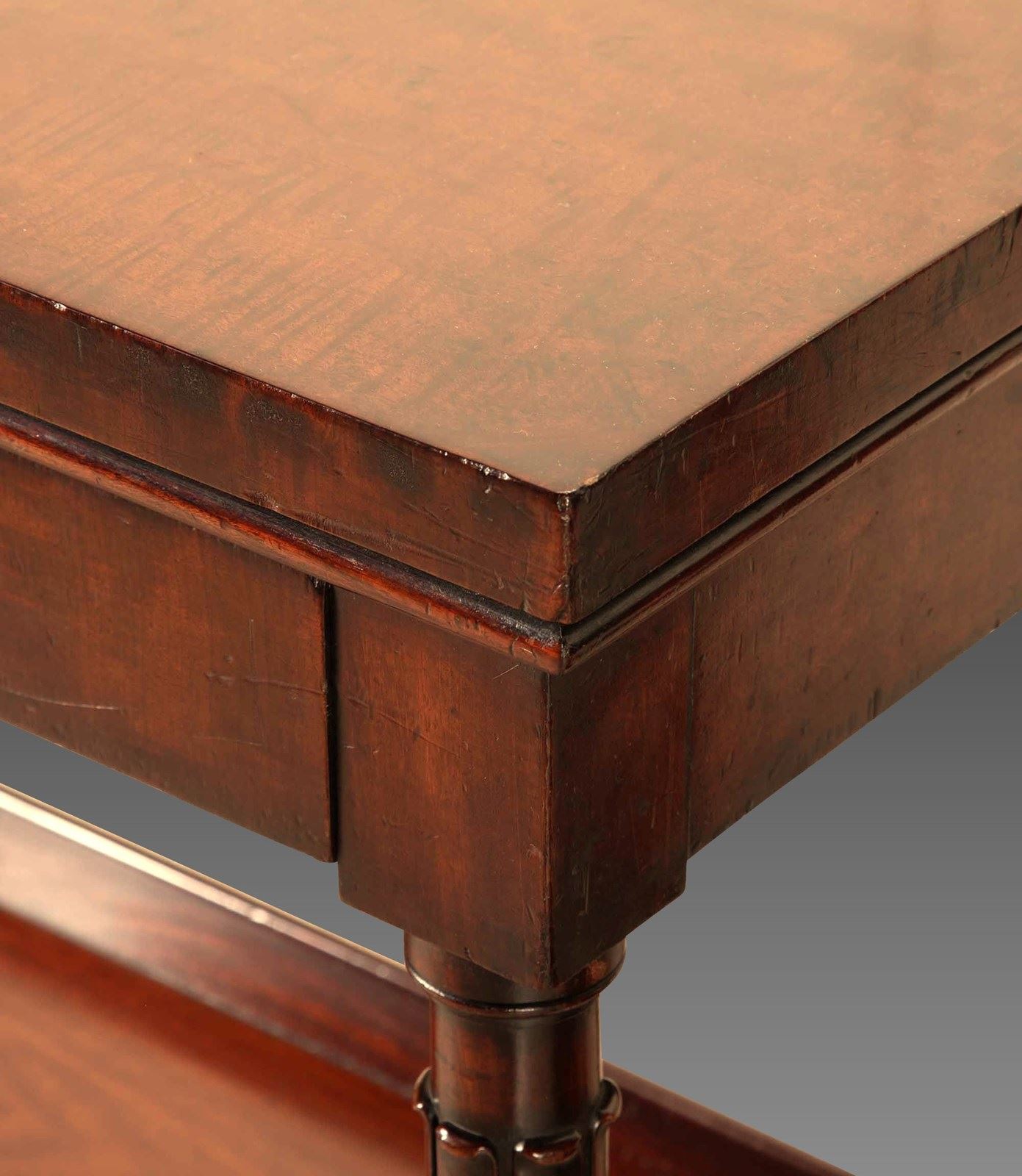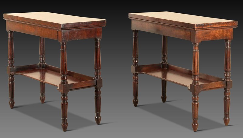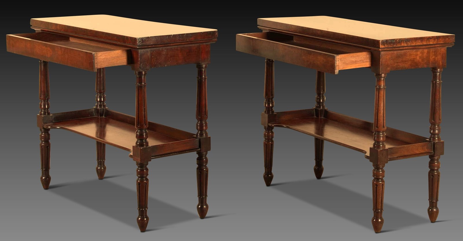 A smart pair of 19th Century Mahogany Console Tables, the slab tops with underside moulds and frieze drawers, raised on tapering moulded legs with and shaped undertiers. Good colour, timber and condition. Circa 1835.