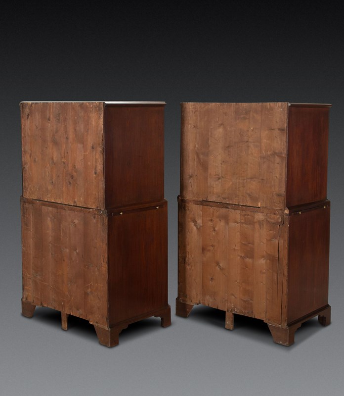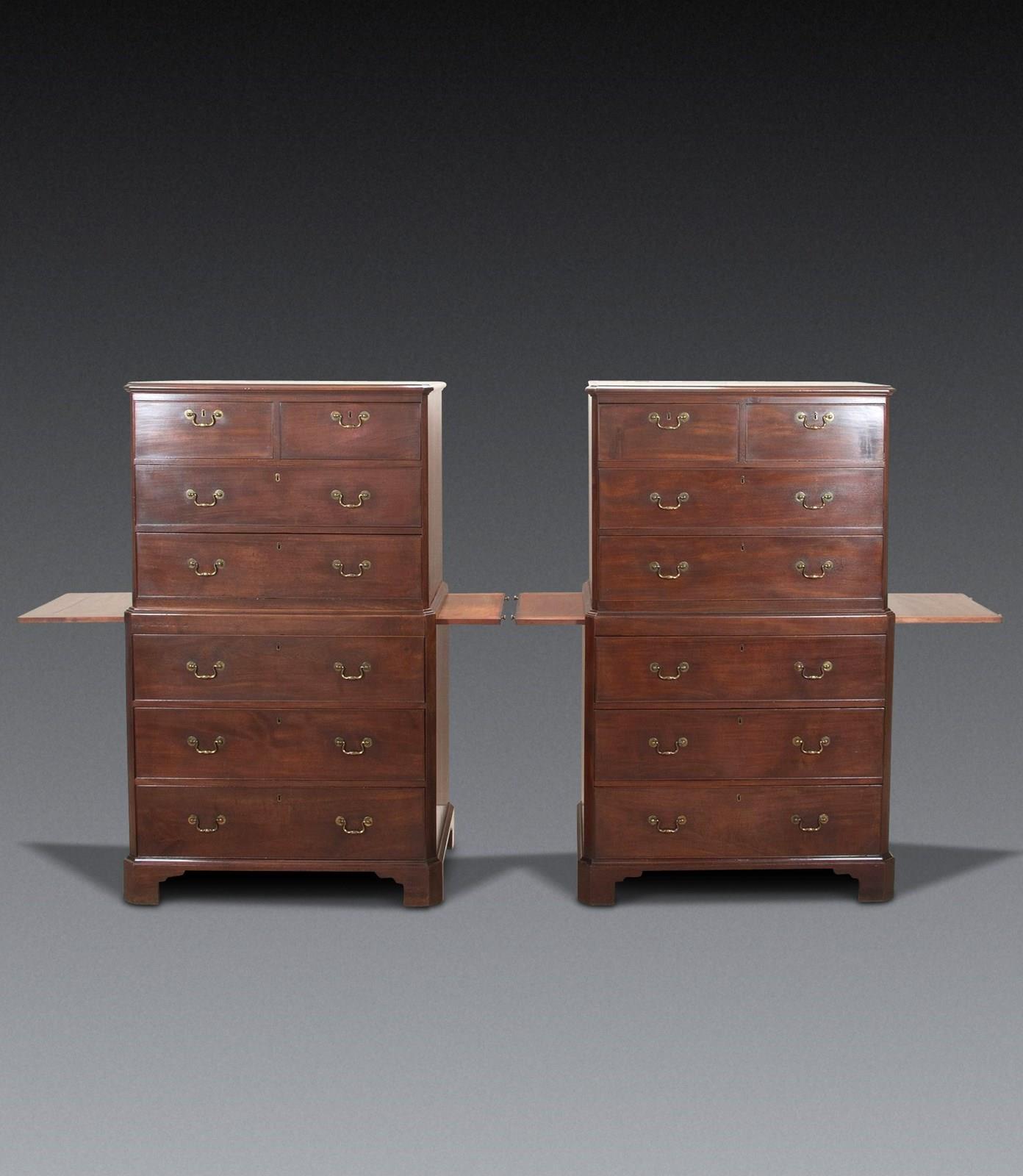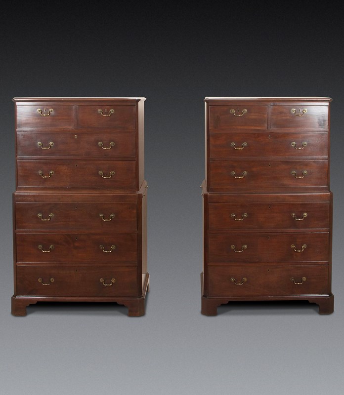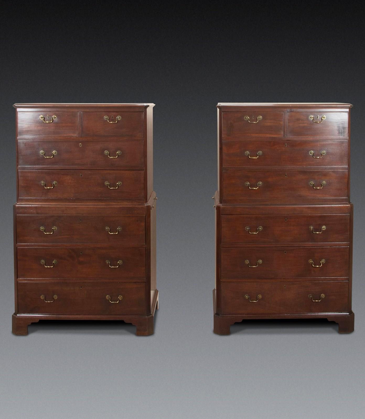 A one off pair of Geo II mahogany chest on chests of compact size, the flat tops with moulded edges and canted corners running full height of the chests, the fronts with sets of graduating drawers still retaining all their original brass penny back plate and swan neck handles, with broad waist moulds to house pull out slides enclosed to the sides, and all raised on their original bracket feet. A rare article of furniture in super untouched condition and colour. Almost certainly by one of St Paul’s Churchyard cabinet makers, known for producing quality items of the era. Circa 1750. 39” wide x 65.5” high x 25” deep.