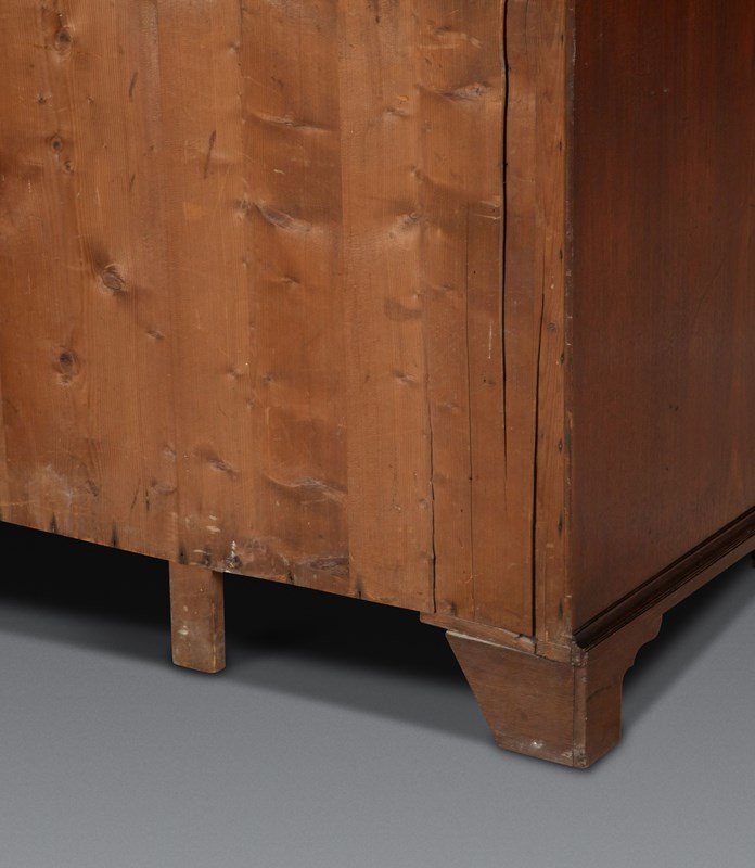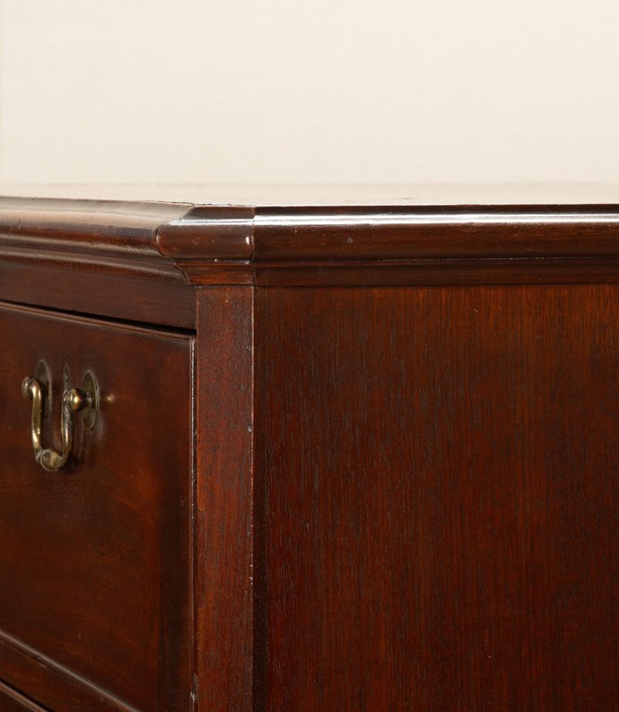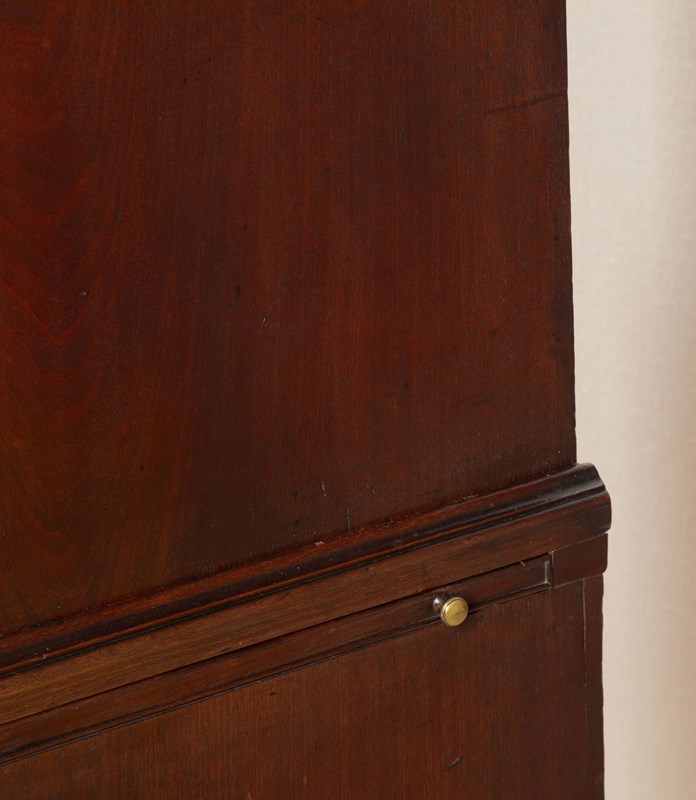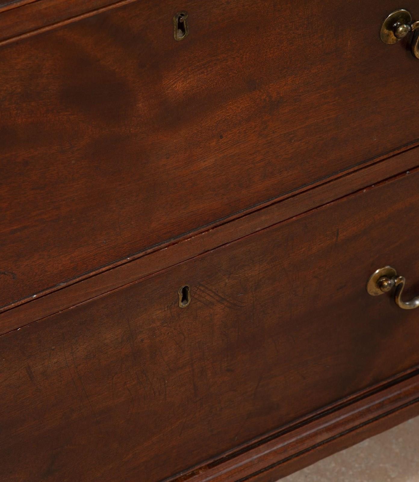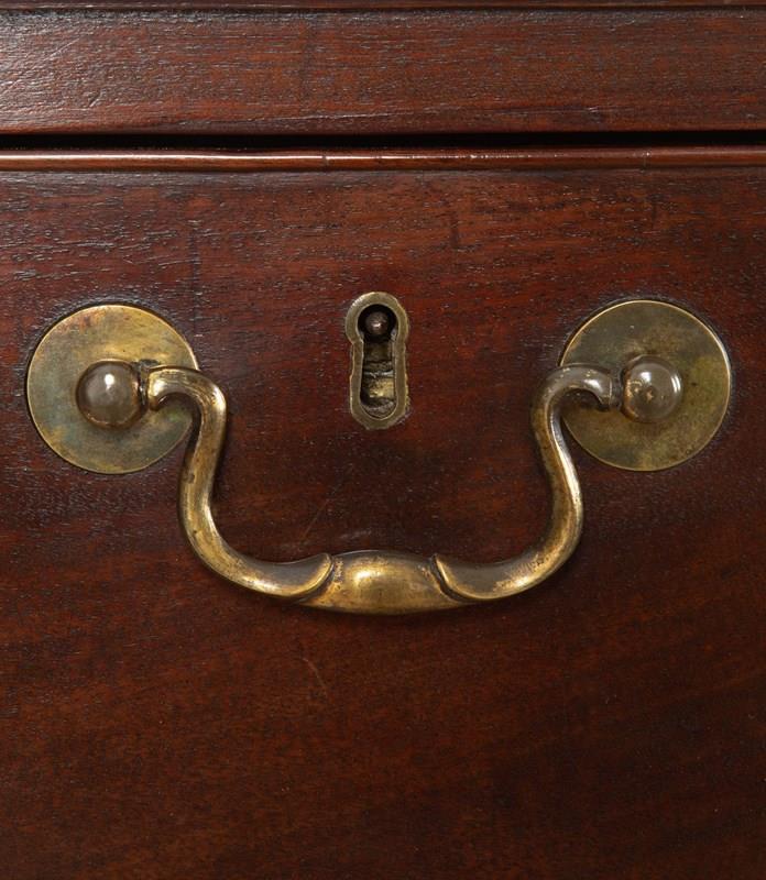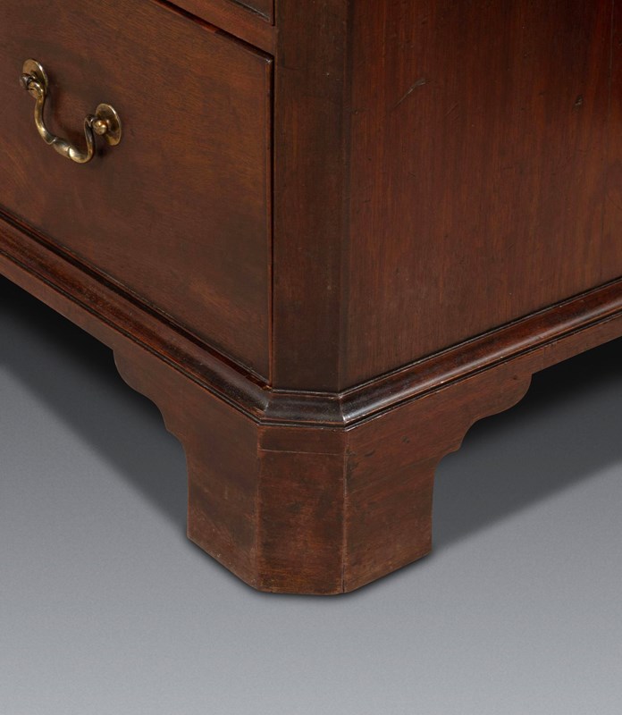 A one off pair of Geo II mahogany chest on chests of compact size, the flat tops with moulded edges and canted corners running full height of the chests, the fronts with sets of graduating drawers still retaining all their original brass penny back plate and swan neck handles, with broad waist moulds to house pull out slides enclosed to the sides, and all raised on their original bracket feet. A rare article of furniture in super untouched condition and colour. Almost certainly by one of St Paul’s Churchyard cabinet makers, known for producing quality items of the era. Circa 1750. 39” wide x 65.5” high x 25” deep.
