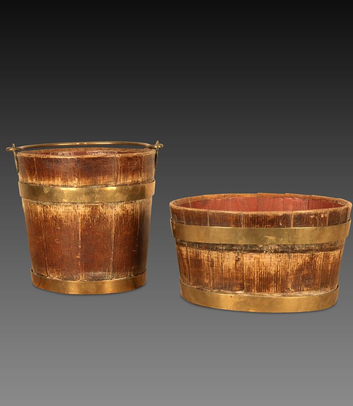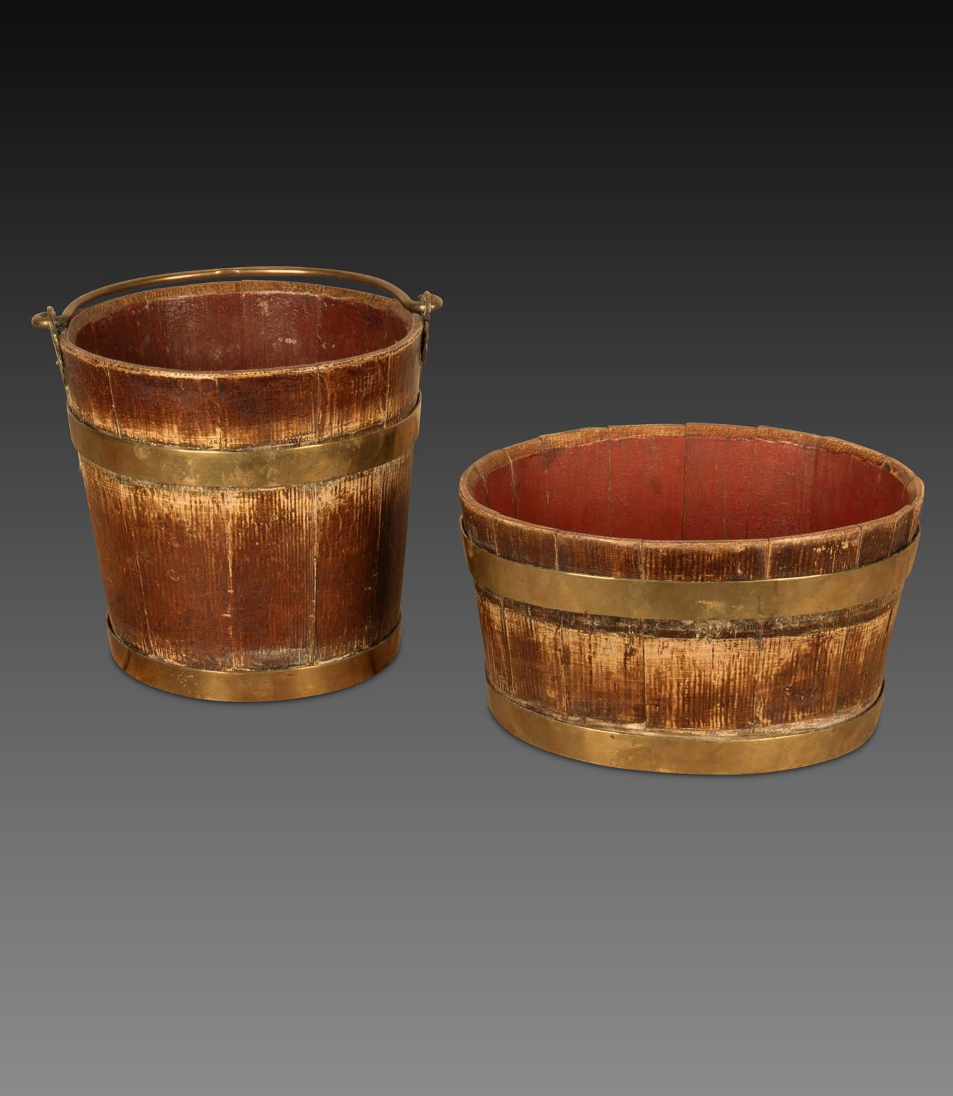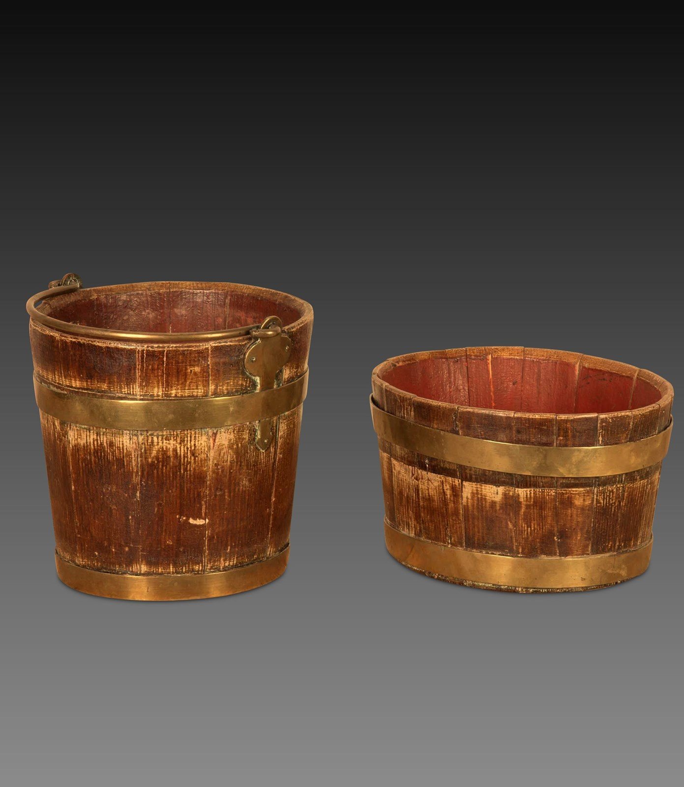 A duo of early C19th coopered buckets, of tapering form, one circular, one oval, both finished in the original grained decoration and red interiors, with brass bands and brass swing handle. Circa 1830. In good condition.