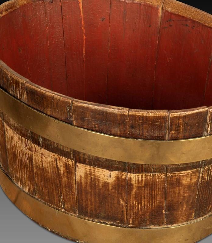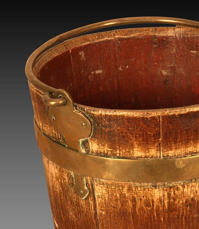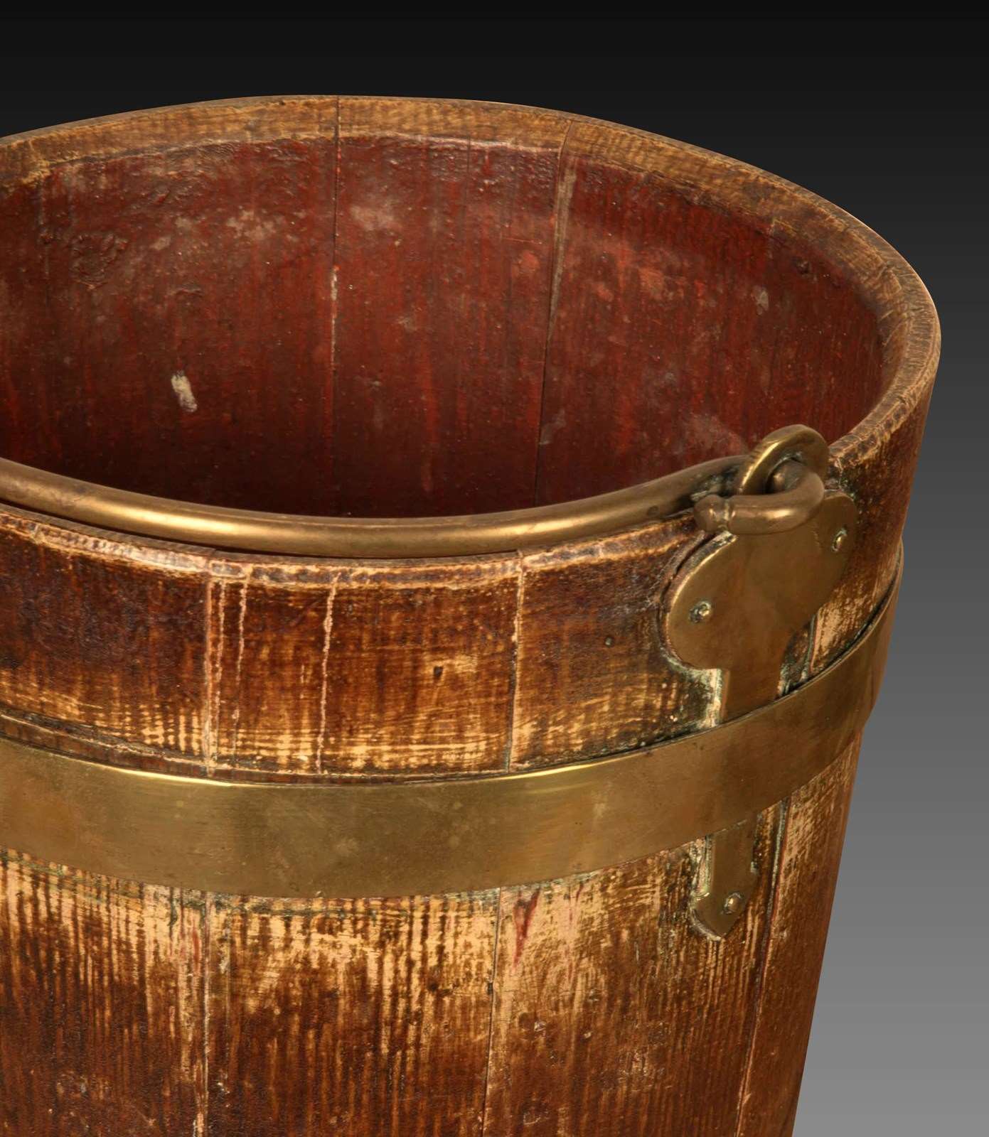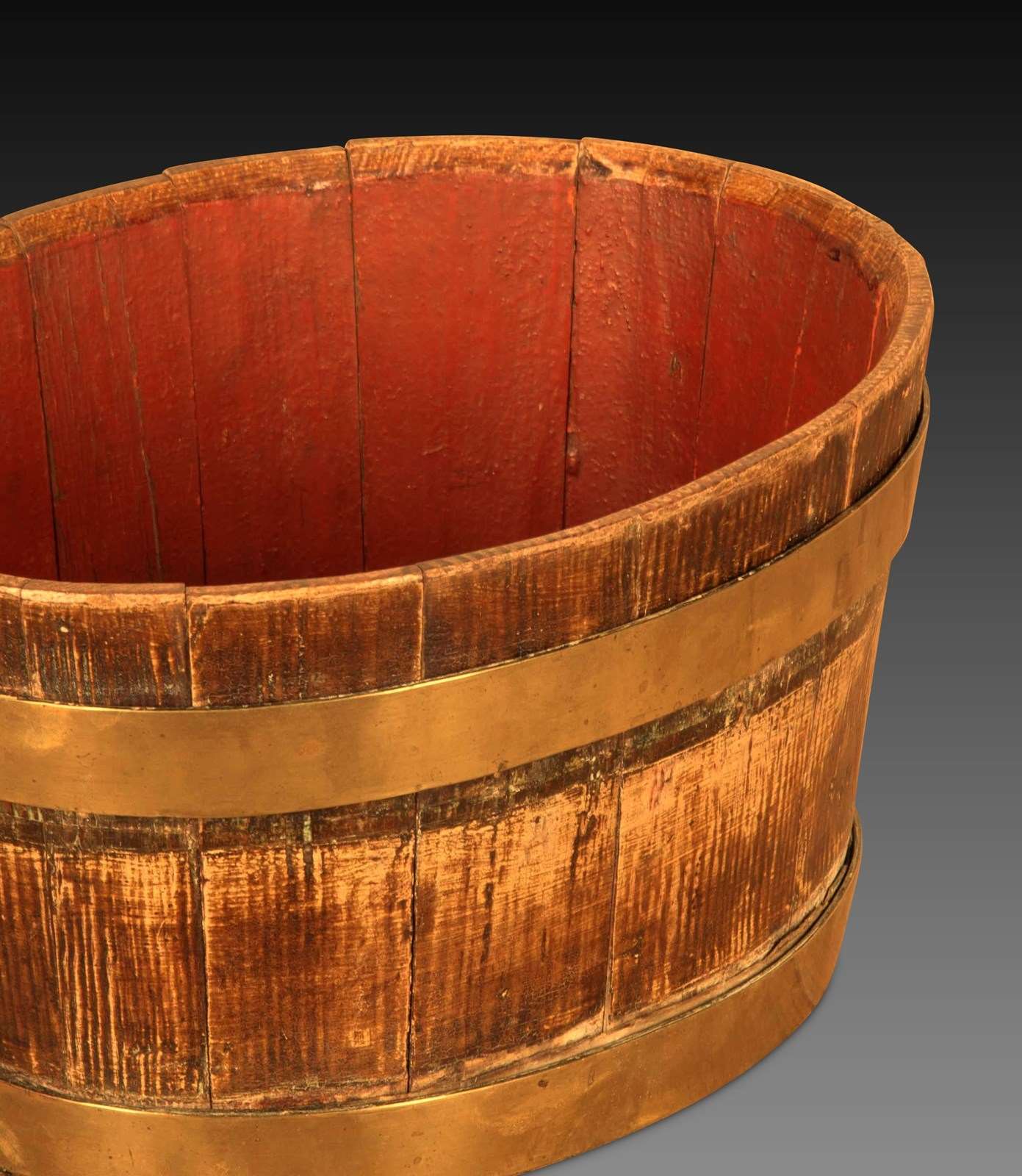 A duo of early C19th coopered buckets, of tapering form, one circular, one oval, both finished in the original grained decoration and red interiors, with brass bands and brass swing handle. Circa 1830. In good condition.