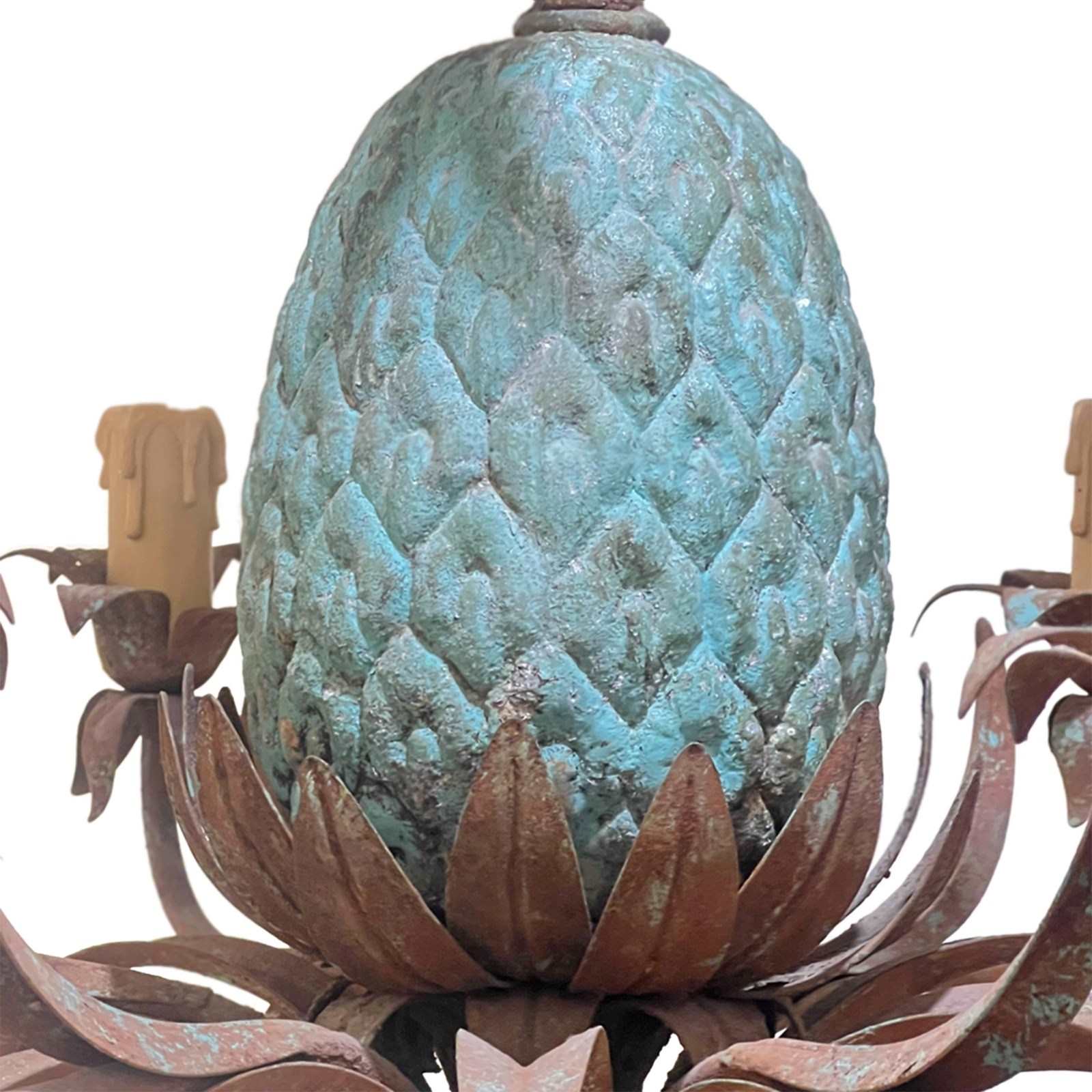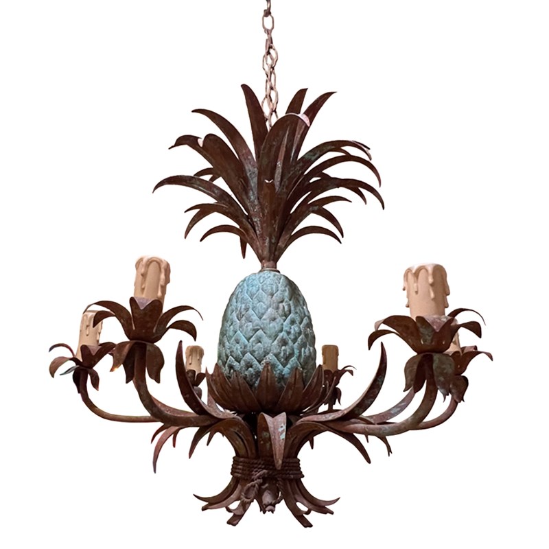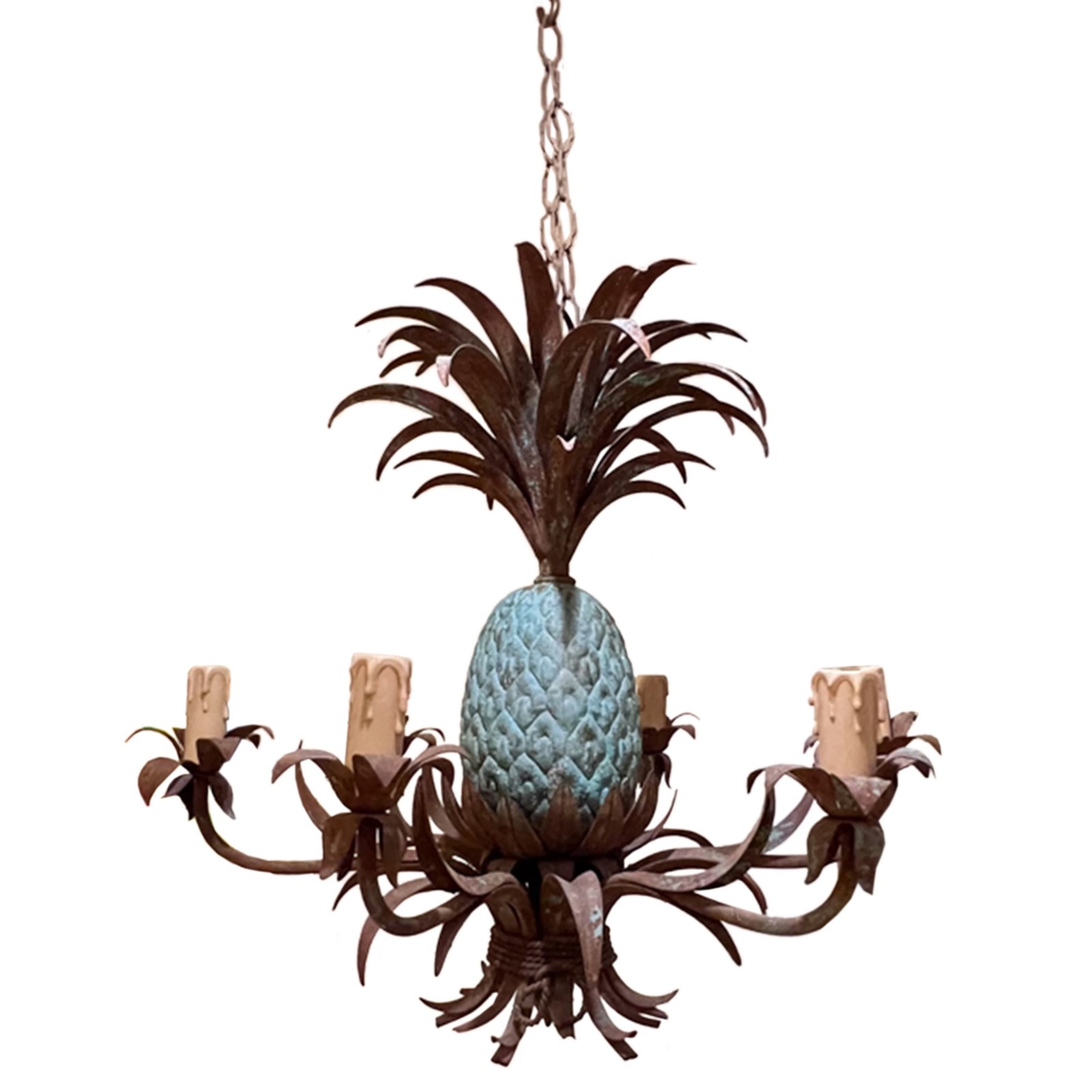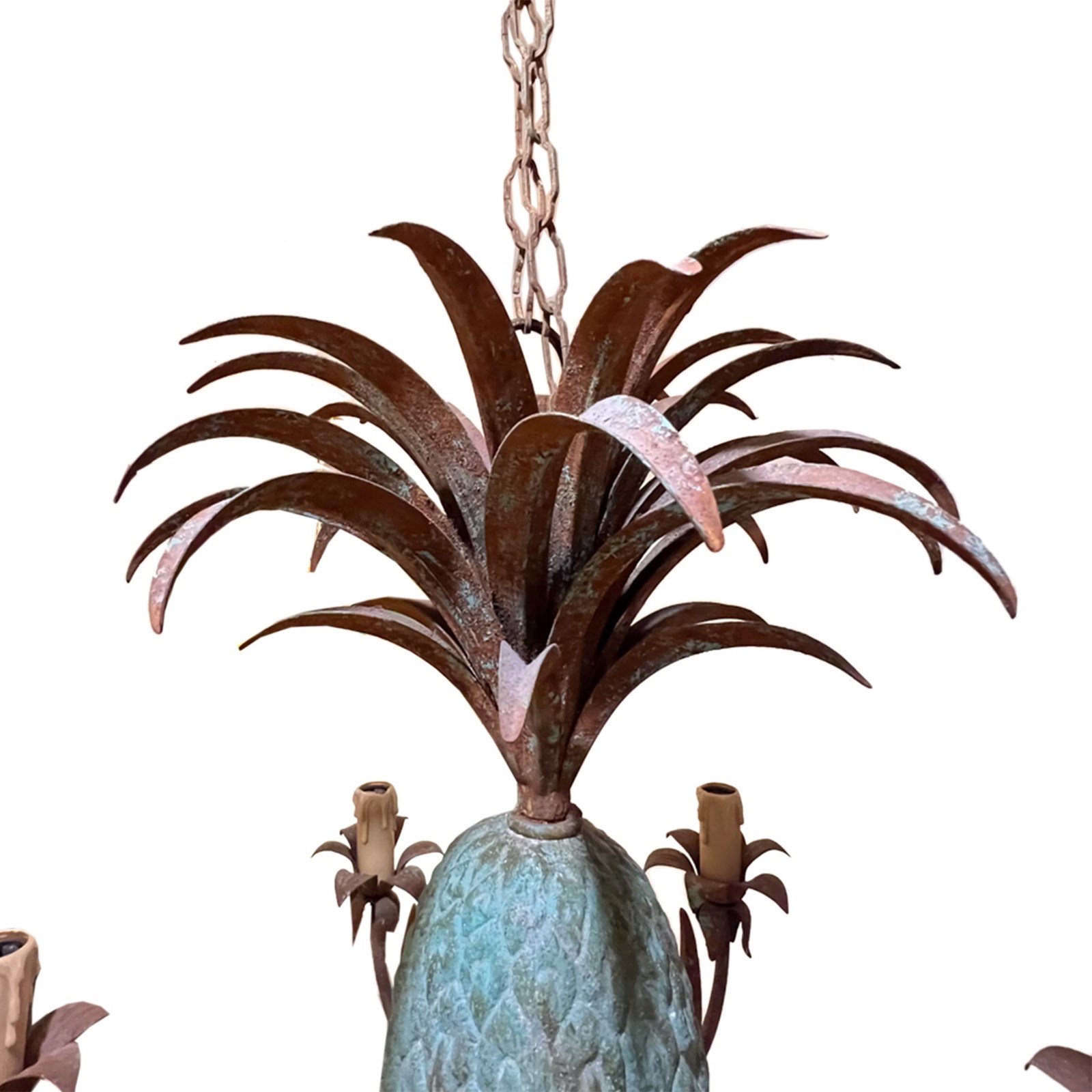 A lovely verdigris pineapple chandelier, with tolewear leaves made in France in the 1950s.