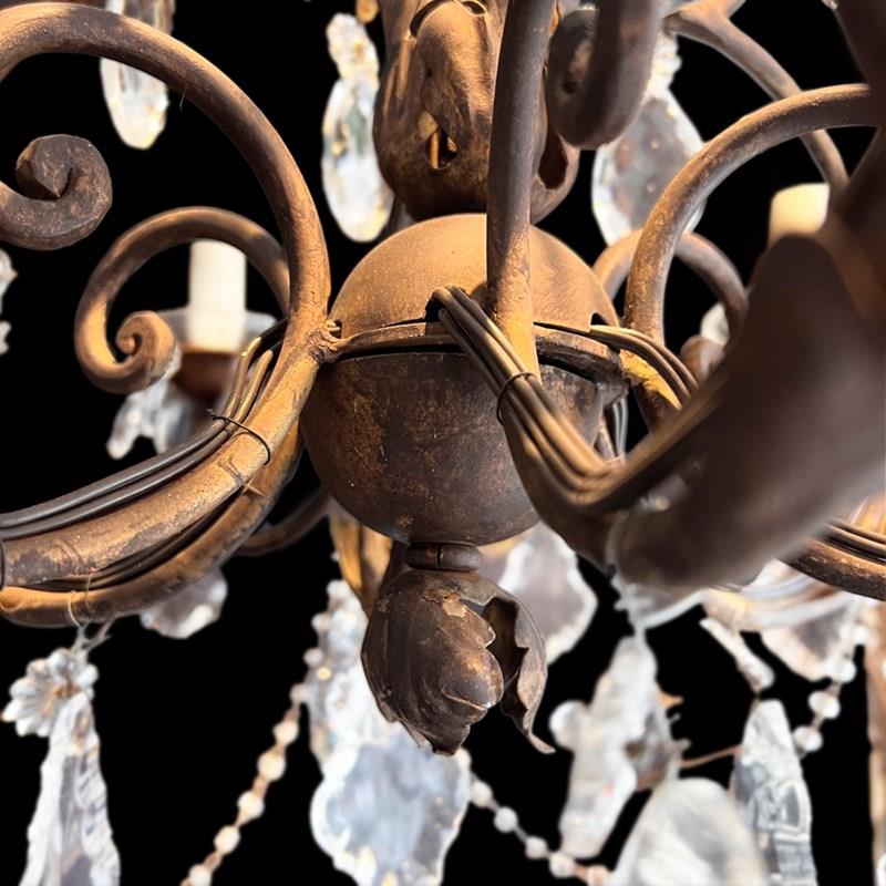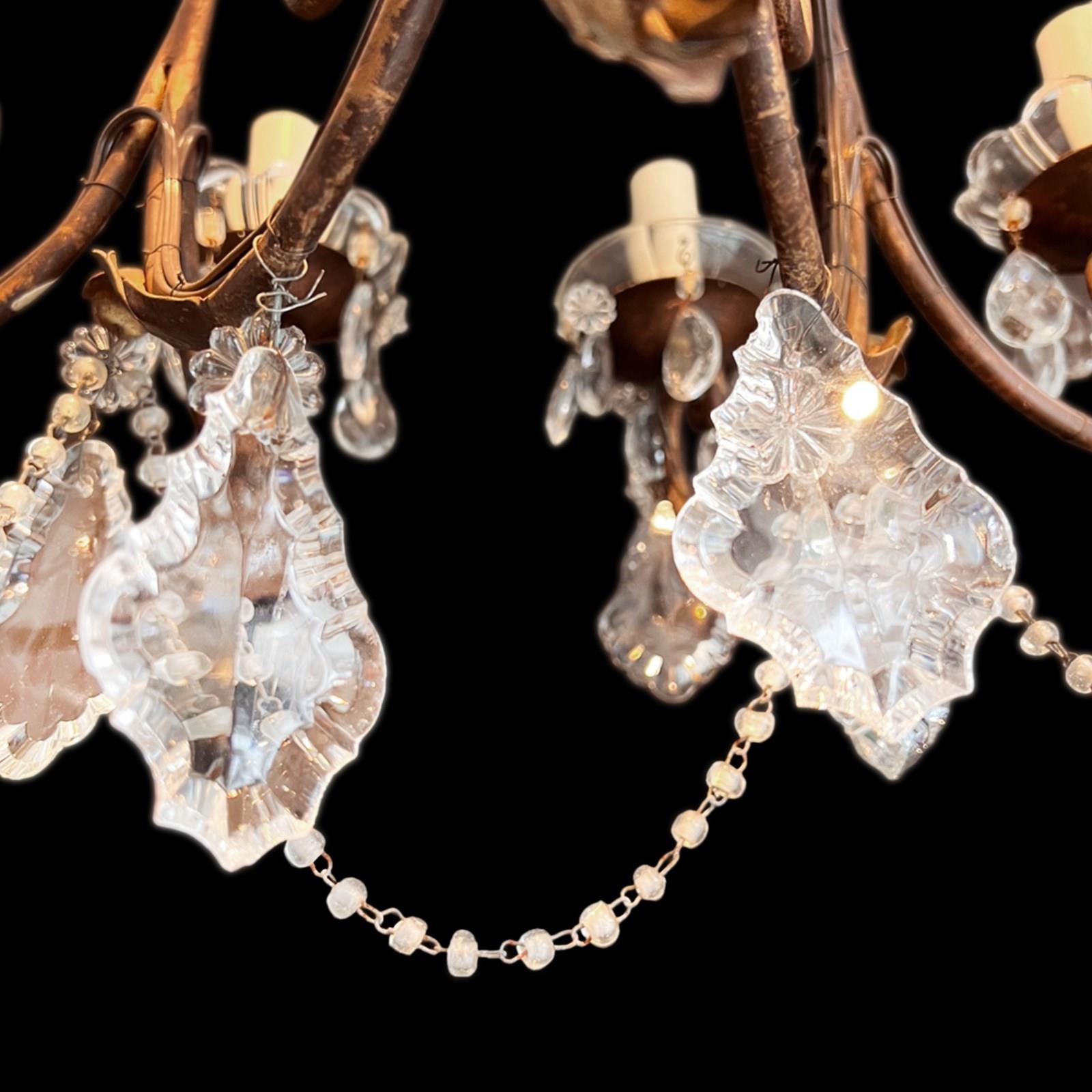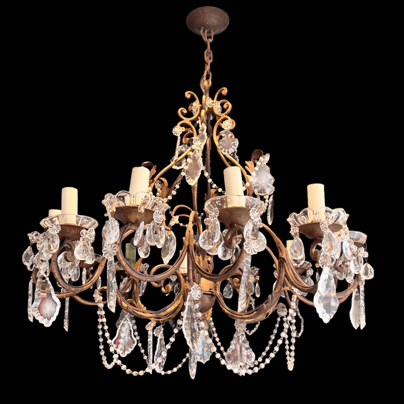 The chandelier has a gilt metal frame with a nice warm patina. The design is highly decorative, with scrolling metalwork rising toward the chain at the top. The arms curve outward in graceful loops, creating a balanced, symmetrical shape.