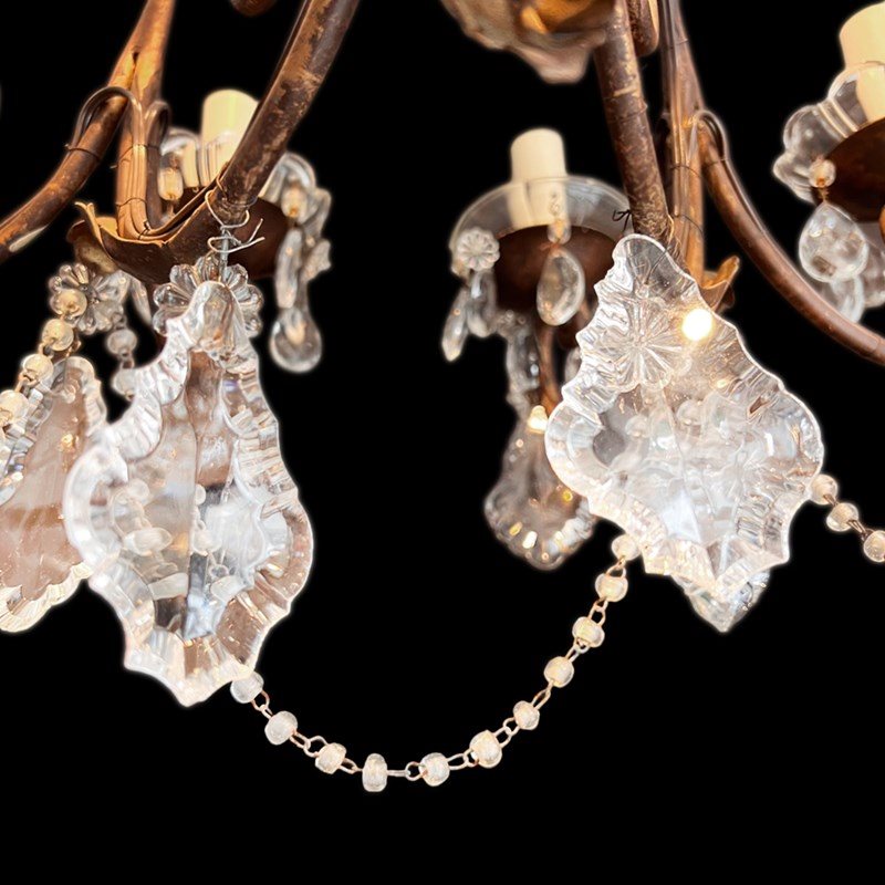Crystal adornments are abundant throughout the fixture. Large faceted teardrop pendants hang from the arms and centre, along with large scalloped crystal pendants. Strings of small crystal beads drape in swags between the arms, enhancing the chandelier’s luxurious and romantic feel.