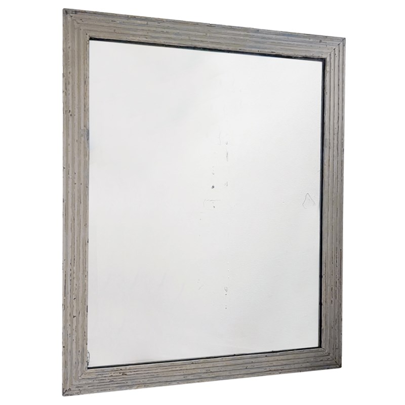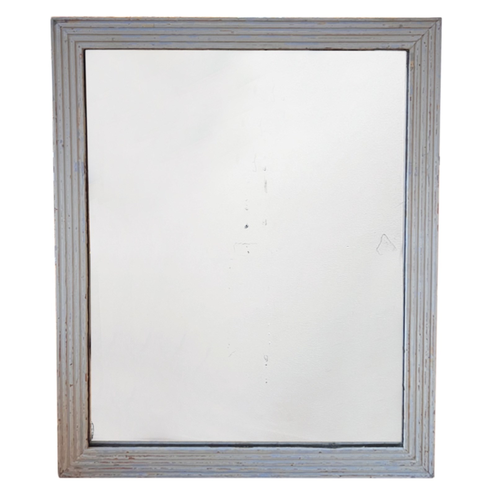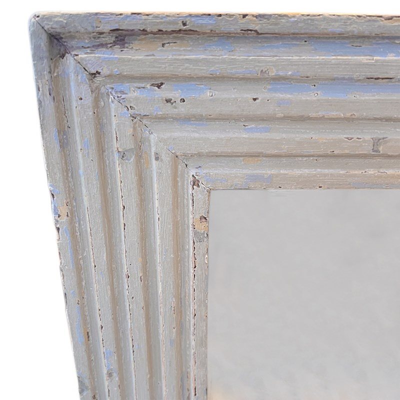 The frame has a reeded design running parallel to the edges, giving it subtle texture. It retains the original paint, which is mostly a muted gray-blue tone with visible wear - consistent with the mirror's age. There are hints of wood showing through.