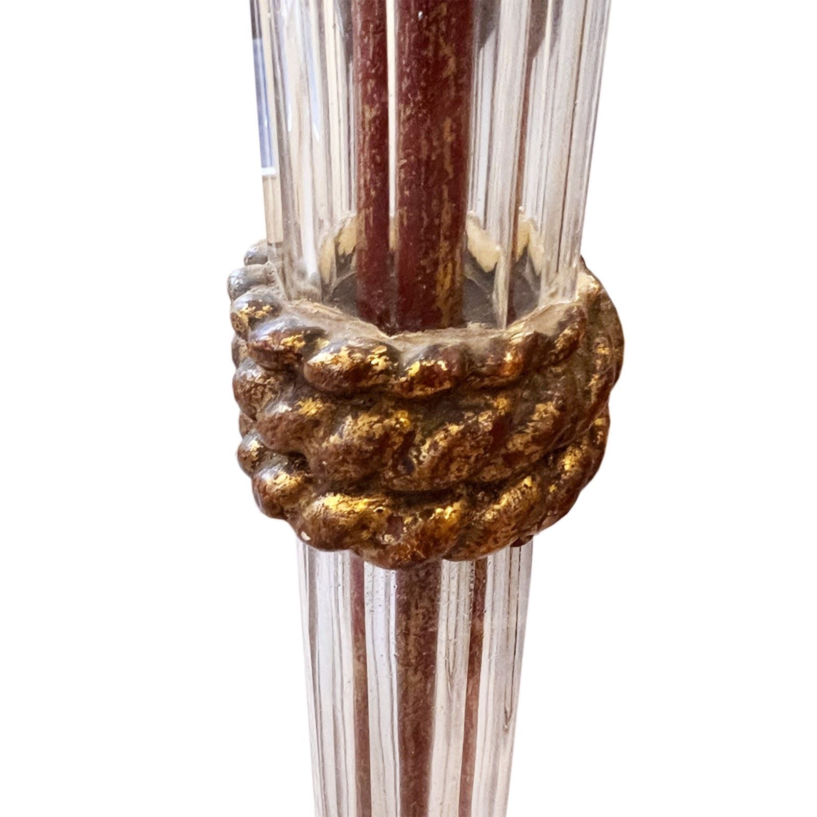 An impressive floor lamp with a pencil edged glass column, decorated with giltwood twisted rope detail.
