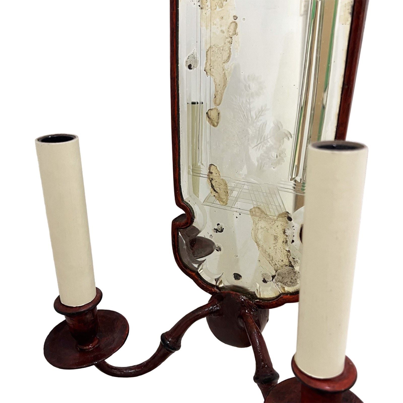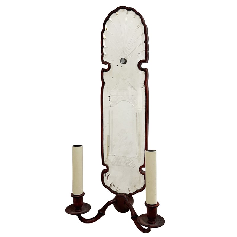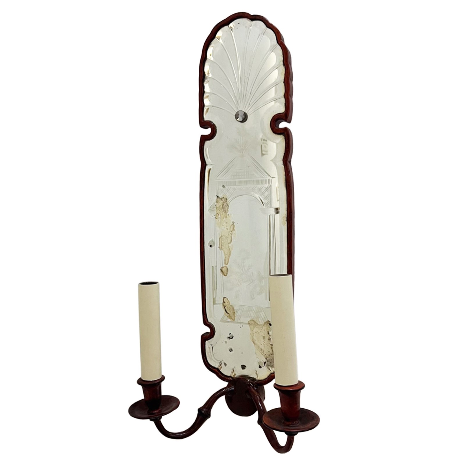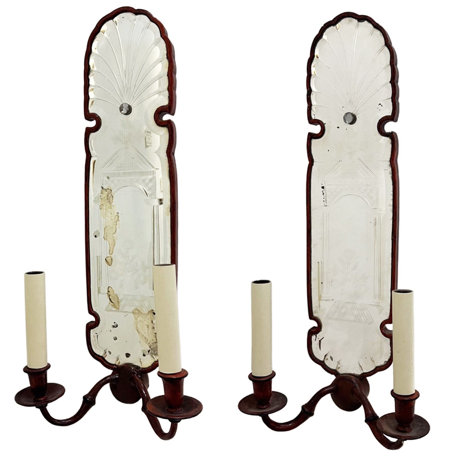 The tall, narrow backplates have arched tops with a scalloped edge. The original pieces of glass have an etched pattern, incorporating a neoclassical building and a fan motif at the top. One of the mirrors shows significant aging and foxing (dark spots and cloudiness), which is common in antique mirrors. Please take a look at all our pictures to see this detail.