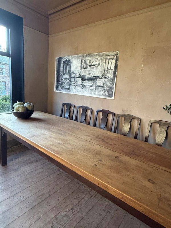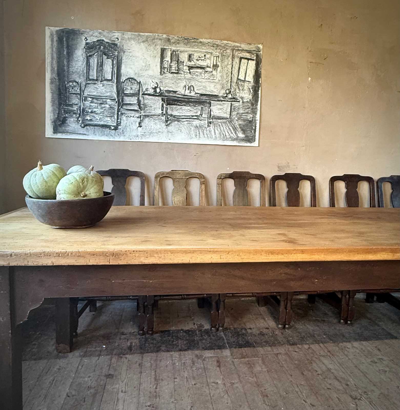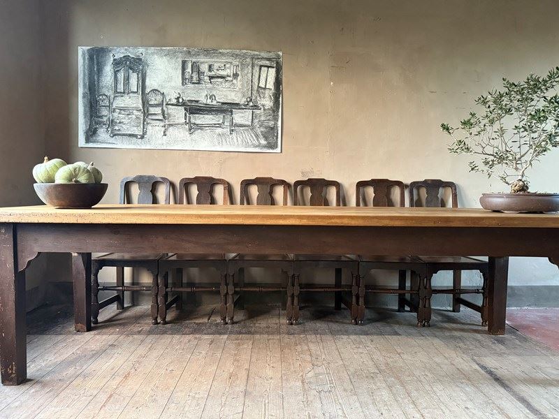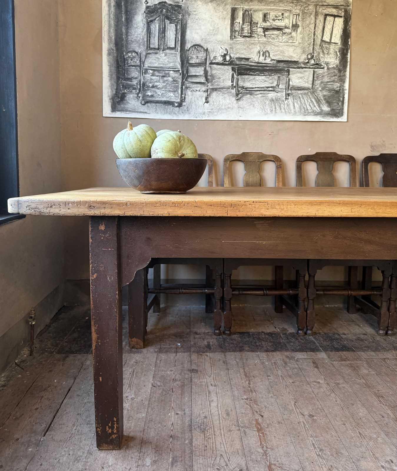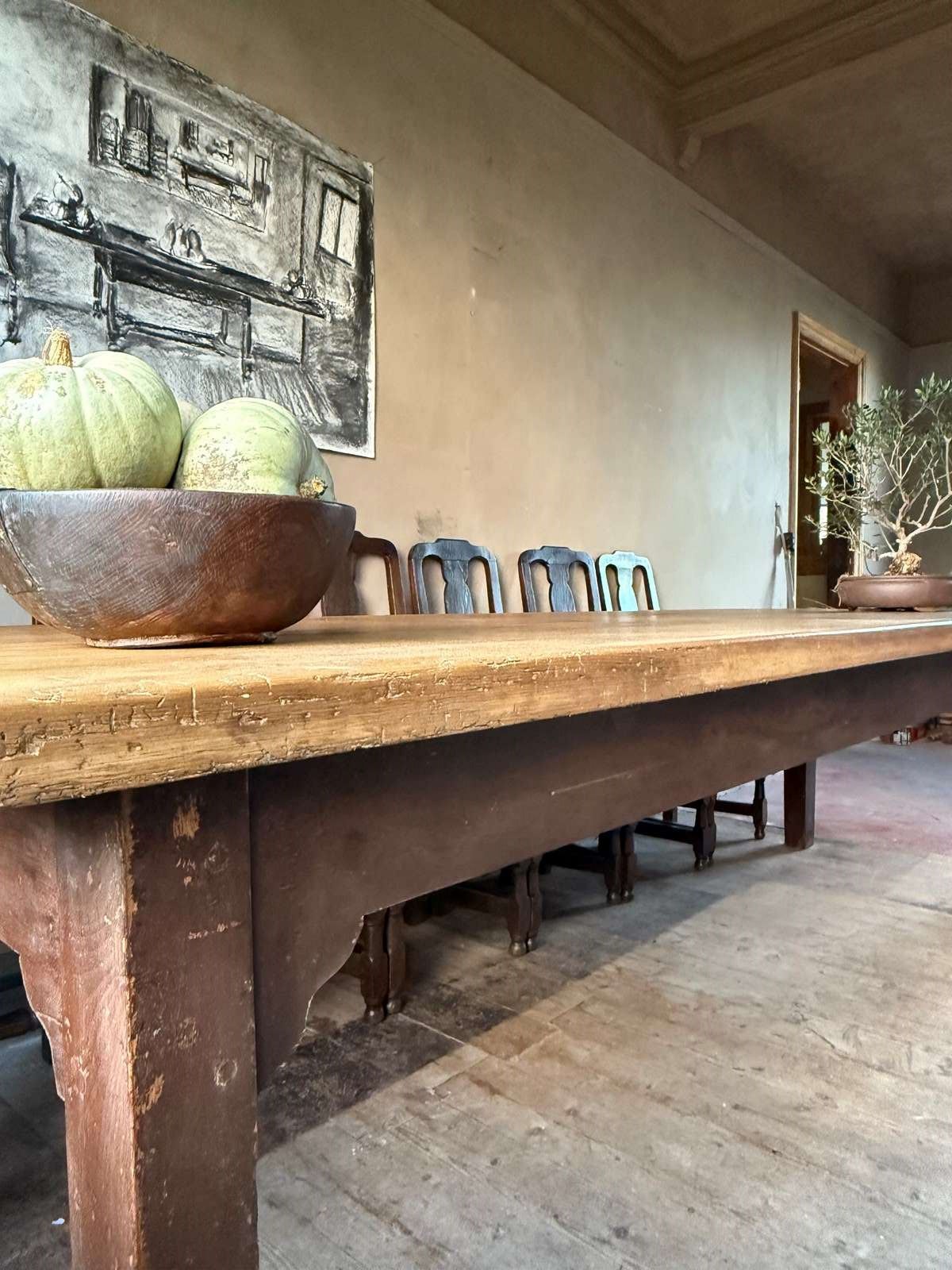 Huge two plank top pine table from estate in Wales , fresh to the trade , wonderful top , extra wide, good strong form , original paint seat, top lifts off for access , plenty leg room.