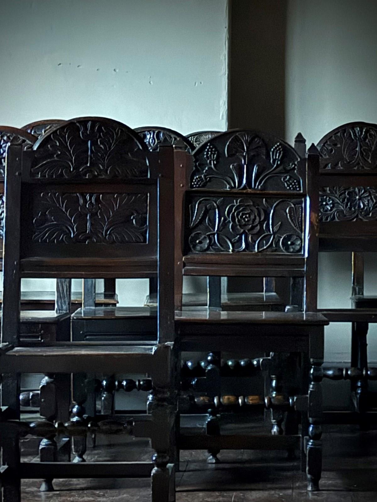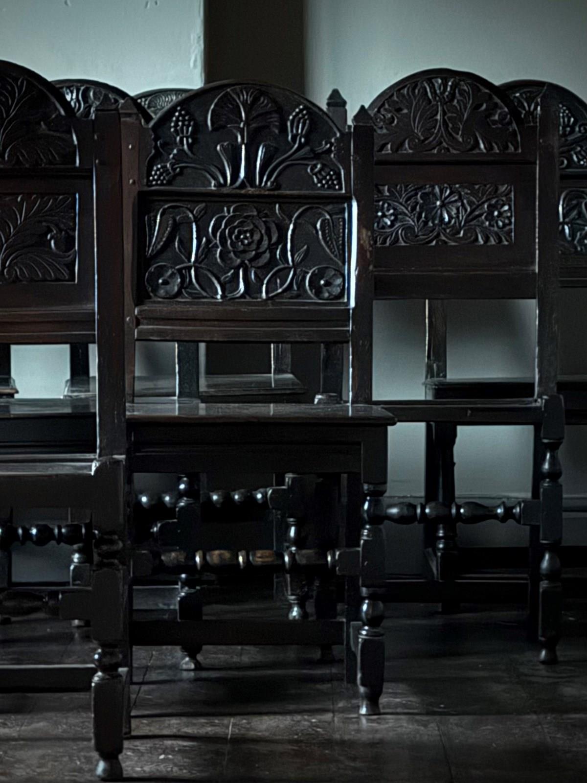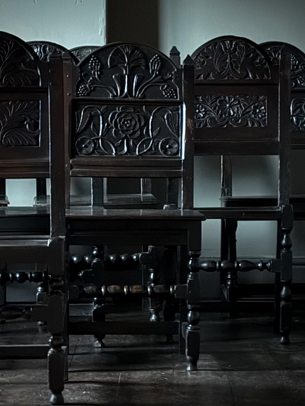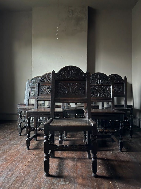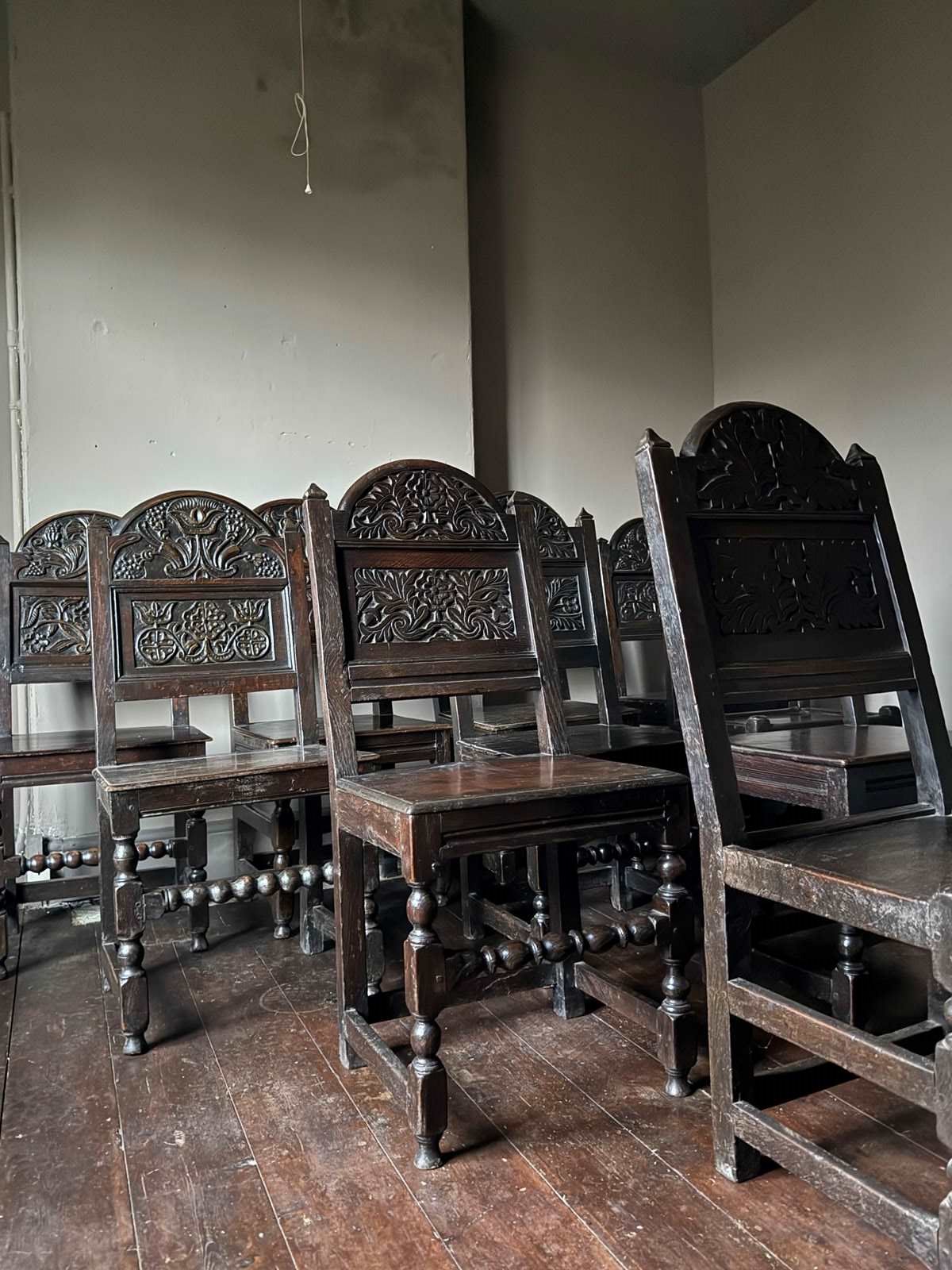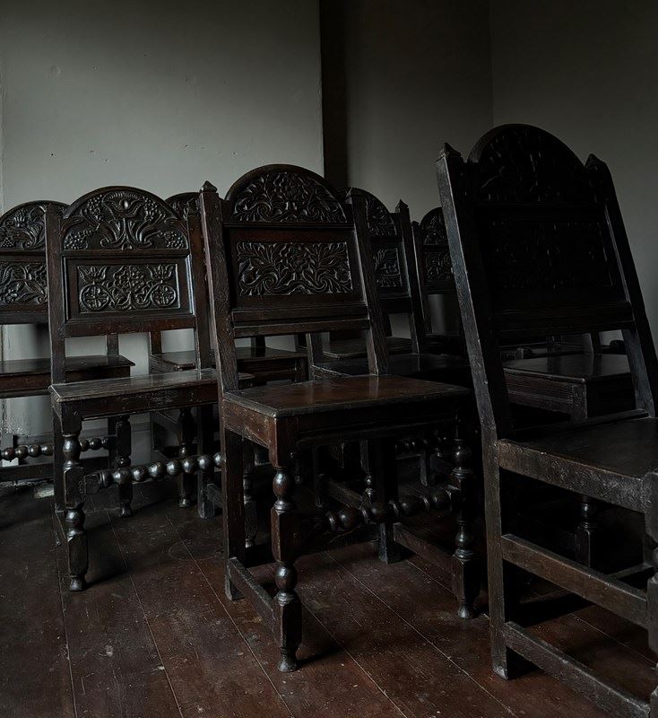 Harlequin collection of 10 Lancashire 17th c backstool. All in good strong condition.