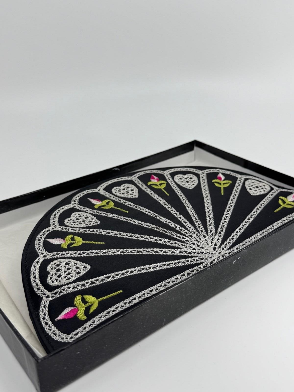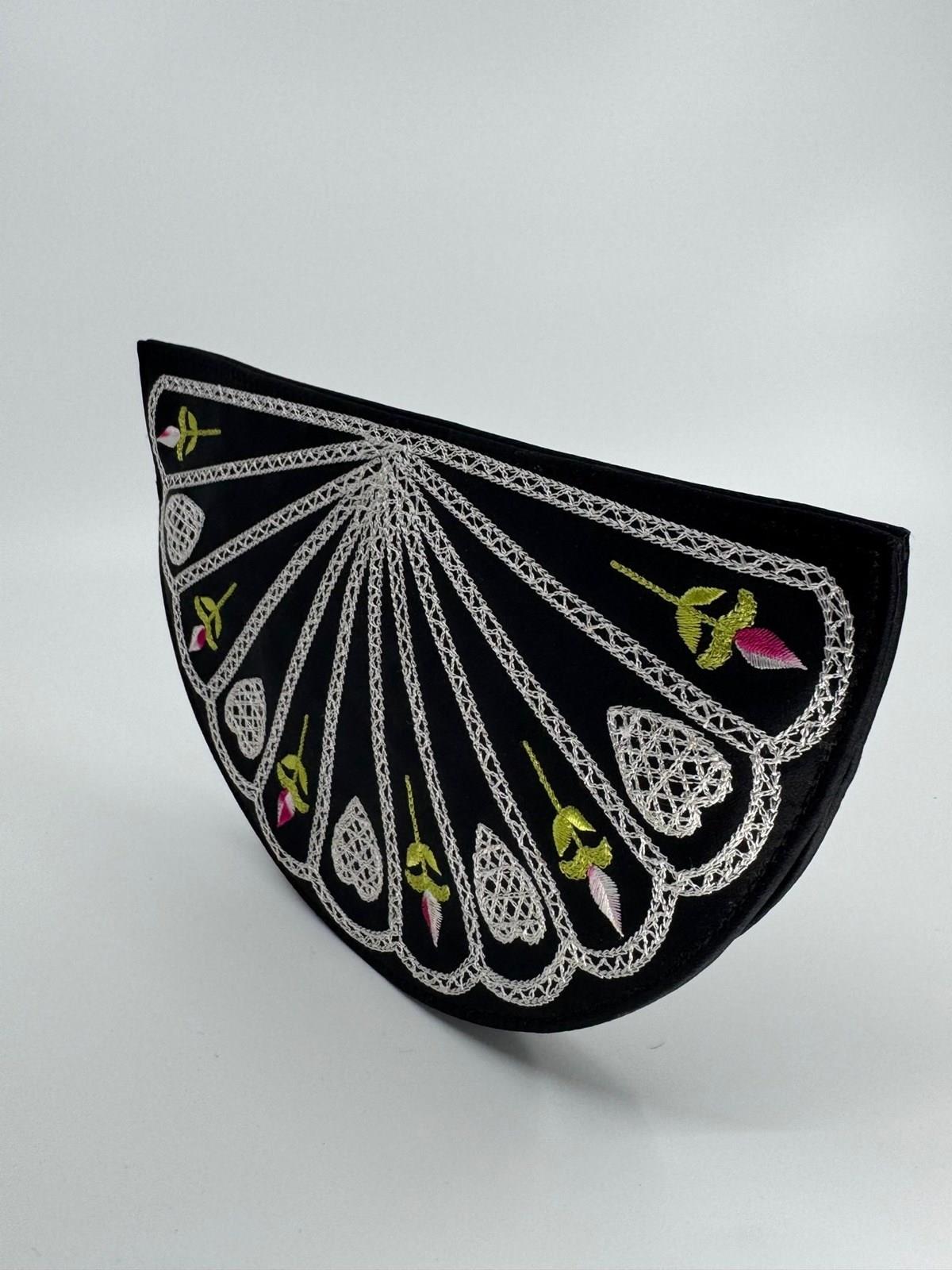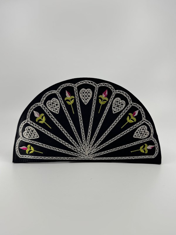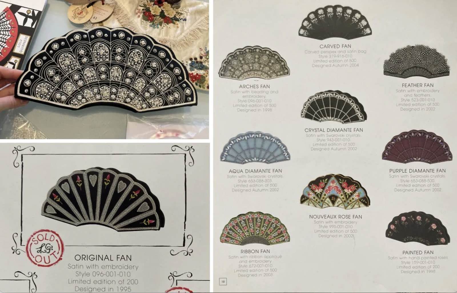 The design differs from the first 1990s original (see final pic from the LG archive) in that it doesn't have the scalloped top, and has a flat base, but the embroidery on black satin and the colours of the fan decor to the front, mimic exactly the original 1995 Fan clutch bag.