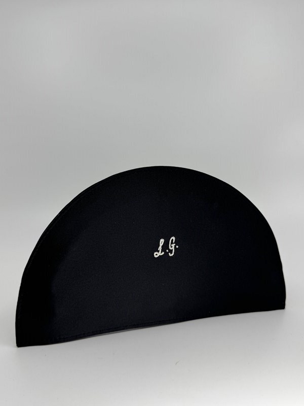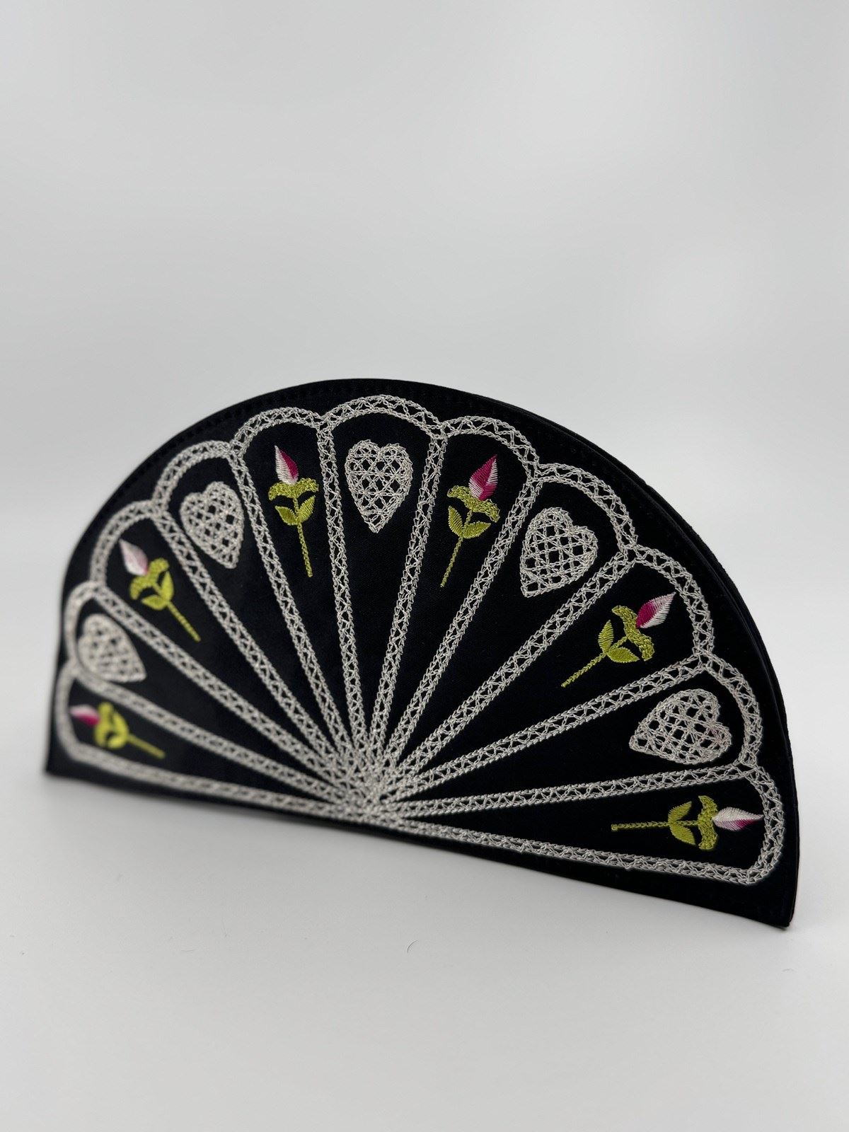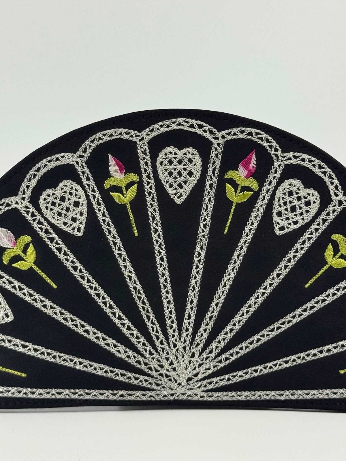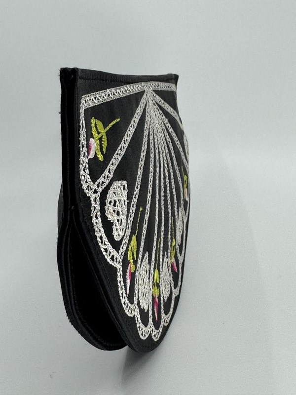 The design differs from the first 1990s original (see final pic from the LG archive) in that it doesn't have the scalloped top, and has a flat base, but the embroidery on black satin and the colours of the fan decor to the front, mimic exactly the original 1995 Fan clutch bag.