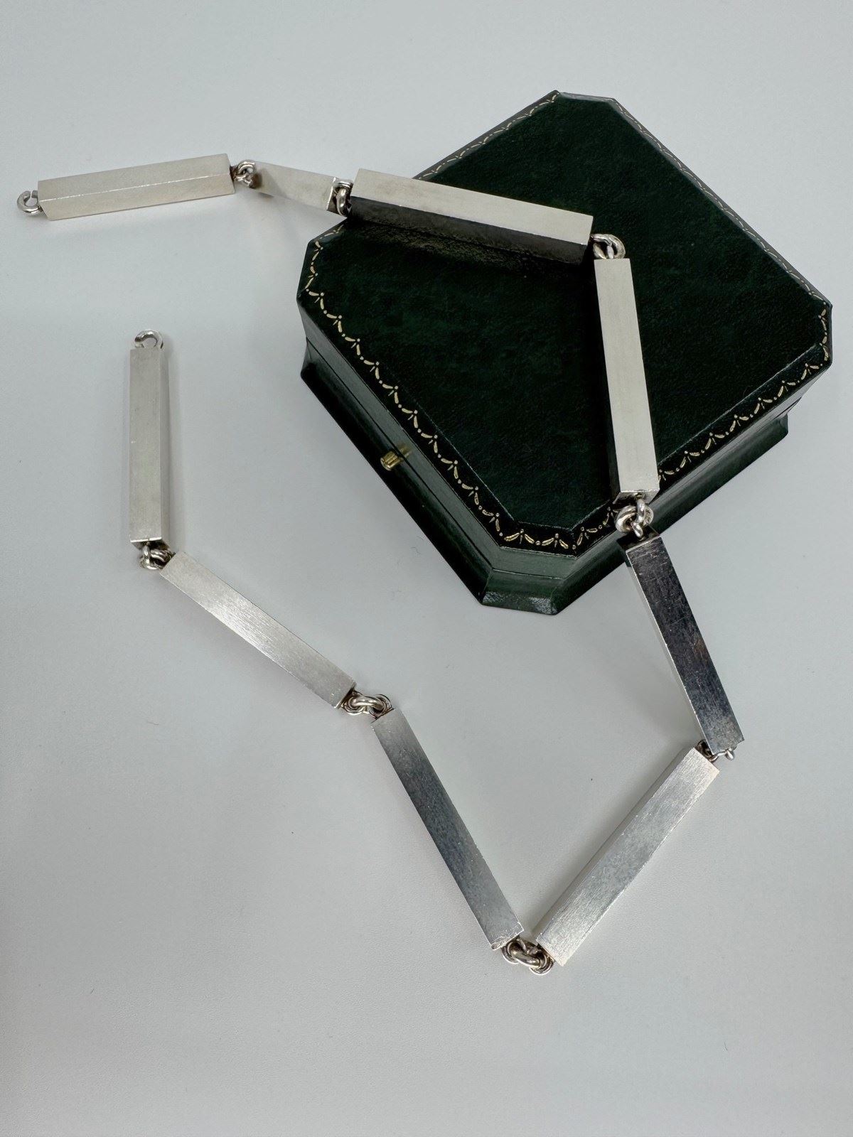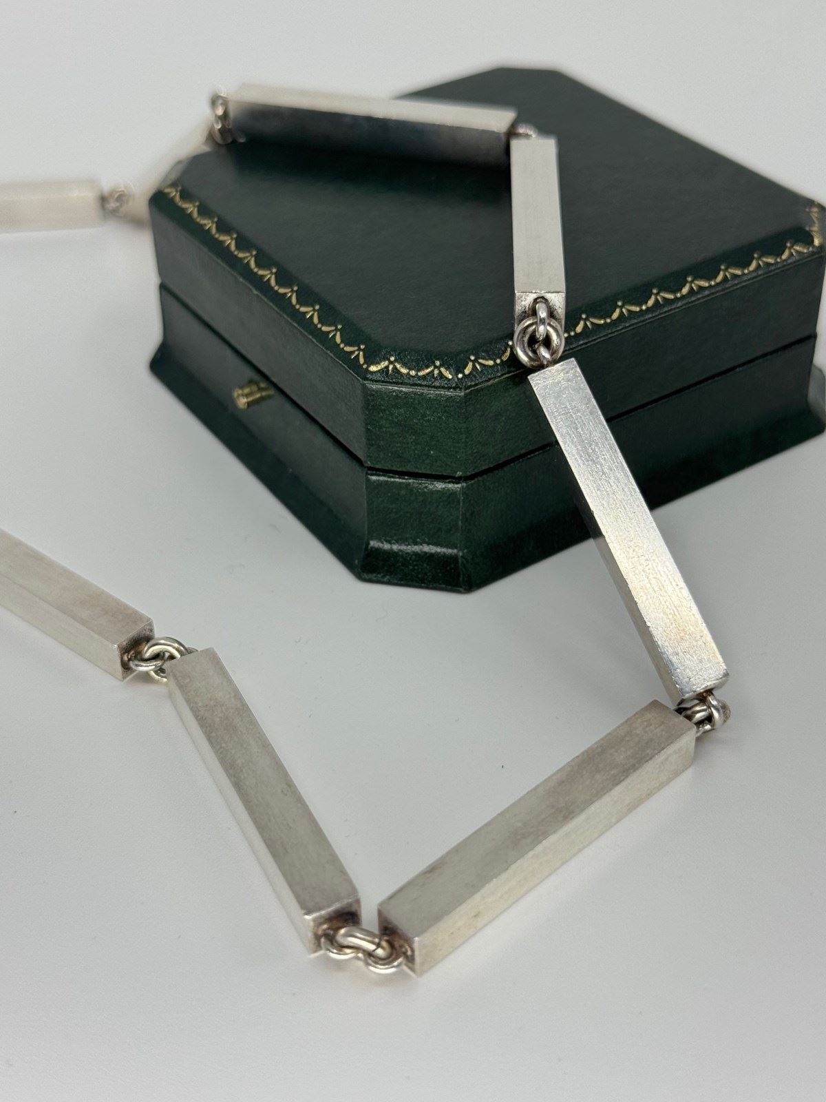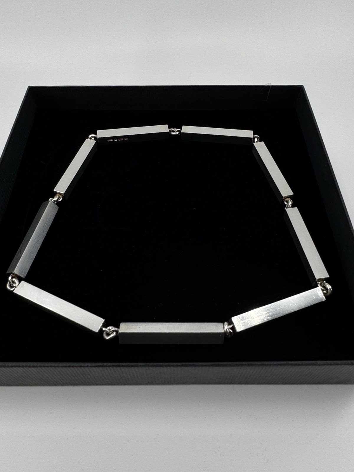 Ström has a wonderful talent for combining Swedish tradition with modern design and is well known for his geometric designs. Given it's weight of approx 144g, the thick rod links and being 45cm long, this is a surprisingly very comfortable necklace and sits really well and looks amazing on.