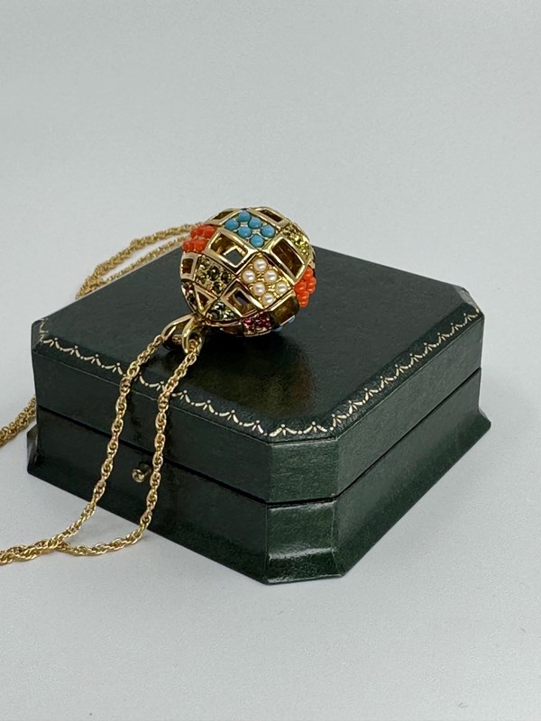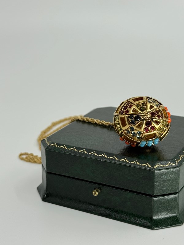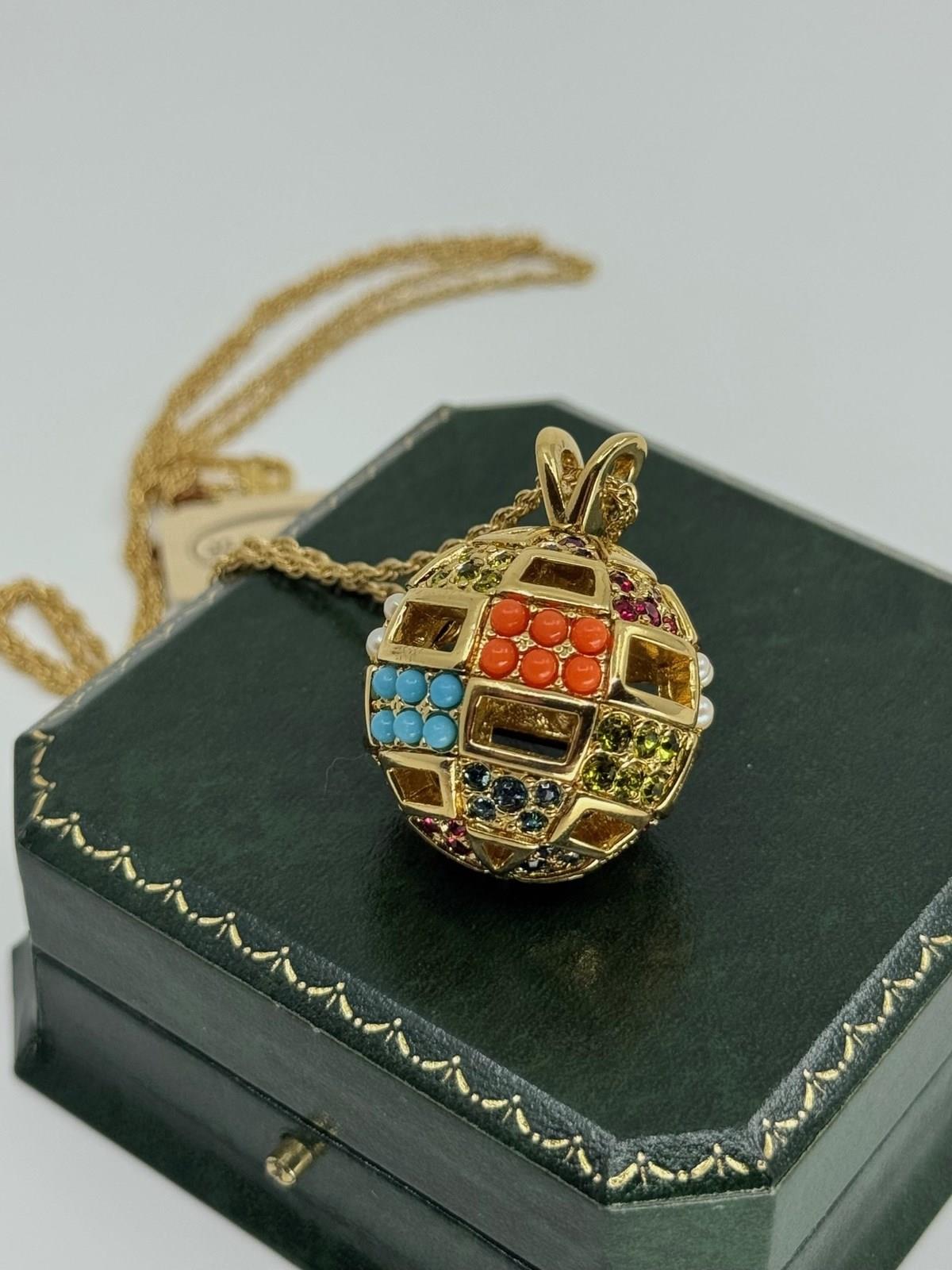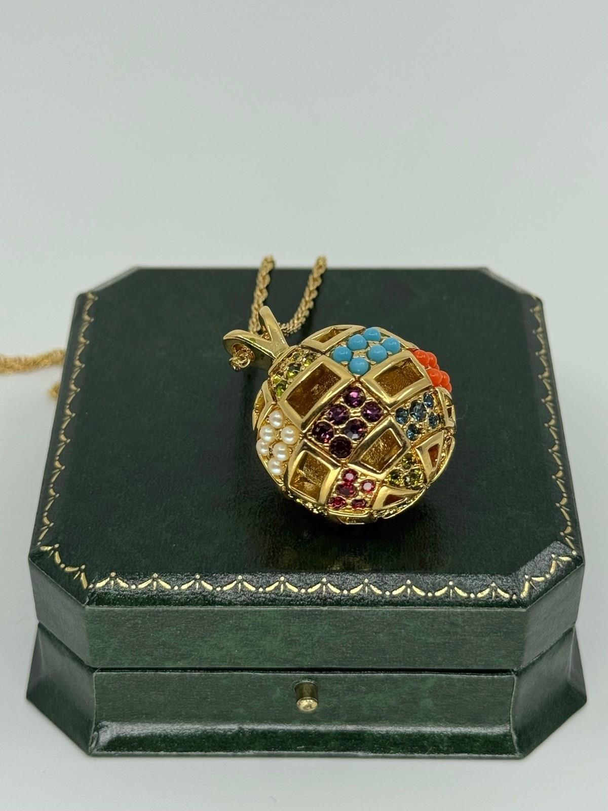 This three dimensional decorative pendant is in excellent condition and is decorated with faux pearl, turquoise and coral cabochons and multi coloured round cut Swarovski crystals, making this a great match for many outfits during the day or evening.