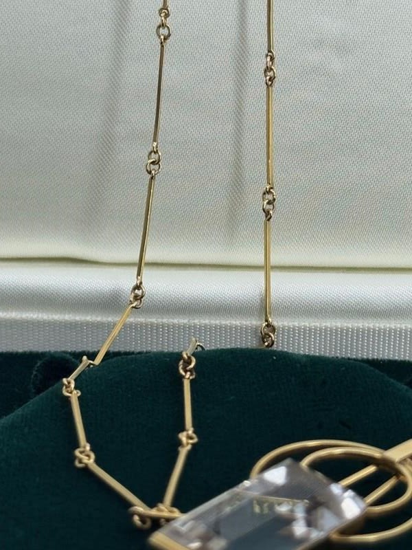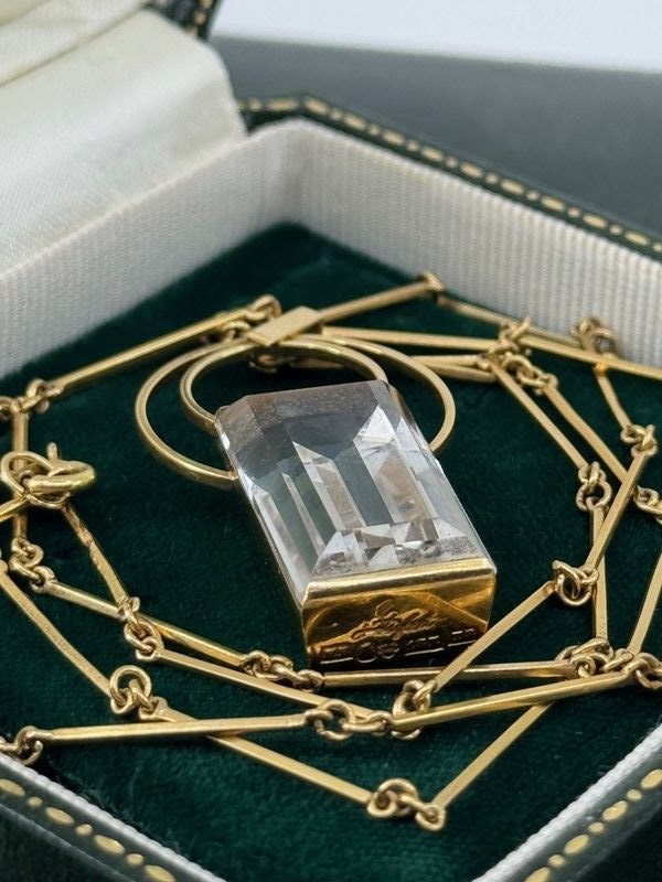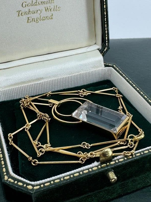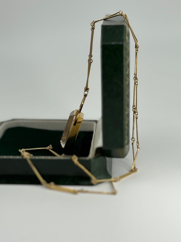 This necklace has a feminine look and feel, making it perfect for day wear as well as dressy evening wear. The chain is a slim bar and link design and the pendant a light and open design of two circles connected to a rectangular gold encased rock crystal. In all original and very good condition, this is a versatile piece that will look good with a polo neck sweater, dress or open neck shirt.