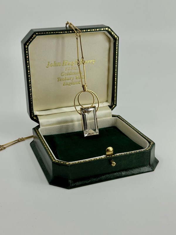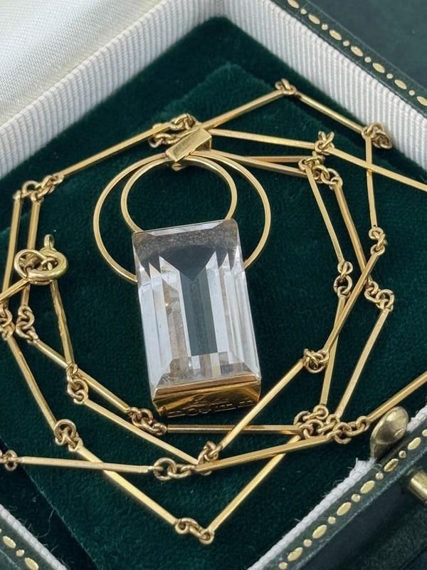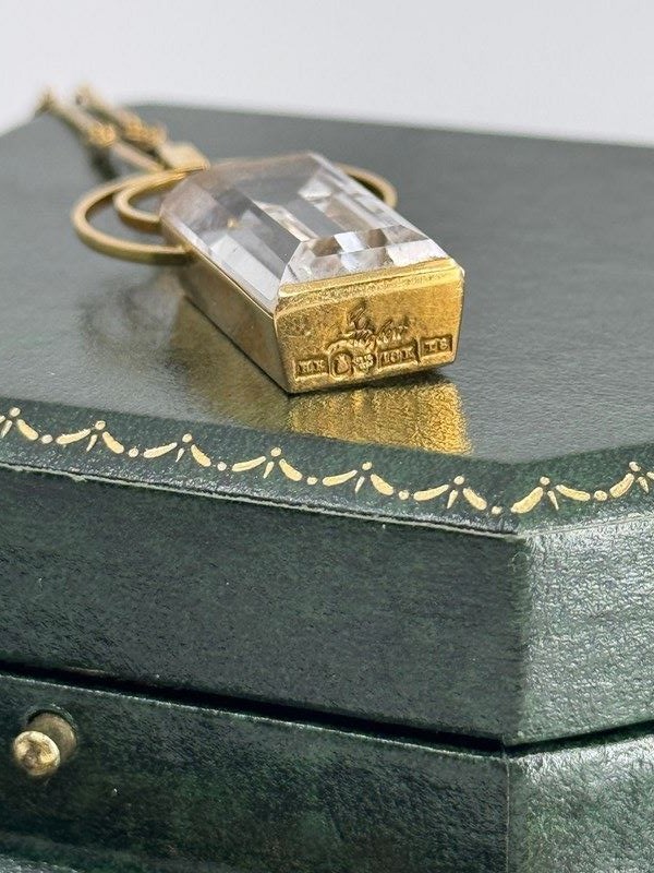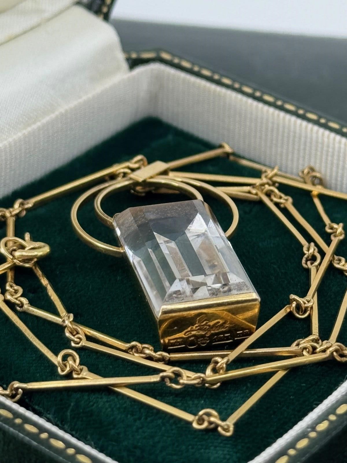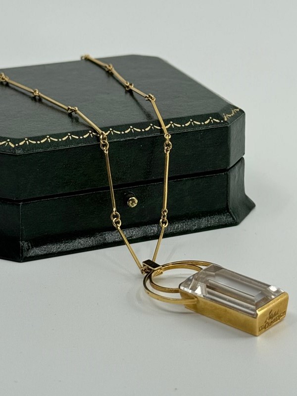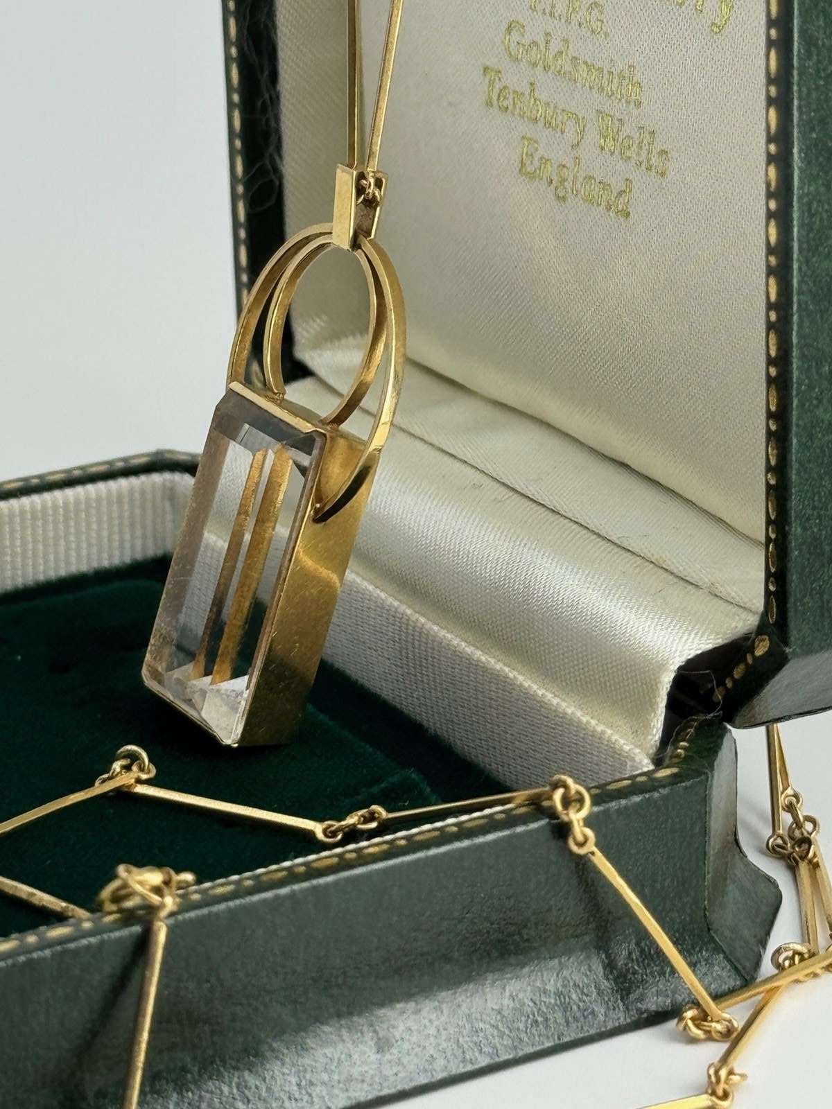 A very beautiful vintage 20th Century 18K gold and faceted rock crystal pendant by the internationally well known and respected Swedish jewellery company Stigbert, founded in Stockholm in the 1920s. They are amongst the best known Modernist jewellery designers and creators of the last Century. They came to prominence in the 1950s, and attracted some great designers such as silversmith, designer and sculptor, Sigurd Persson.