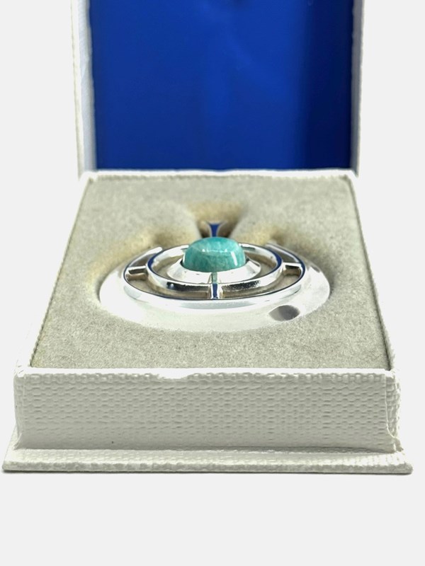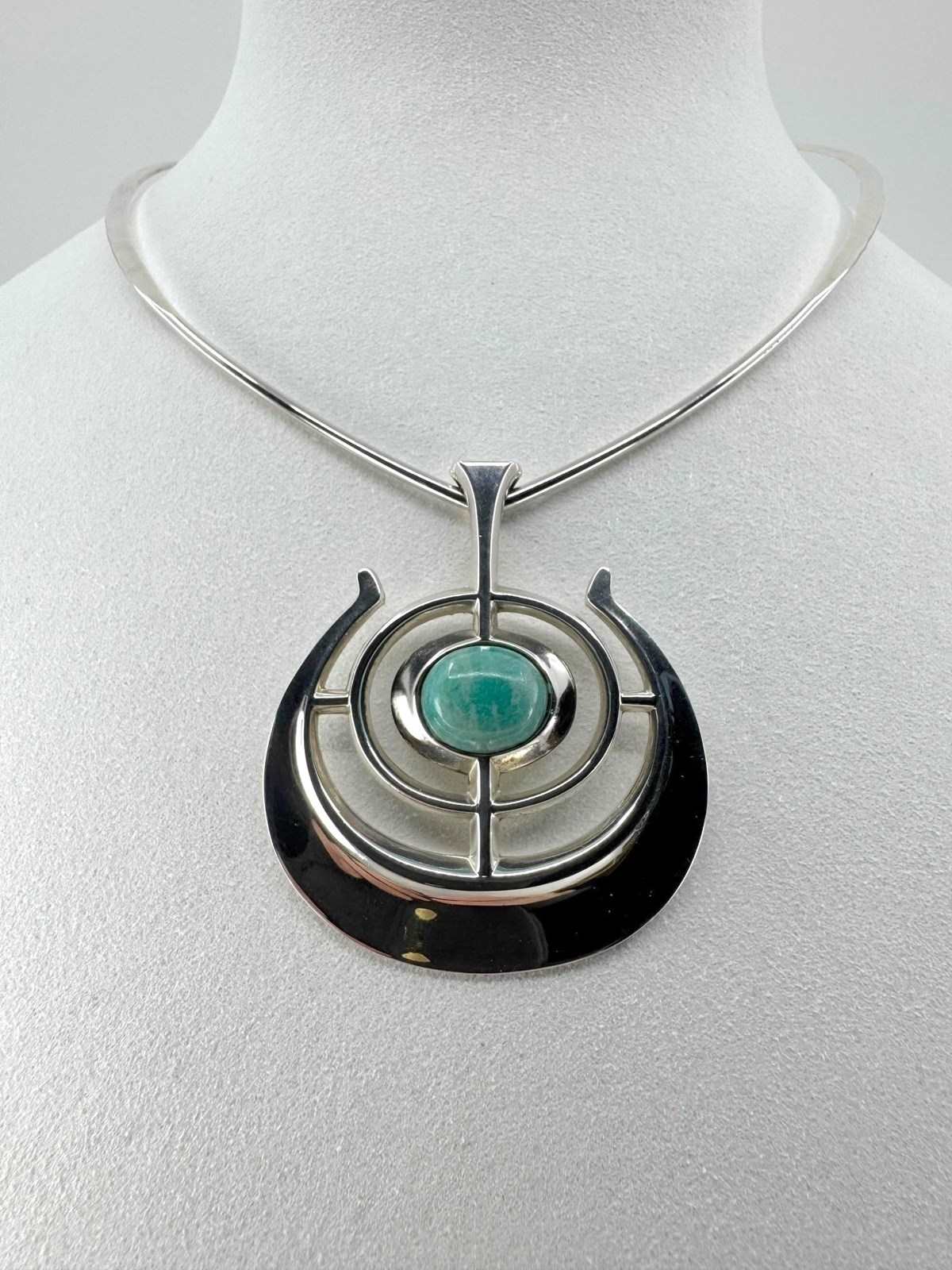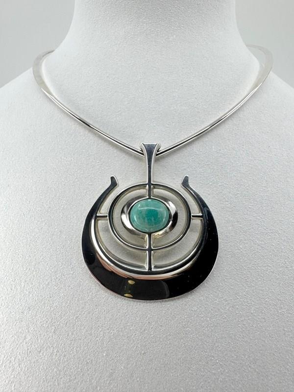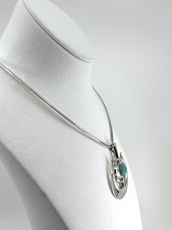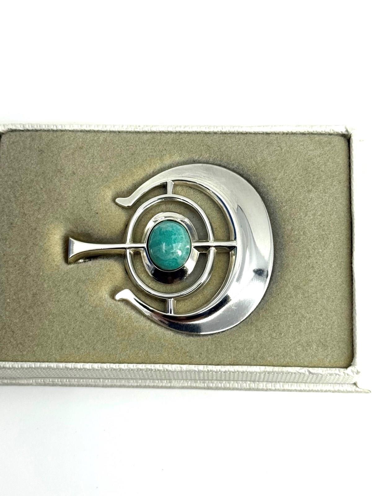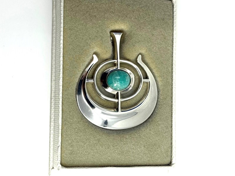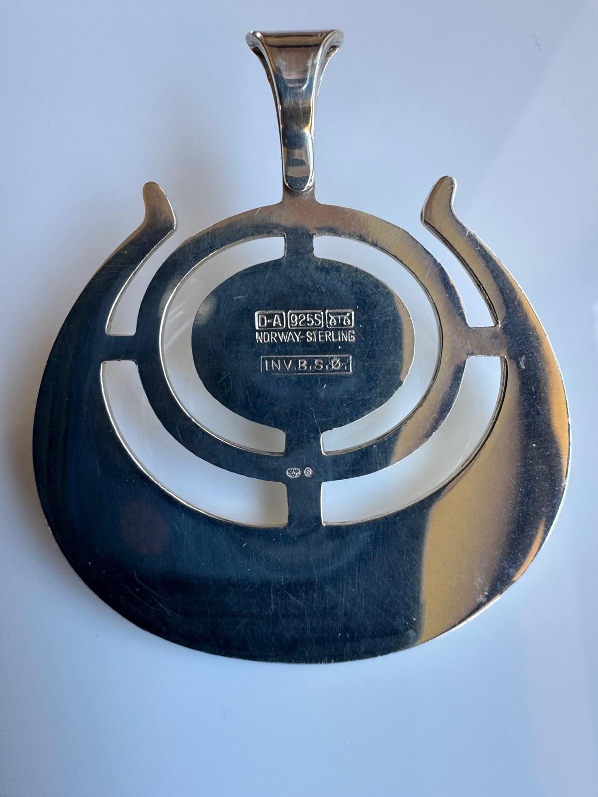 The pendant is set with an Amazonite green / blue cabochon and is presented in it's original box, created to hold and protect it perfectly, hence it's very good condition. The back of the pendant bears the D-A hallmark along with the others you would expect to find on a quality silver piece. The INV. B.S.Ø stands for Inventor Bjørn Sigurd Østern.