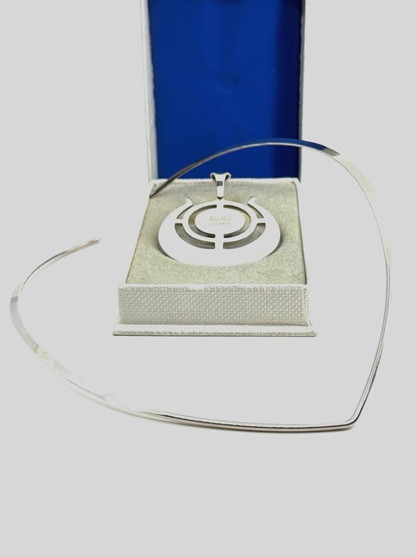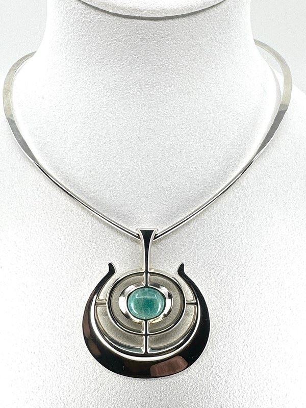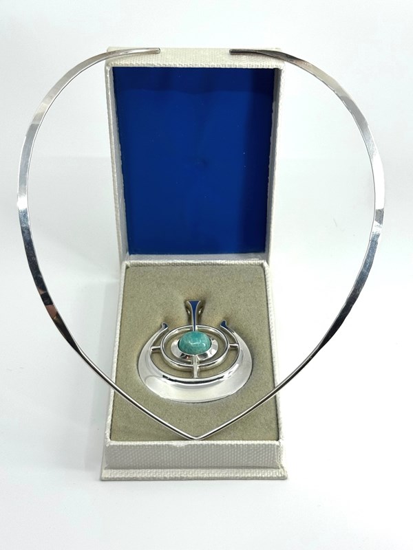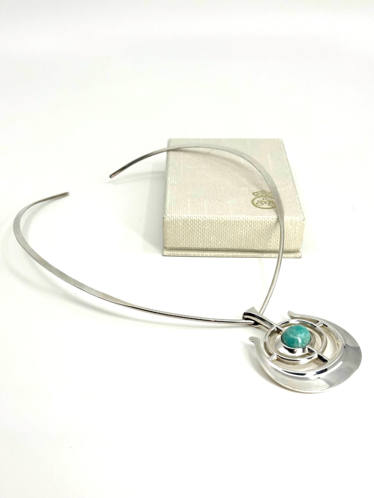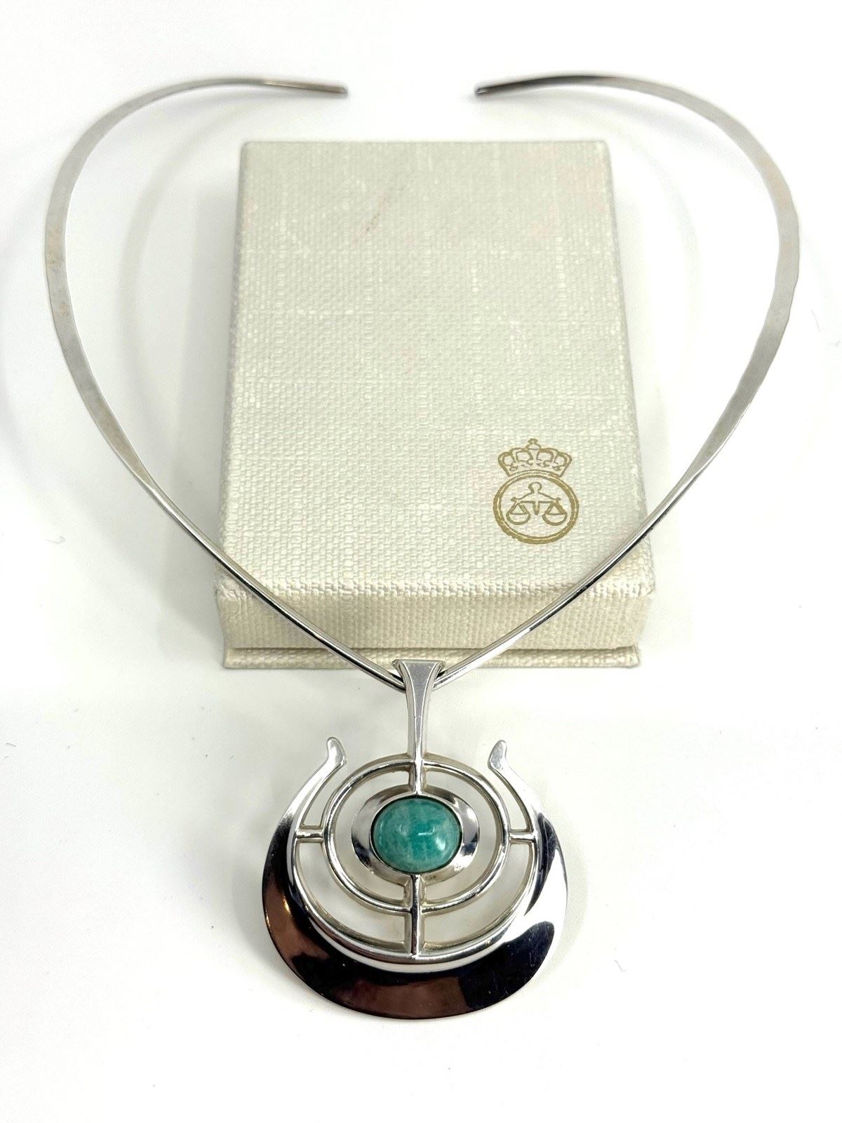A very modern look to this vintage silver 1964 design Bjørns Lykkebat (Ship of Good Fortune) pendant and collar by renowned Norwegian designer Bjørn Sigurd Østern for David-Andersen Company (founded in 1876 in Oslo and the best known jewellers in Norway of the 19th century) for whom he was a lead designer between 1961-73 and again in 1974-1985.