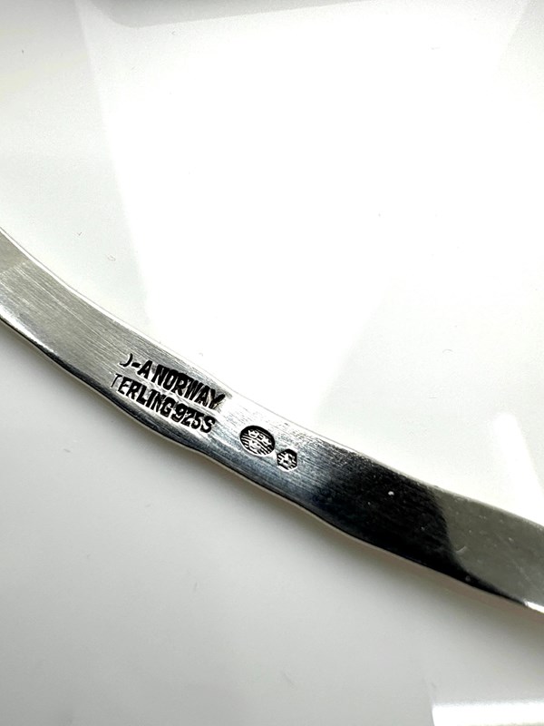 The collar (torque or neckring as some call it) has a lightly hammered surface and is stamped D-A NORWAY and STERLING 925 S bearing the 3 crowns and S hallmark. It comes in it's own fabric tie bag.
