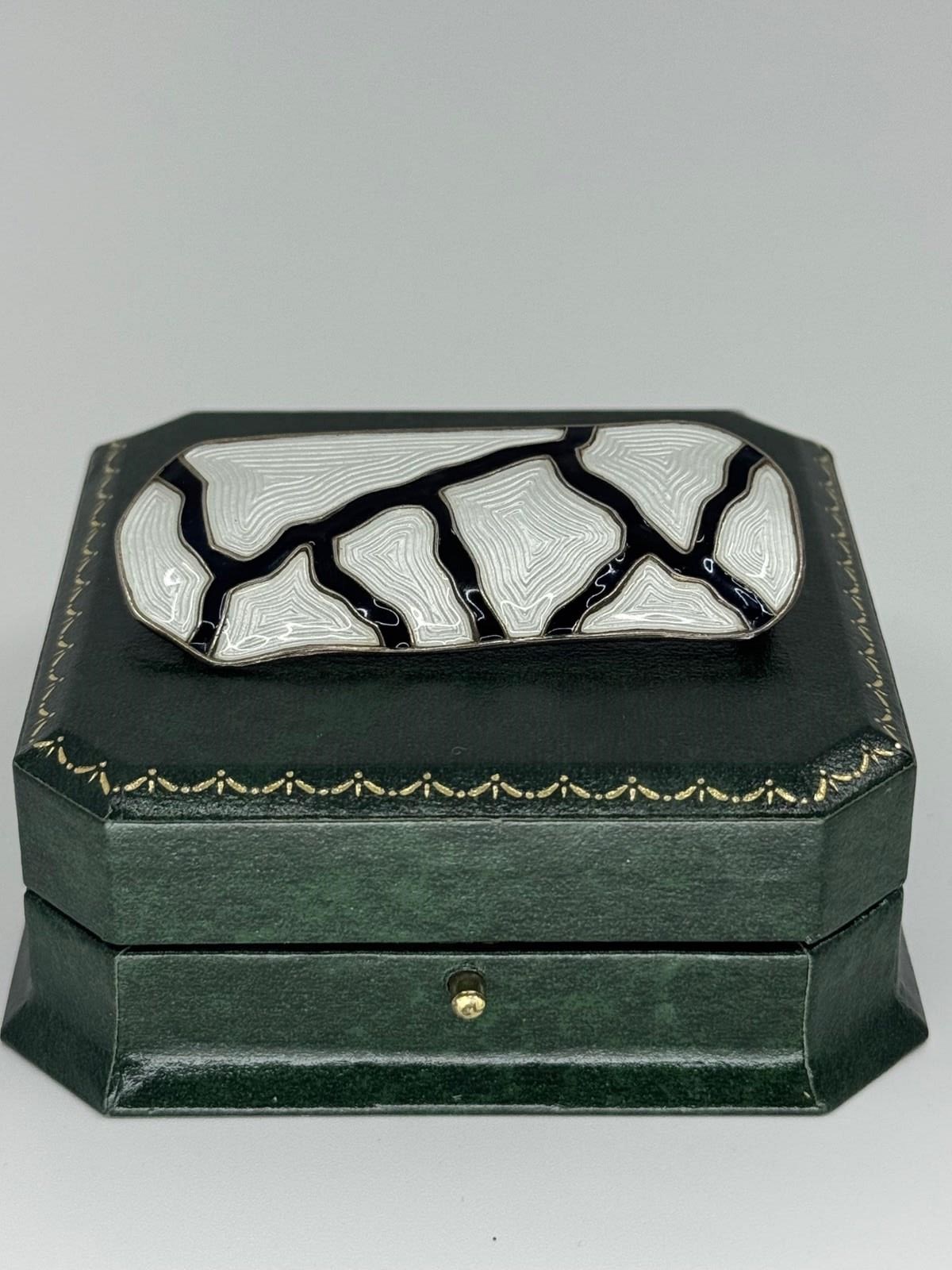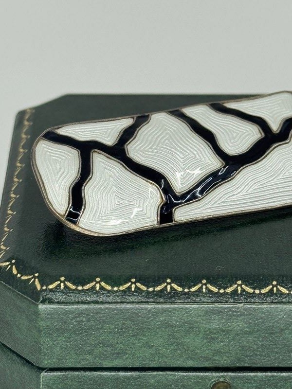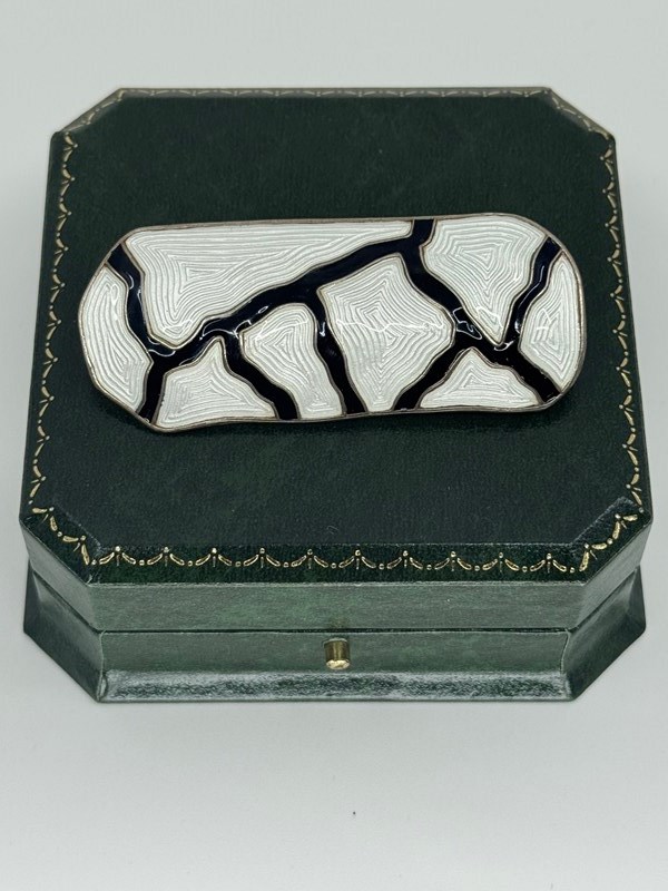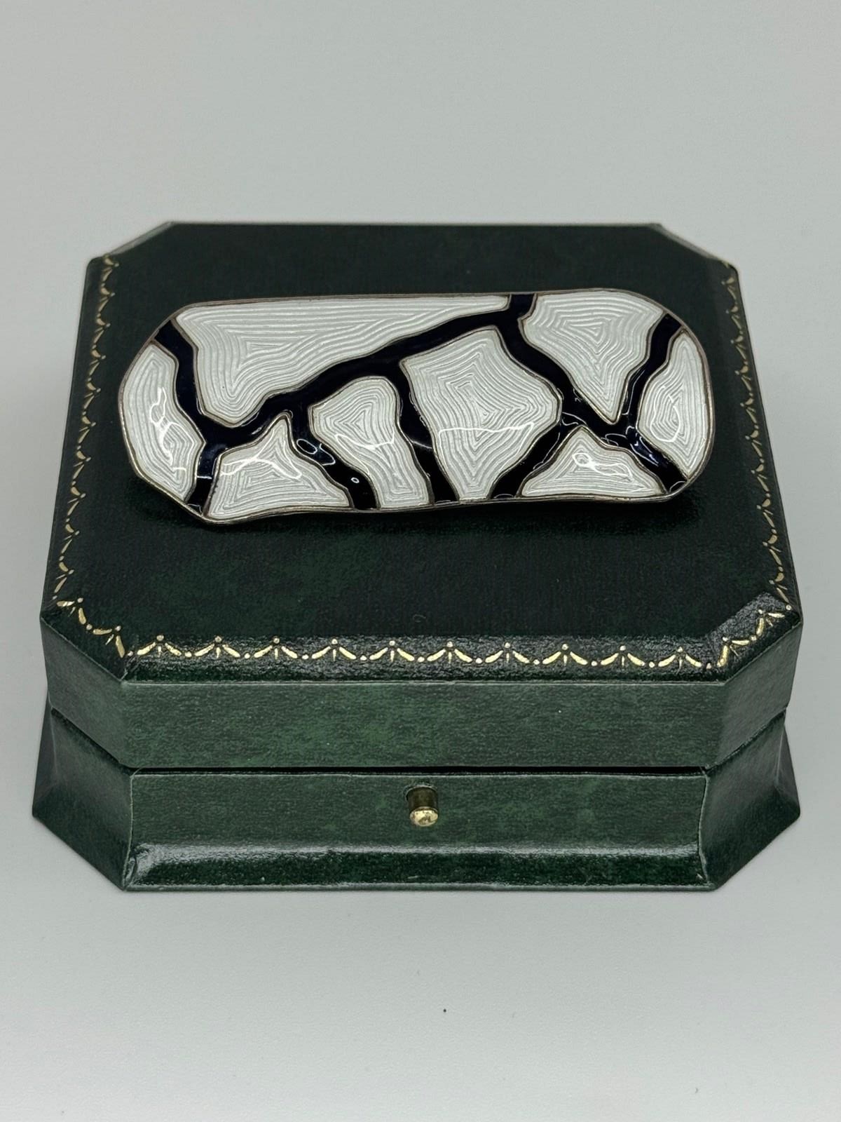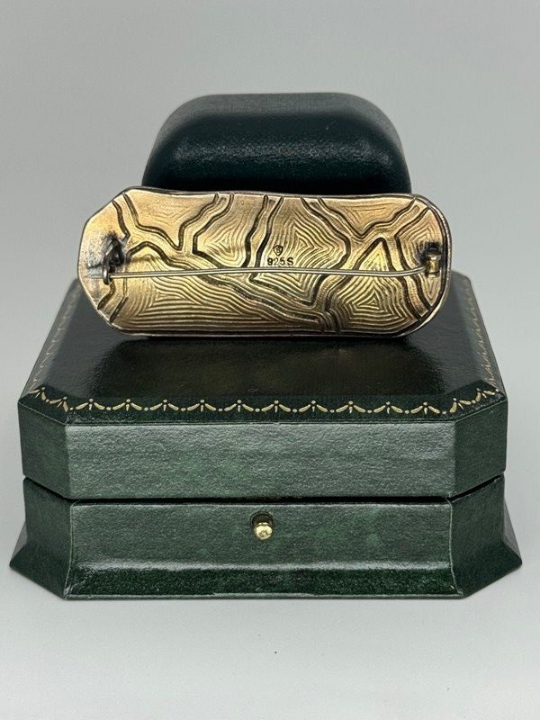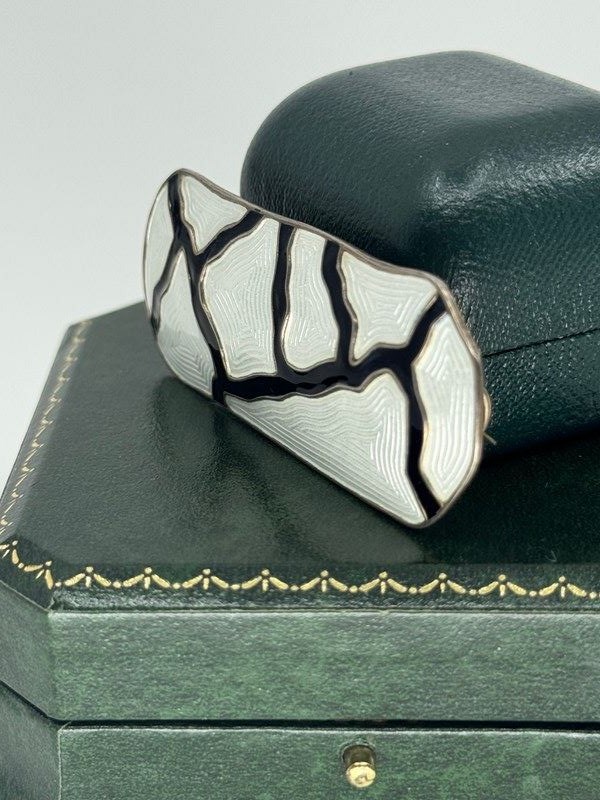 Made in silver gilt with black and white enamel of which he is known to have produced brooches in, it is stamped to the reverse 925S. Of very good quality and finish and in great original condition. A very wearable piece and a good size at approx 6cm x 2.5cm, the enamel work is completely intact with no chips or damage and the pin in very good working order.