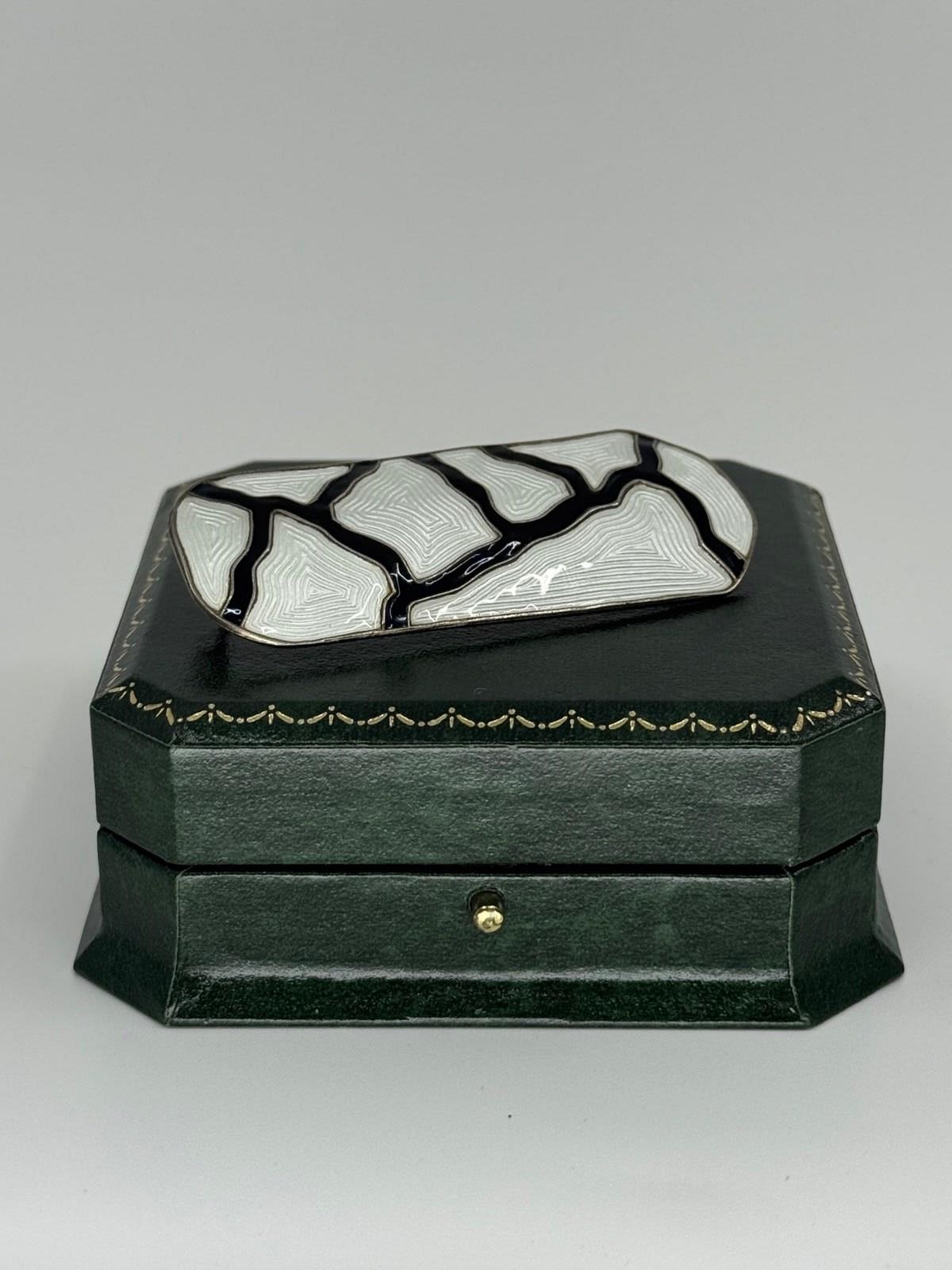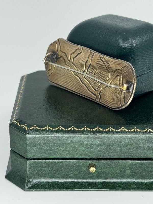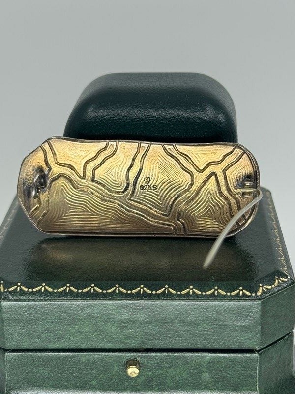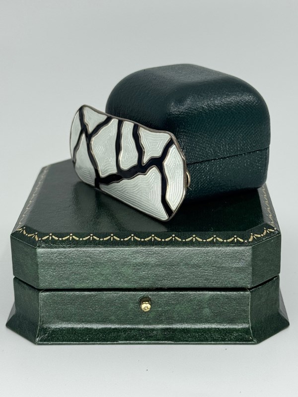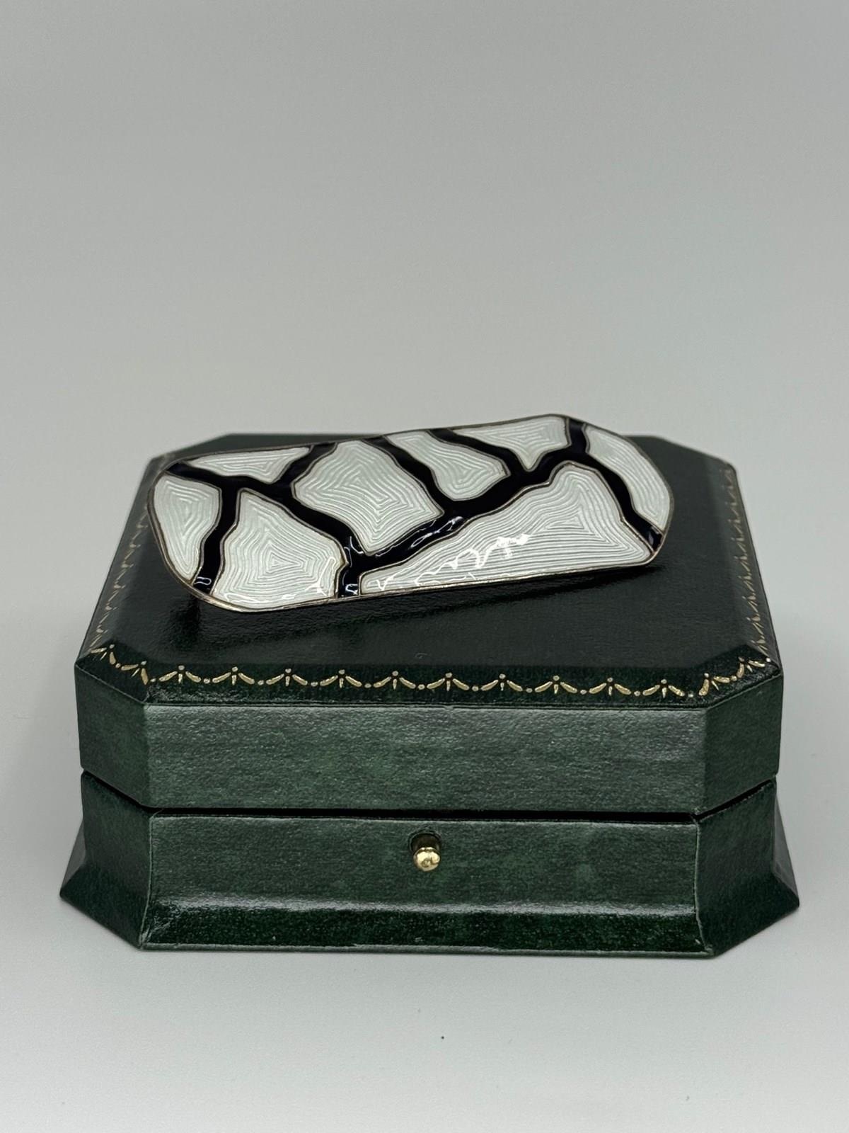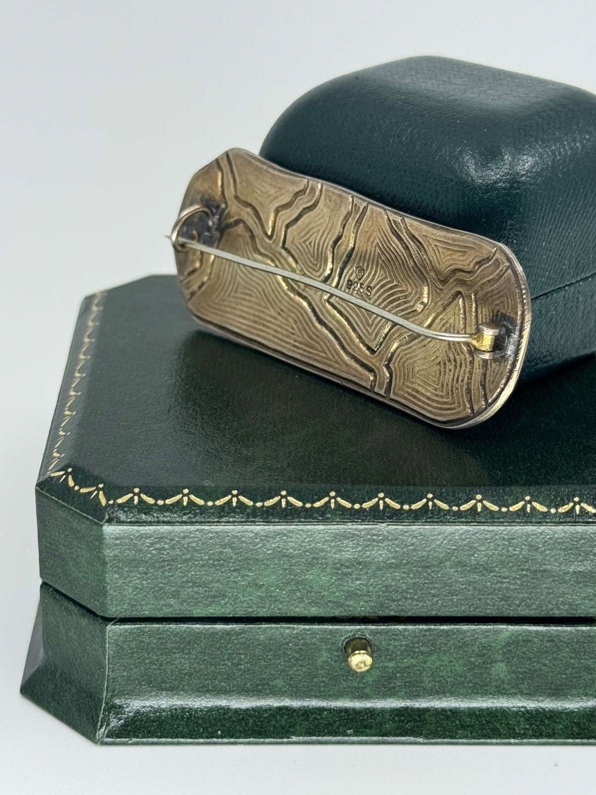 Made in silver gilt with black and white enamel of which he is known to have produced brooches in, it is stamped to the reverse 925S. Of very good quality and finish and in great original condition. A very wearable piece and a good size at approx 6cm x 2.5cm, the enamel work is completely intact with no chips or damage and the pin in very good working order.
