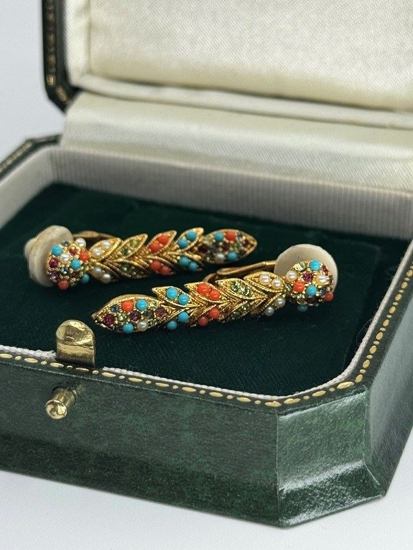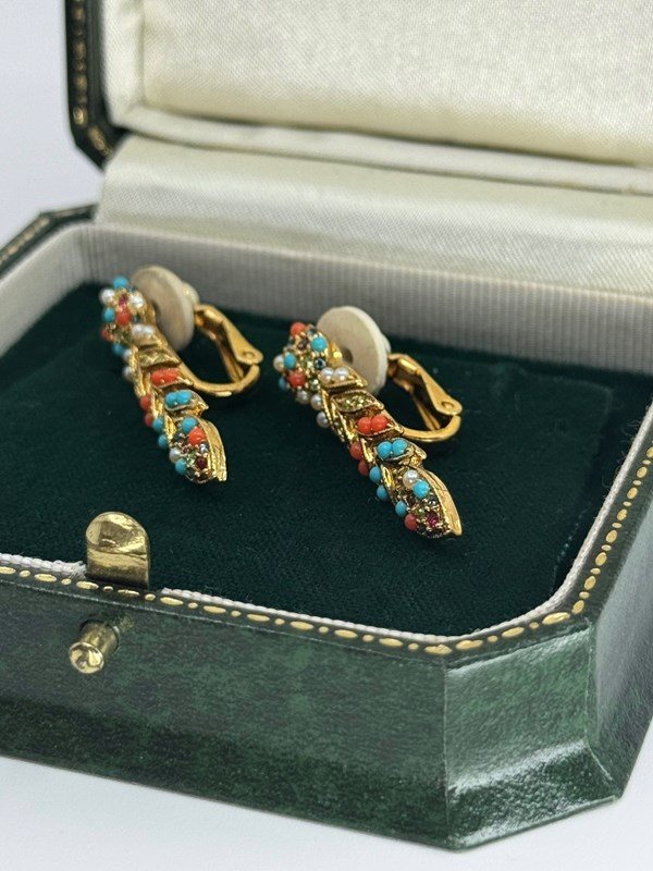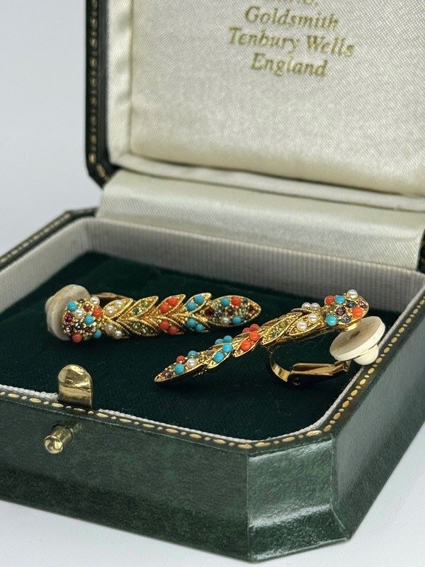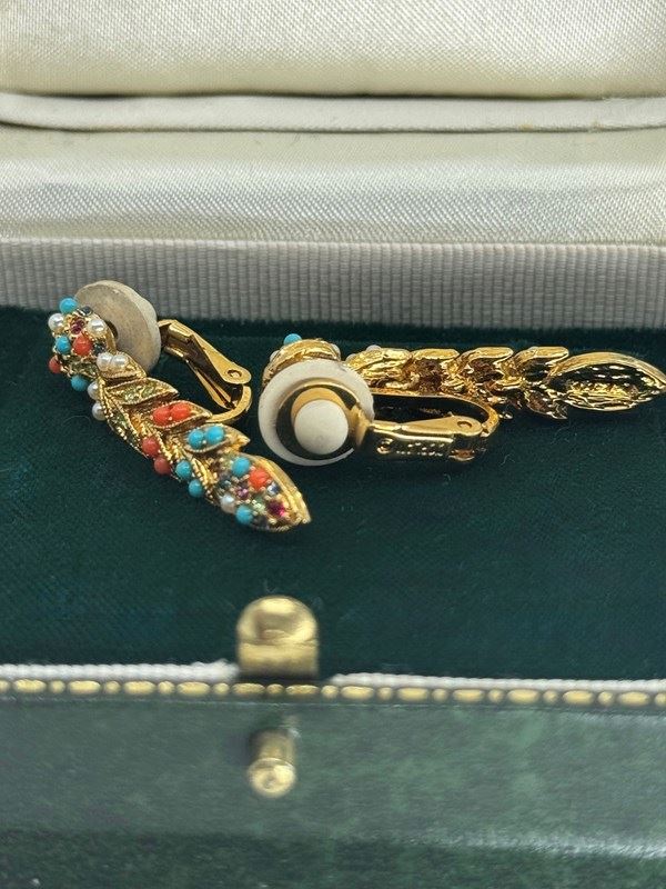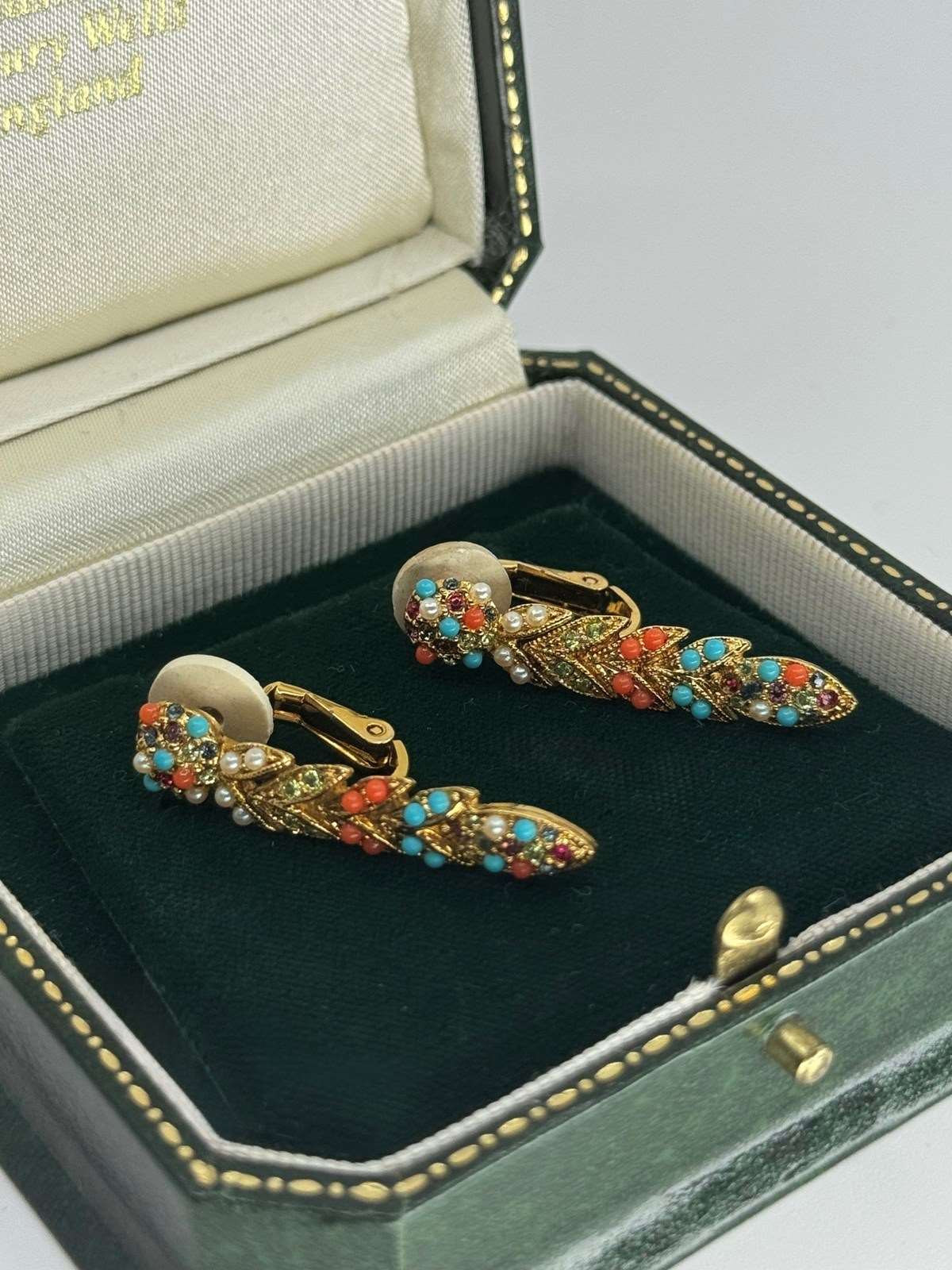 A delightful pair of vintage 1980s D'Orlan clip-on drop earrings, with a slightly articulated drop that just adds a little bit of delicate movement to this feminine pair. They catch the light beautifully, and the mix of brightly coloured cabochons and Swarovski crystals stand out beautifully against the 22K gold plating this quality costume jewellery company is well known for.