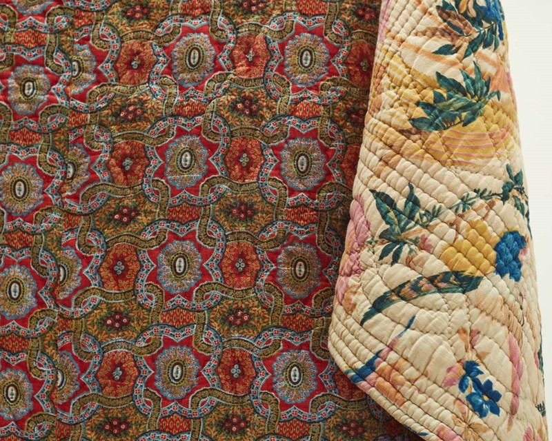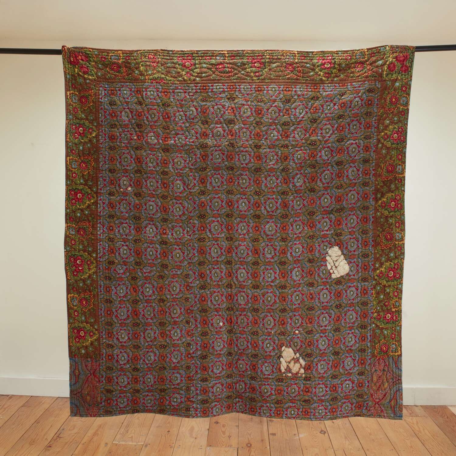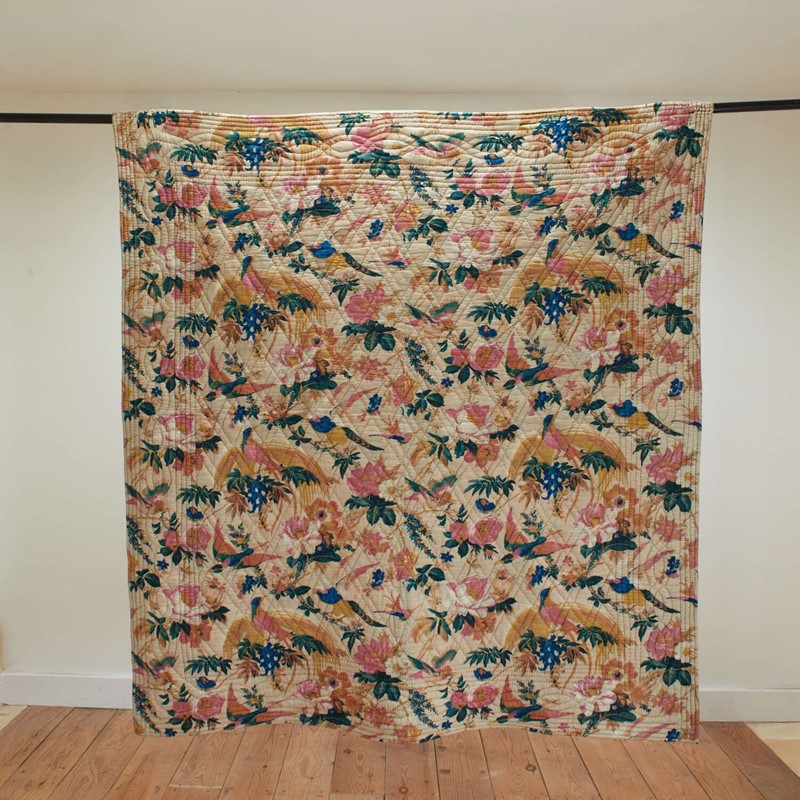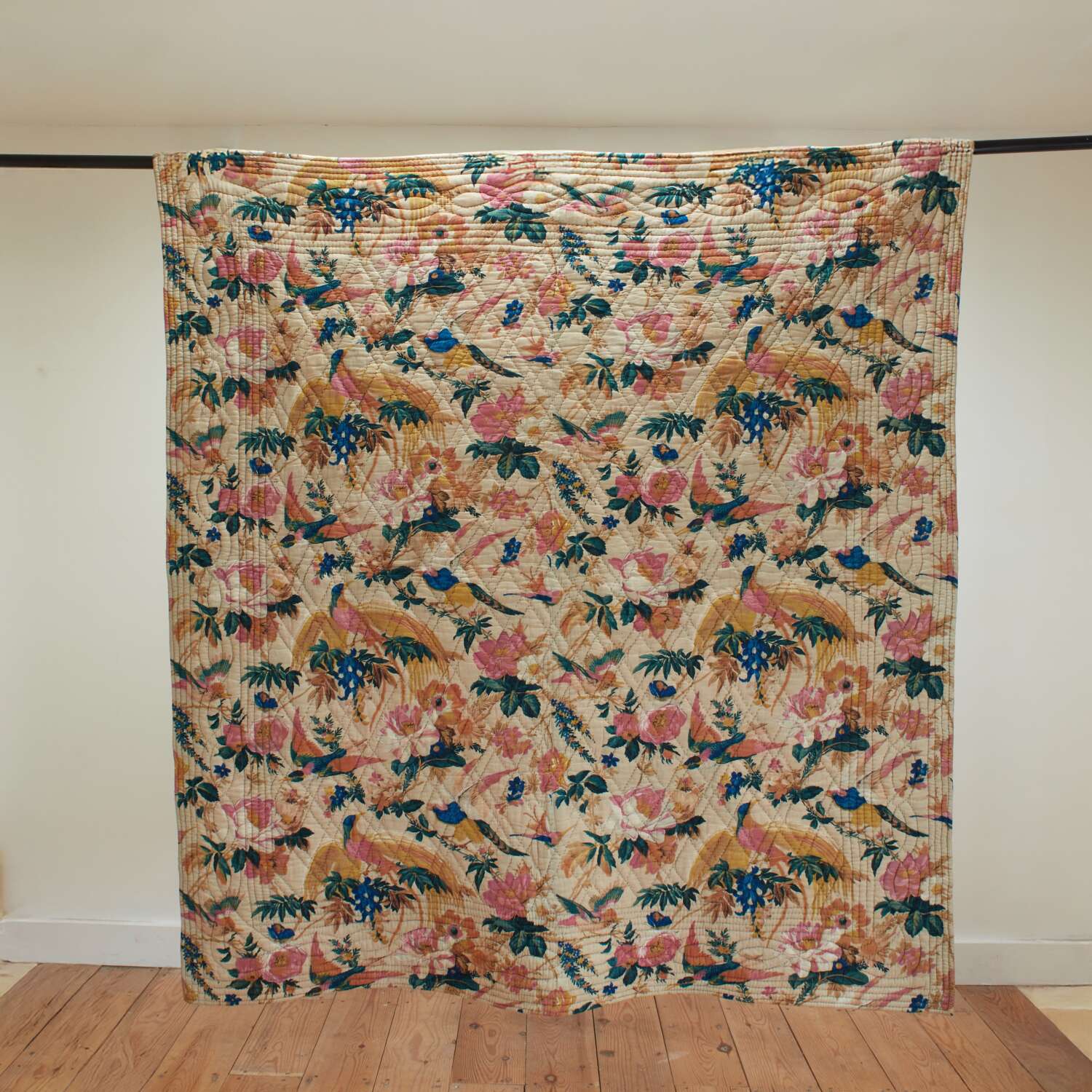 Circa 1830-40s French small cotton quilt of long feathered birds of paradise amongst roses and trailing foliage against a soft warm off white ground.The reverse a fichu of intricate interlocking design elements bordered by a leafy roses pattern.