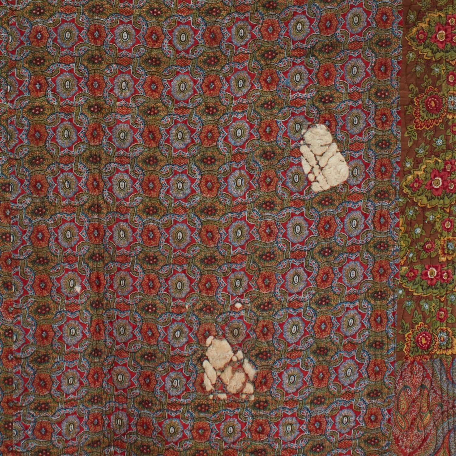 In an as found antique condition with areas of damage where the wadding is showing through on one side