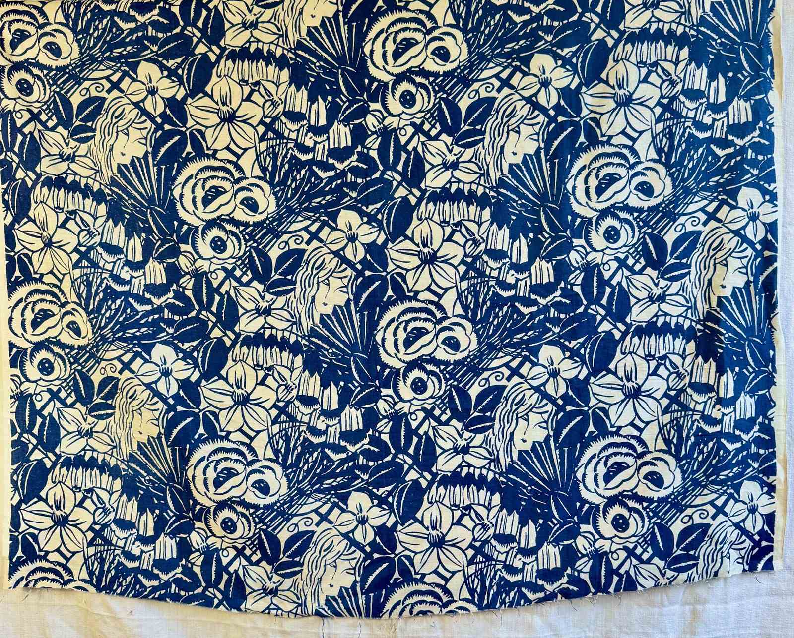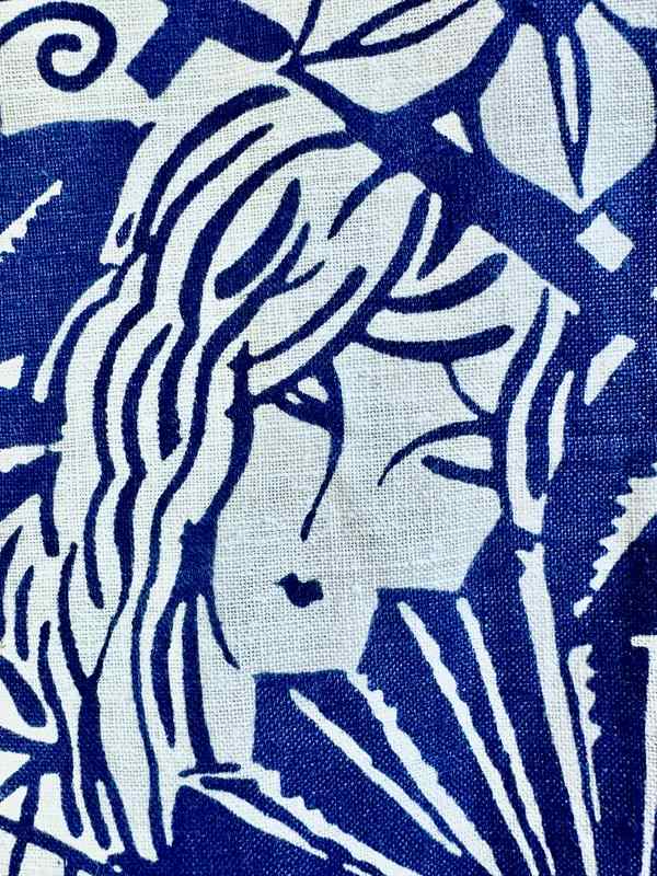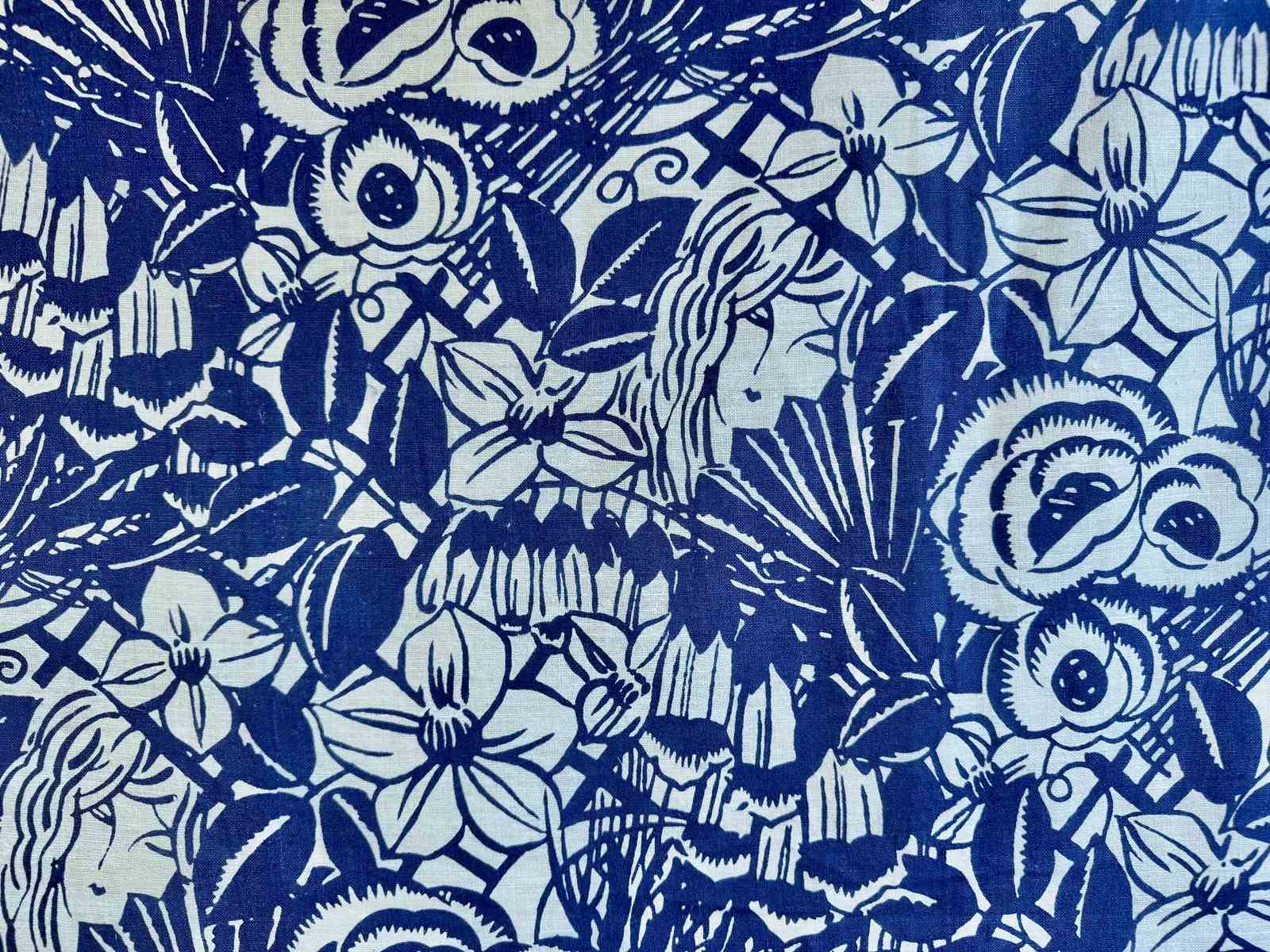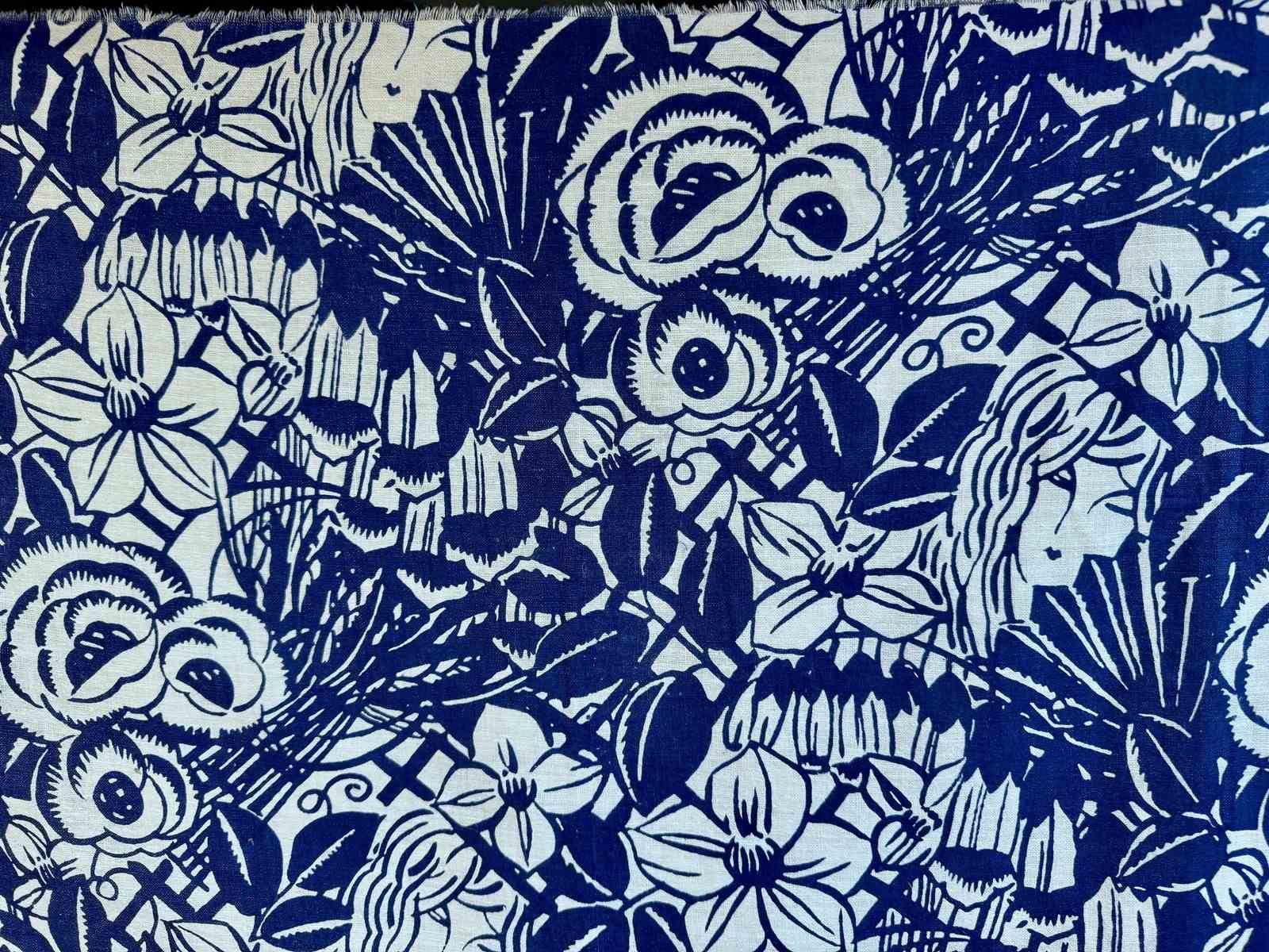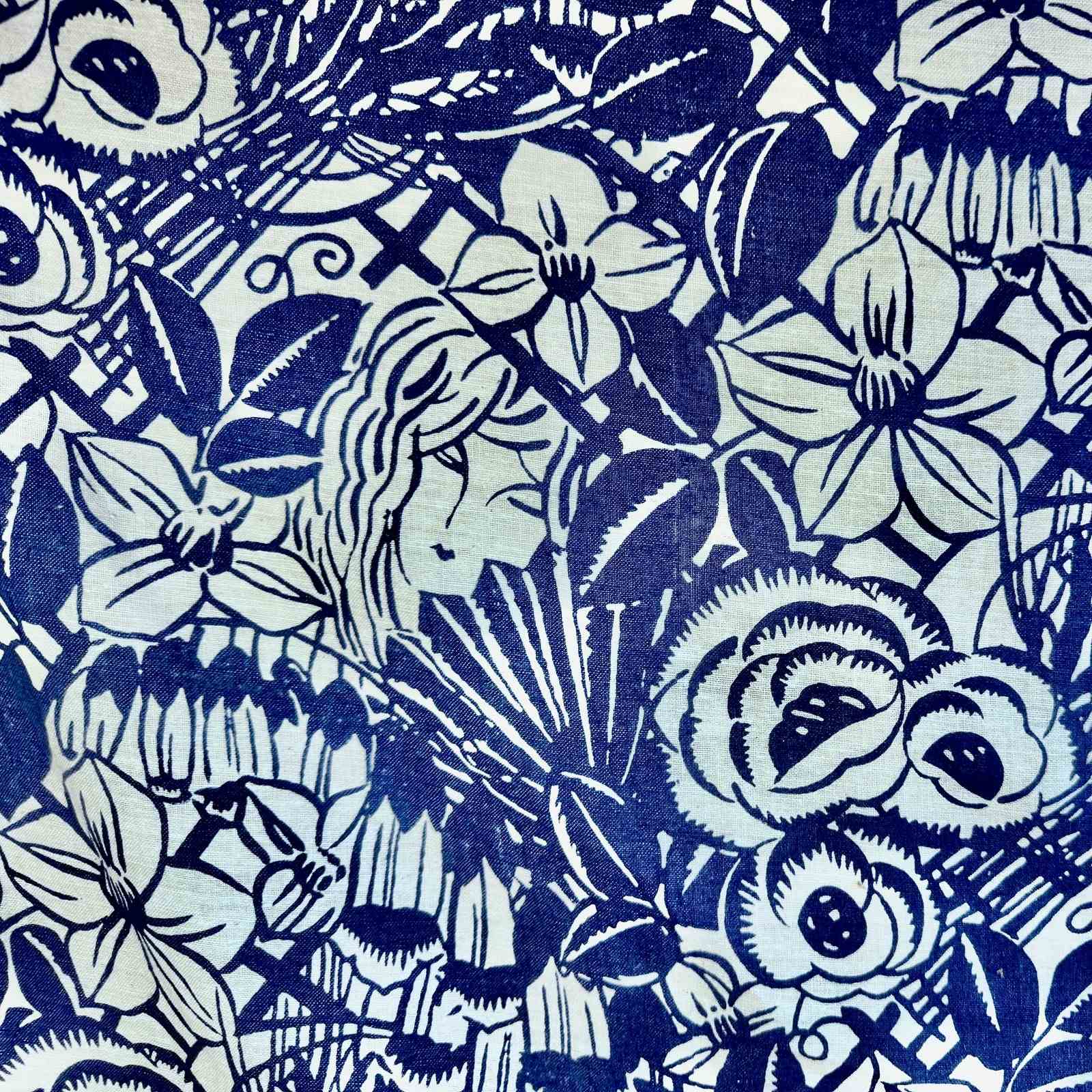 Circa 1950-60s French printed cotton/linen printed with a striking design of a womans face amongst large scale dense flowers and foliage.