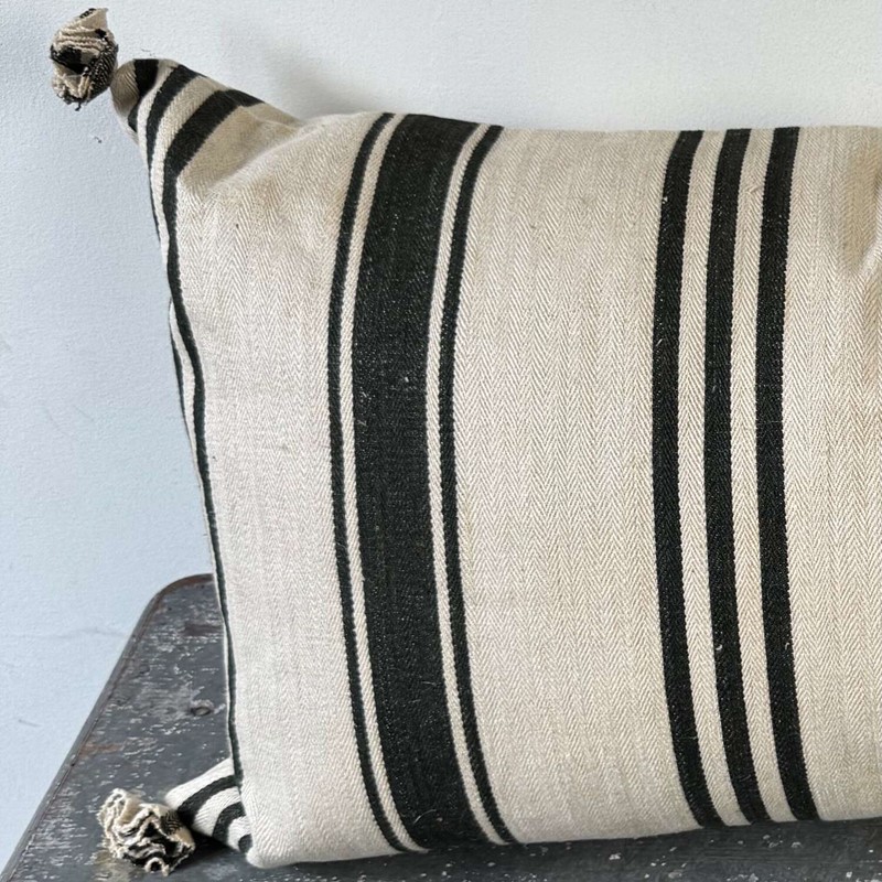 Late 19th century French grainy dark charcoal grey/black striped hemp and nettle cushion finished with rosettes at each corner.Self-backed and softly filled with a duck feather cushion pad and slipstitched closed.