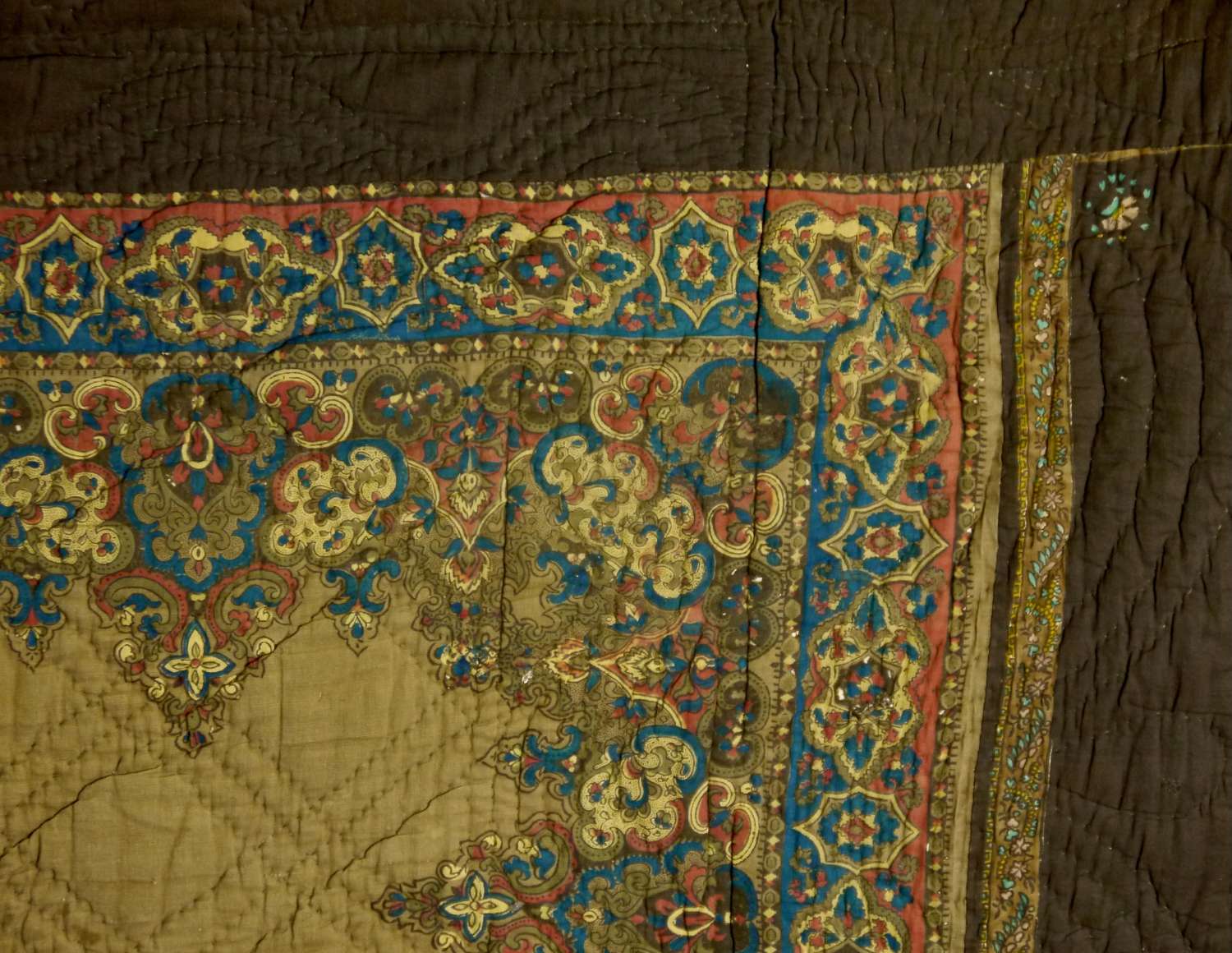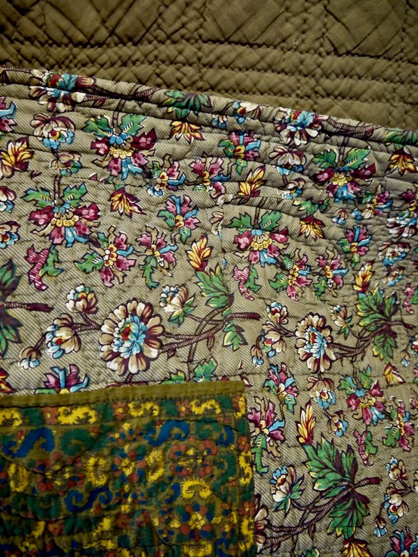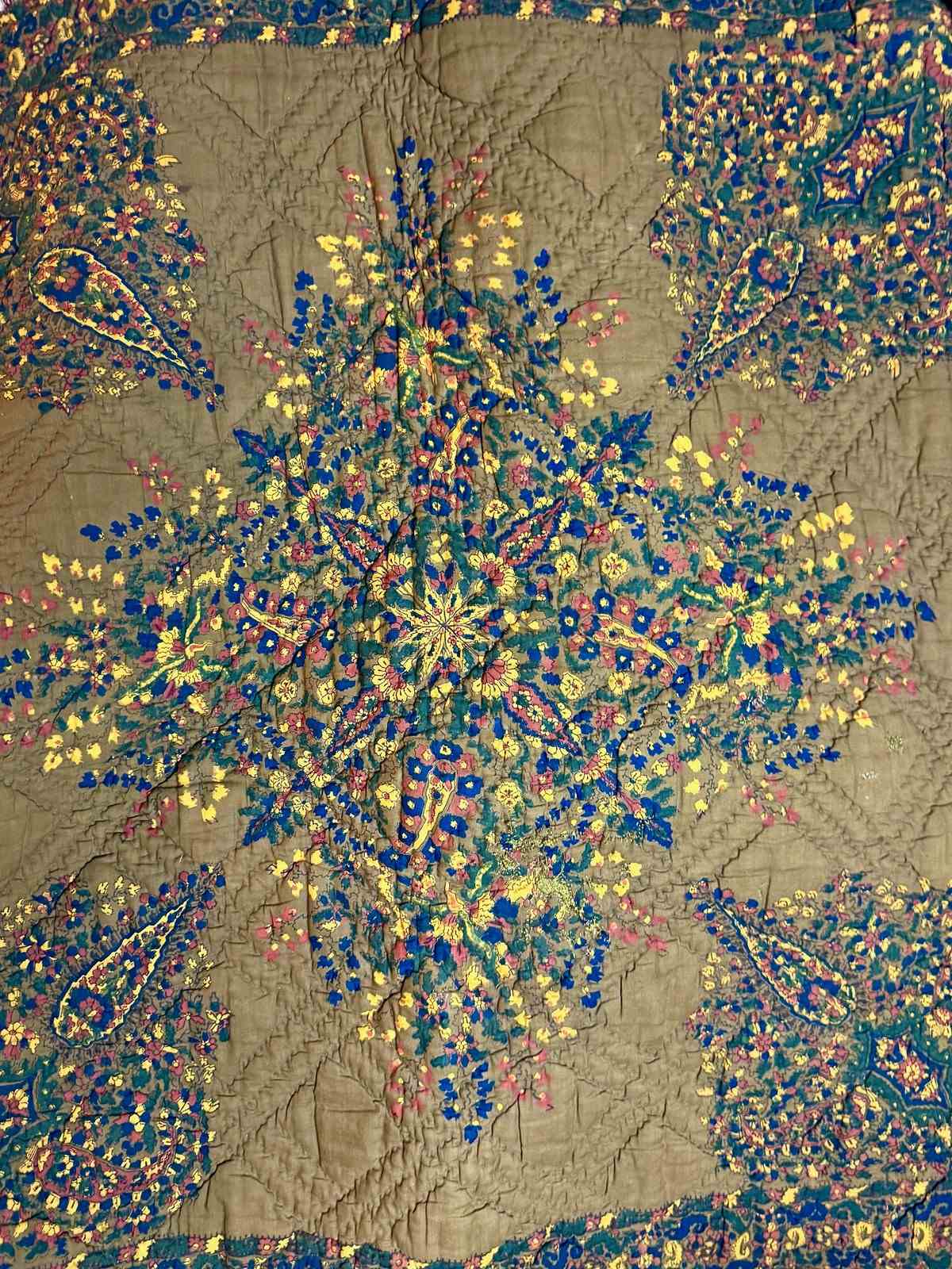 Early 19th century French block printed cotton fichu quilt with a center of stylised flower filled boteh in saffron yellow and green against a dark sage green ground.With a printed border of colourful flowers.The reverse has another fichu at its center block printed in browns and green with a darker brown border.