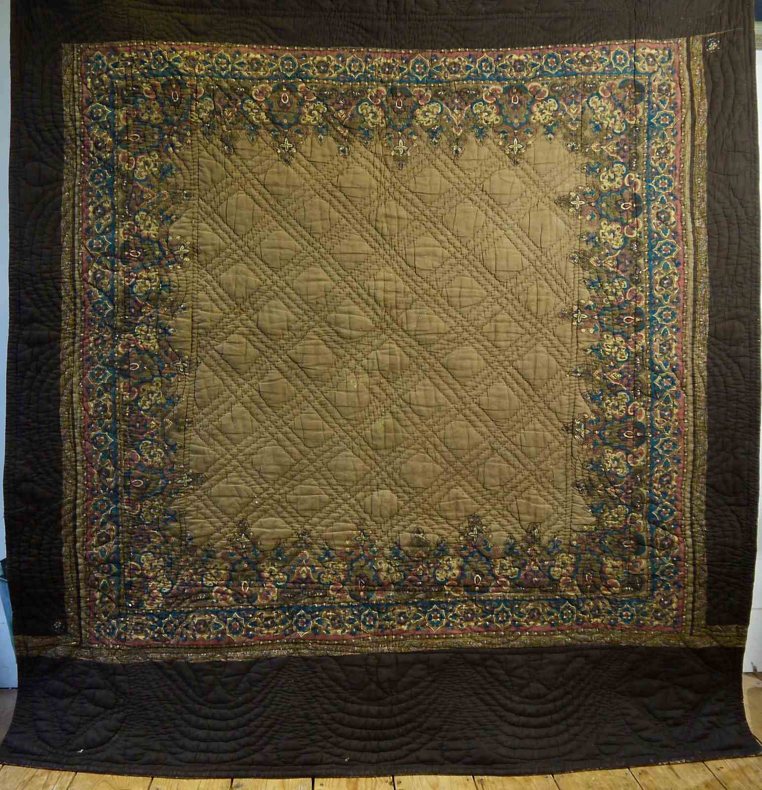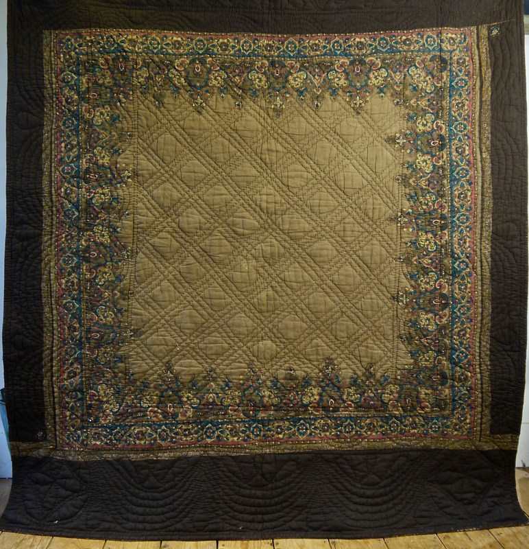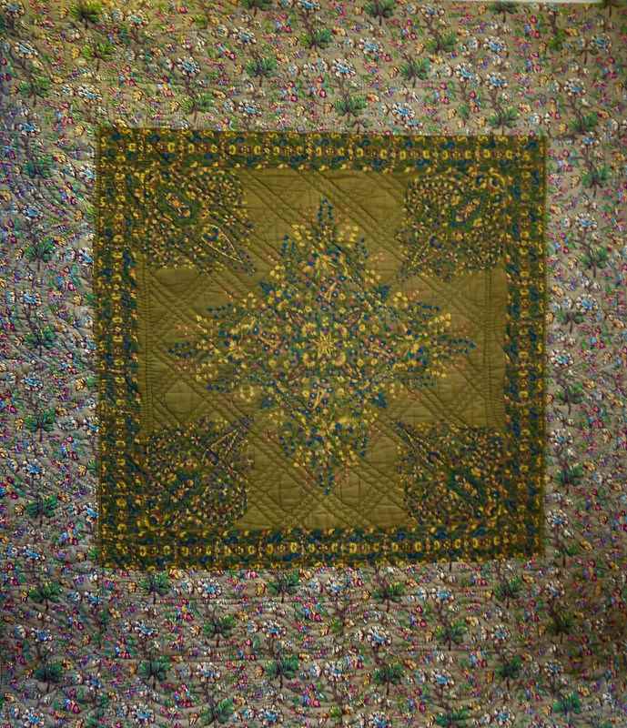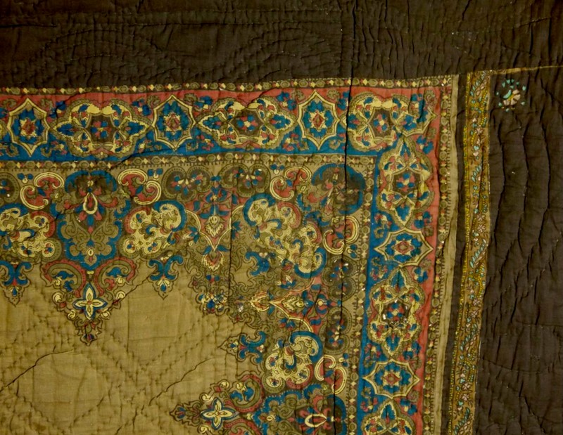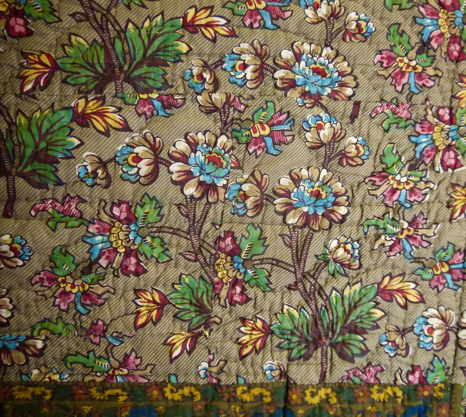 Early 19th century French block printed cotton fichu quilt with a center of stylised flower filled boteh in saffron yellow and green against a dark sage green ground.With a printed border of colourful flowers.The reverse has another fichu at its center block printed in browns and green with a darker brown border.