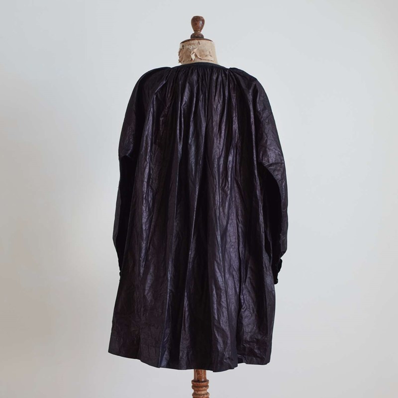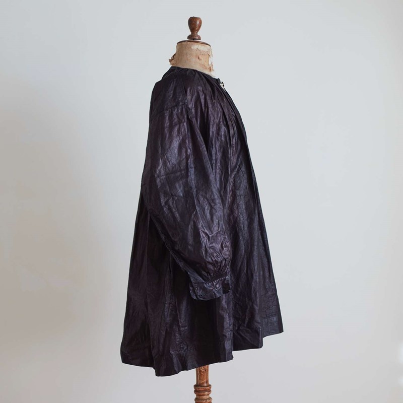 Late 19th century French dark indigo linen biaude or smock originally worn by horsemen and cattlemen when taking their animals to market.ndigo.With it's original glazed finish and a metal disc clasp closing at the neck.In an as found antique and unworn condition.