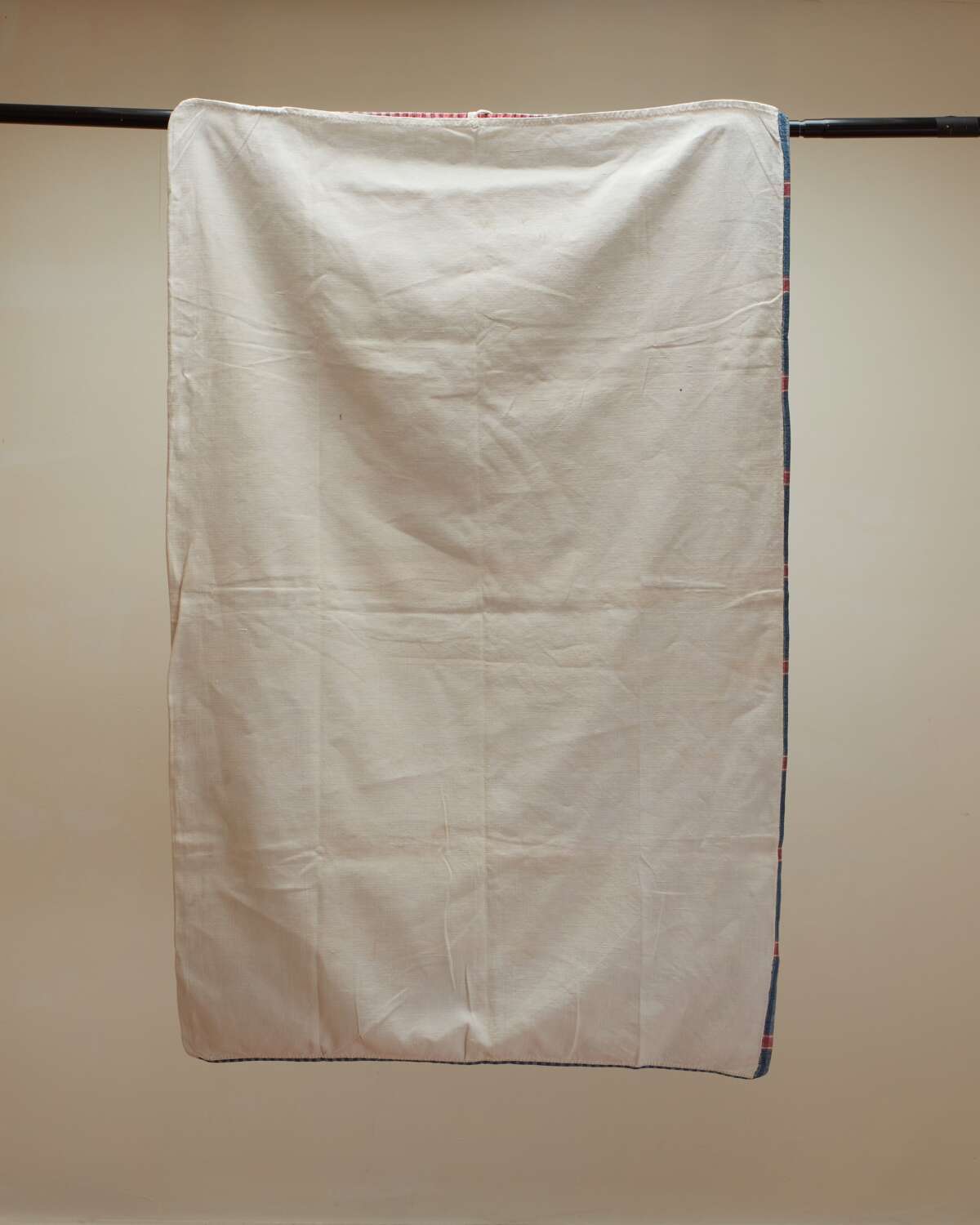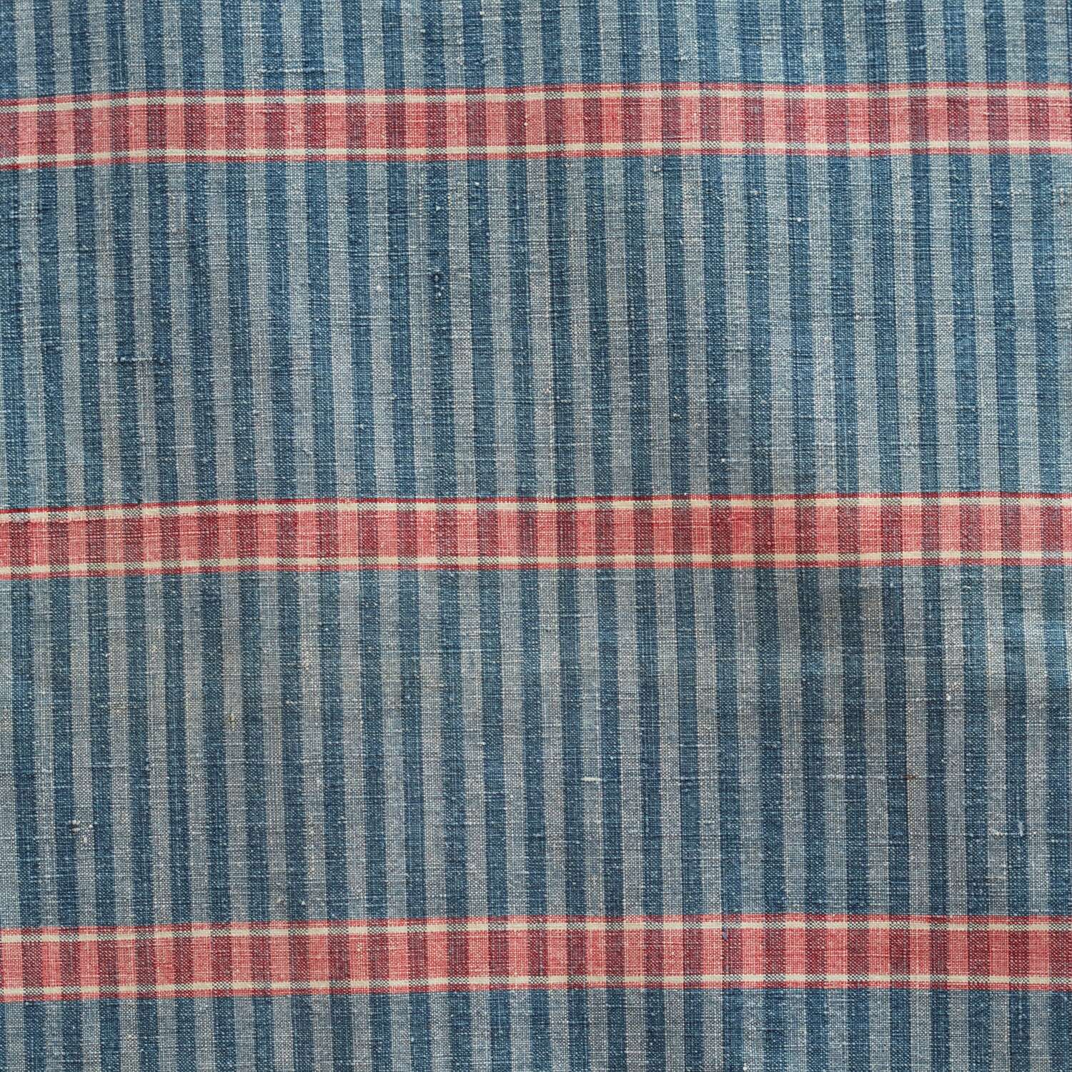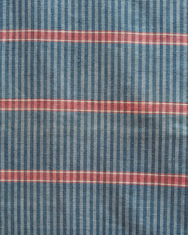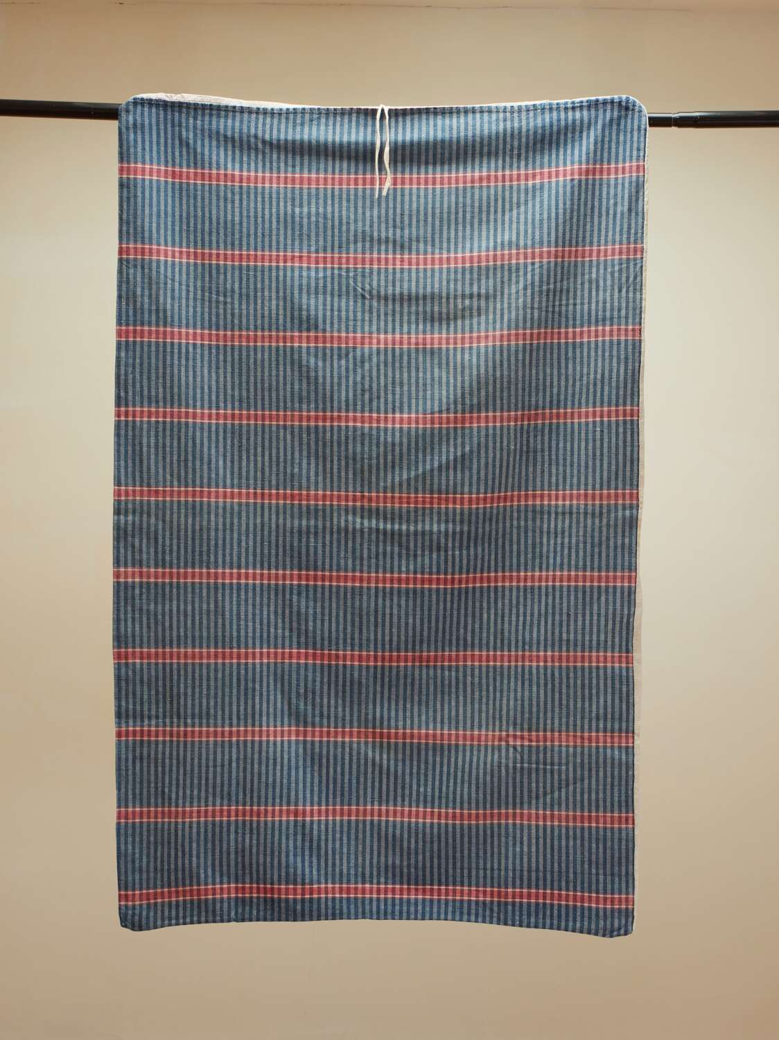 Circa 1870-80s French large linen pillow cover in a soft indigo and red striped check linen.The reverse a plain white hemp/linen and there are two cotton ties for closure.