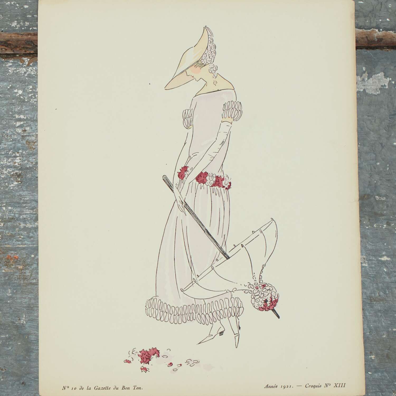 No 10 Année 1922 an original pochoir print from the Gazette du Bon Ton, Paris, an influential fashion magazine published between November 1912 and December 1925 by Lucien Vogel. The magazine published the latest fashion styles available only to subscribers.With a small tear to the right side.