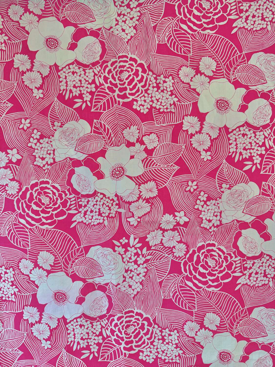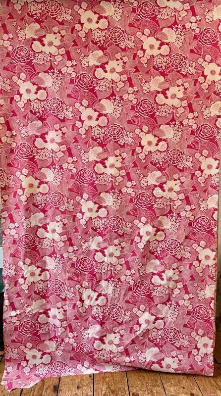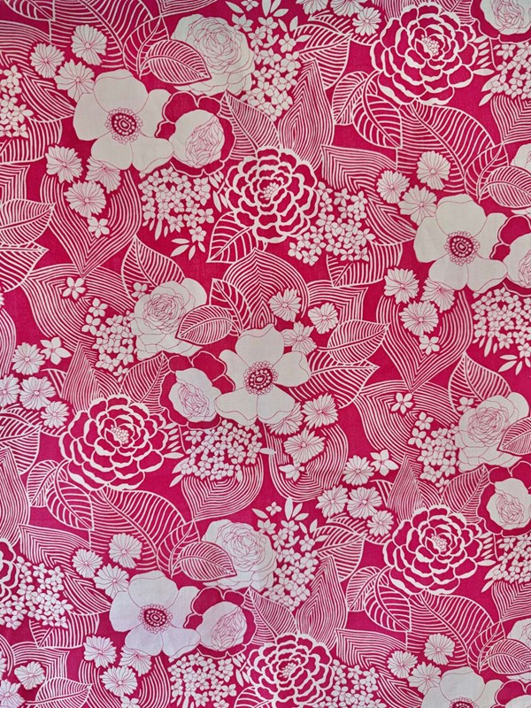 Circa 1960s English printed cotton with a design of stylised flowerheads against dense patterned leafy ground.