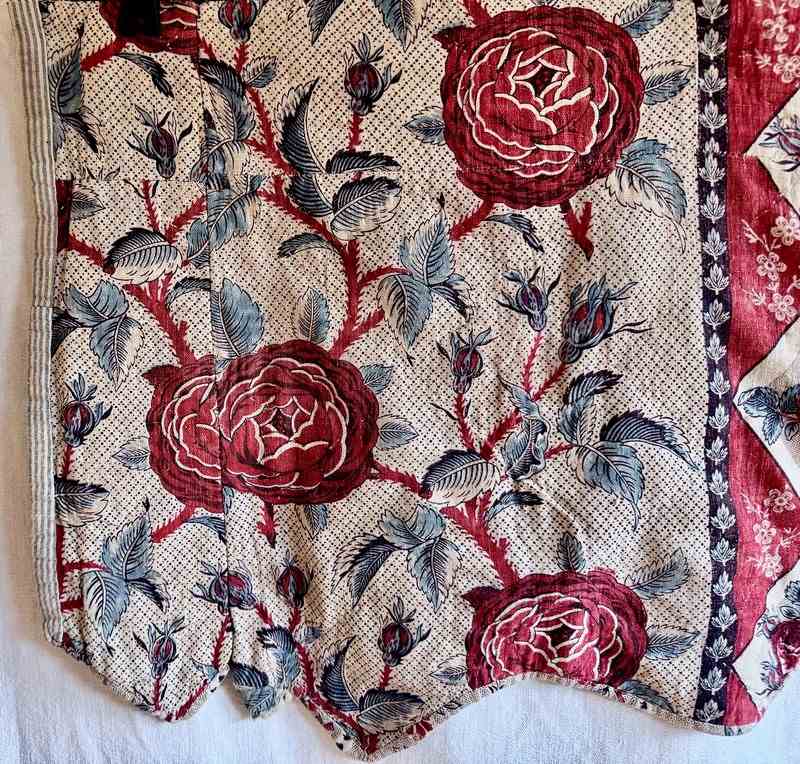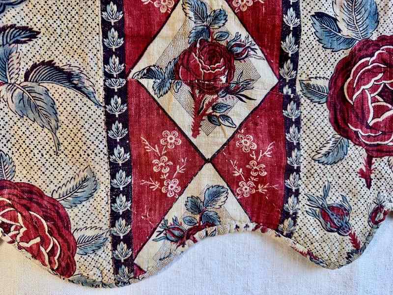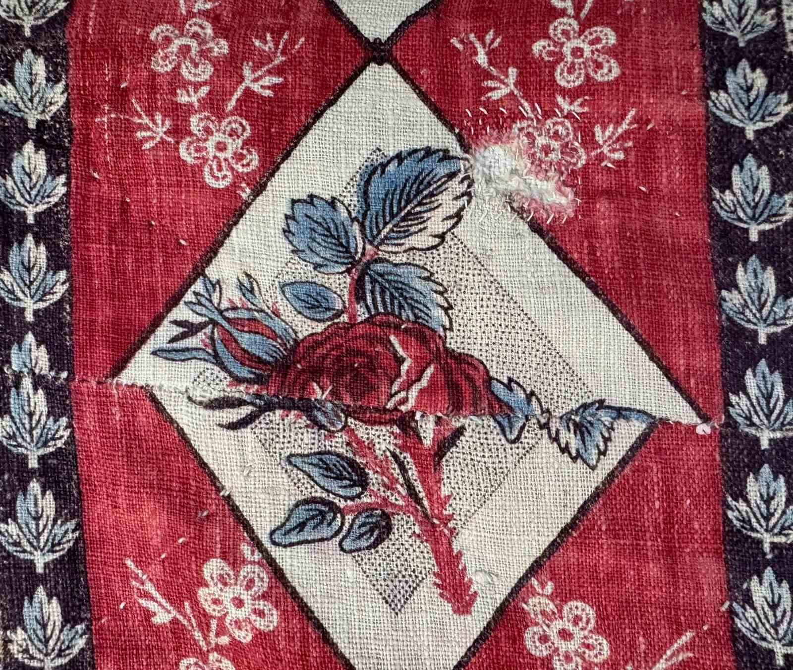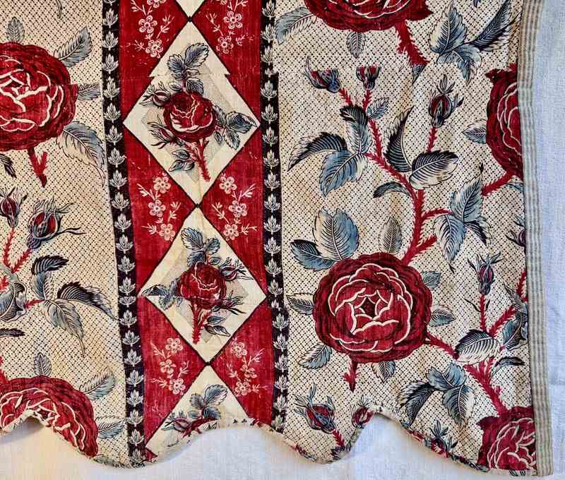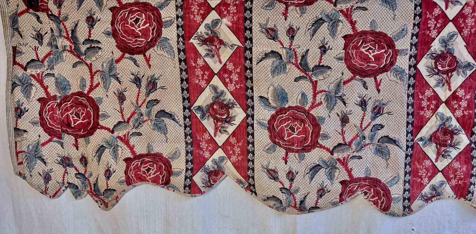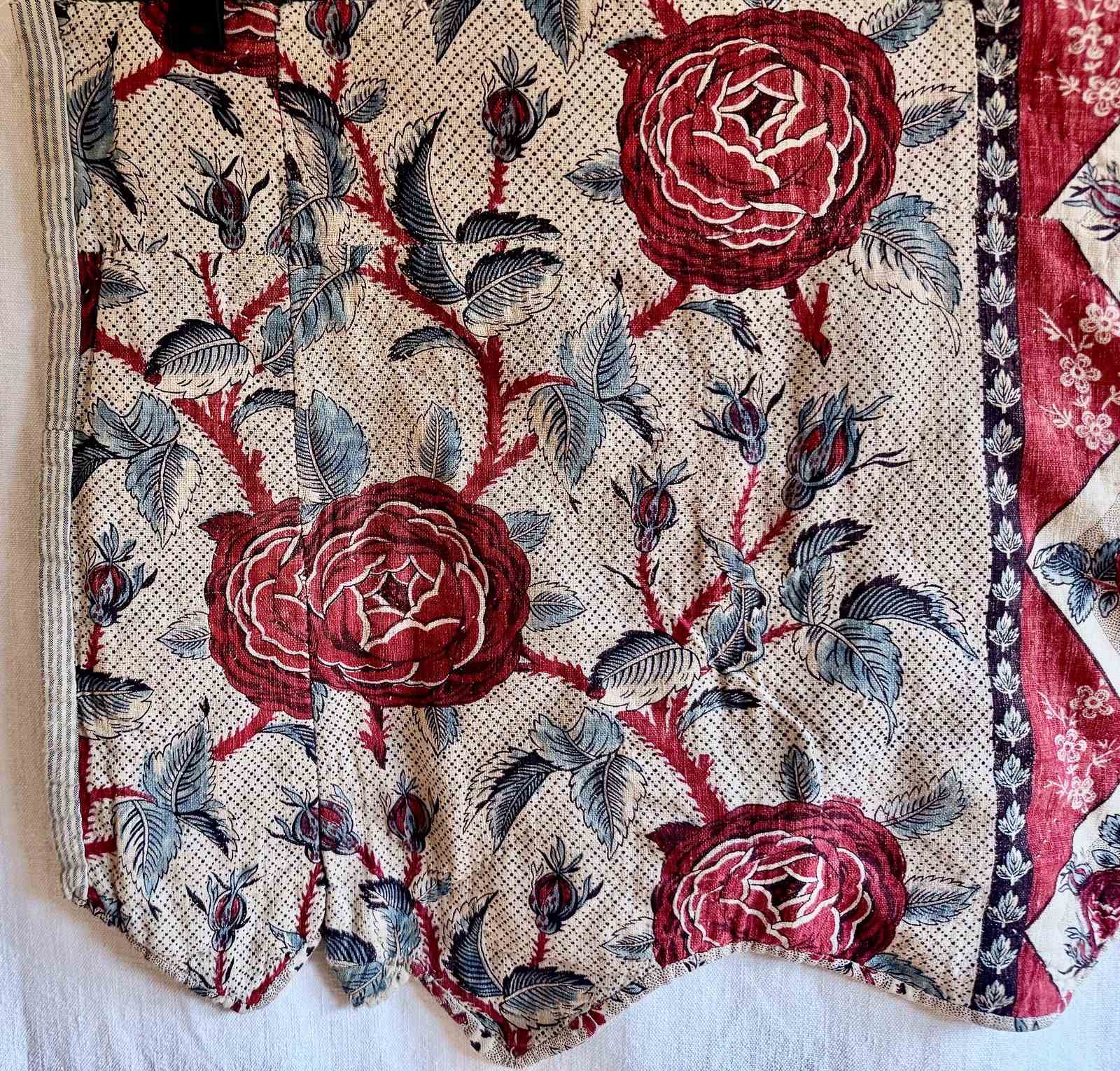Rare circa 1780s French toile de Nantes, possibly by Manufacturer Petitpierre Frères, a printed and quilted cotton pelmet of stylised madder red roses with bleu de pastel leaves on meandering thorny branches.