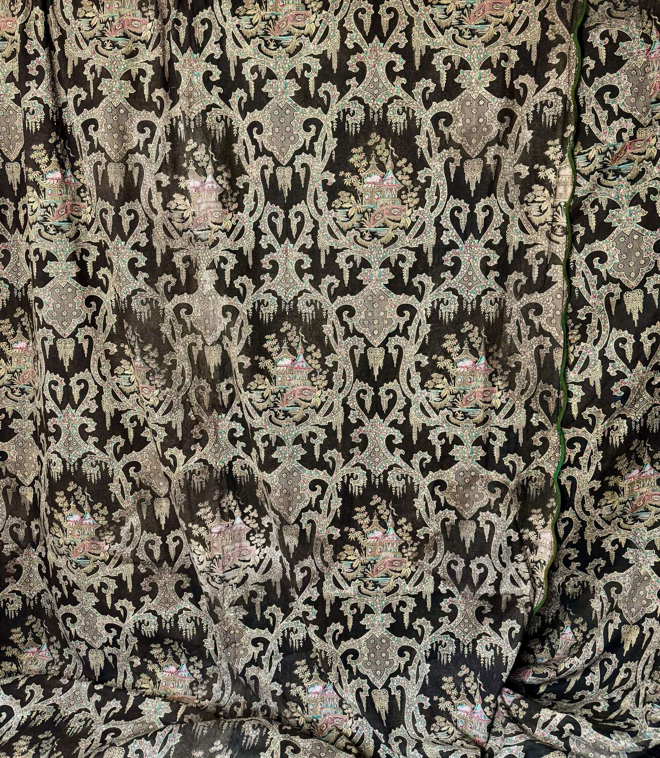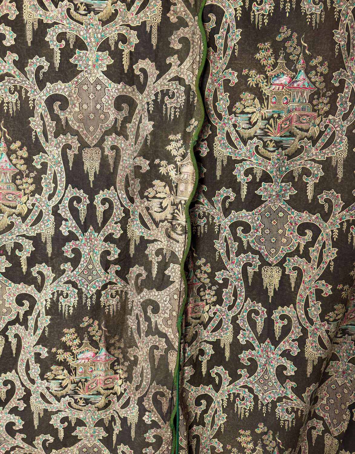 19th century French/possibly English printed cotton curtains in an unusual design of patterned pagodas and bridges in green and red against a 'drab' brown ground.One curtain has a scalloped side edge.