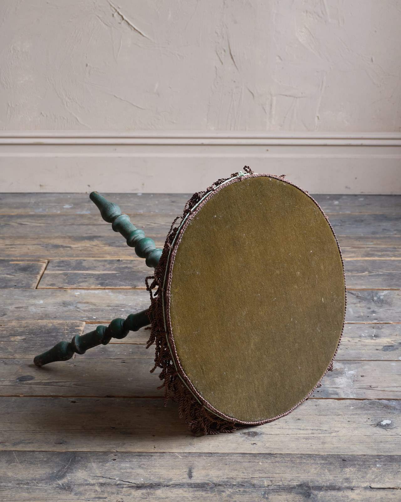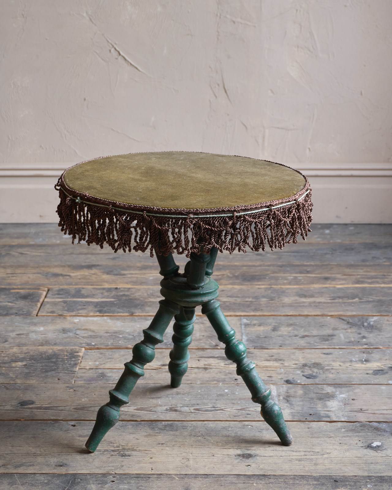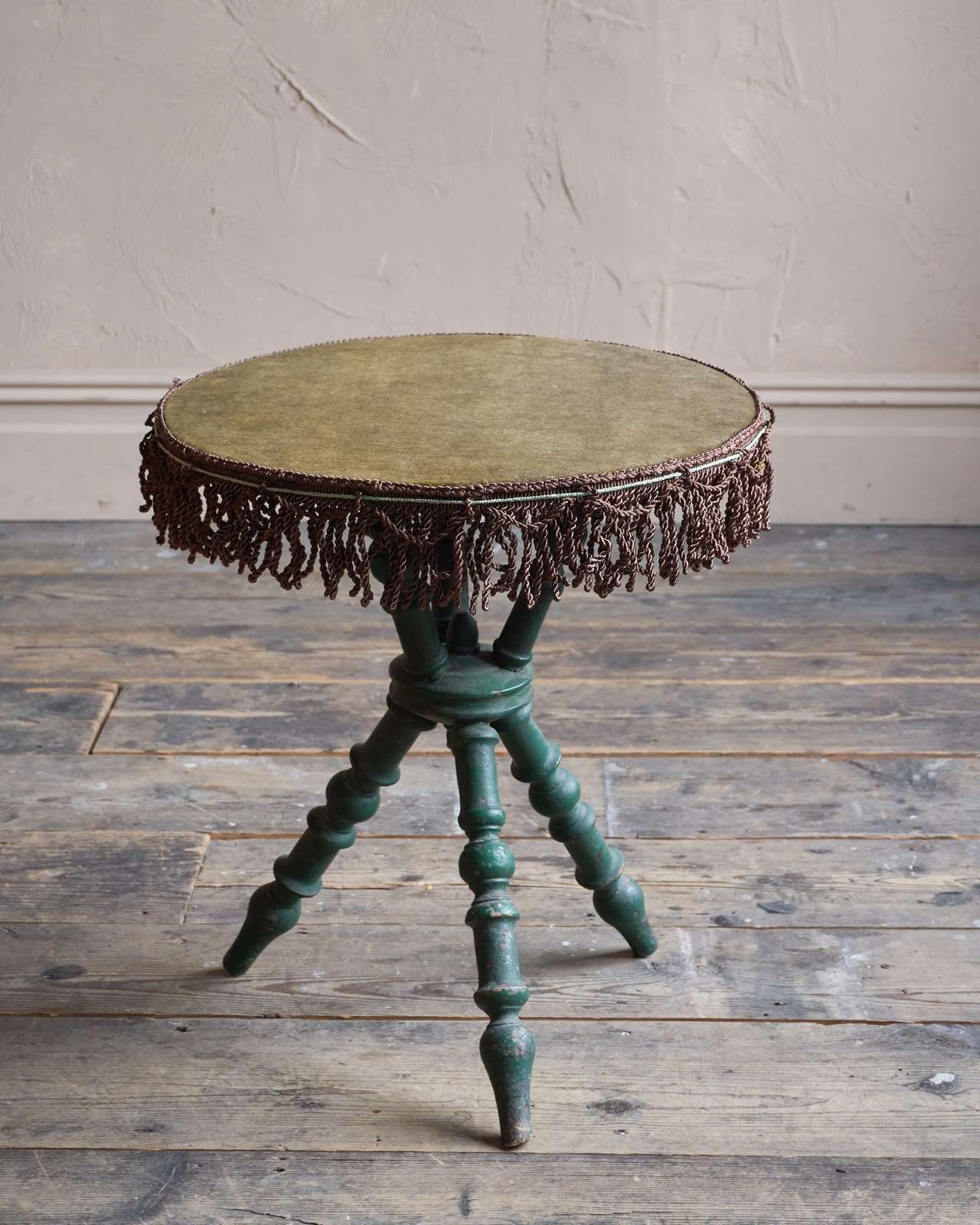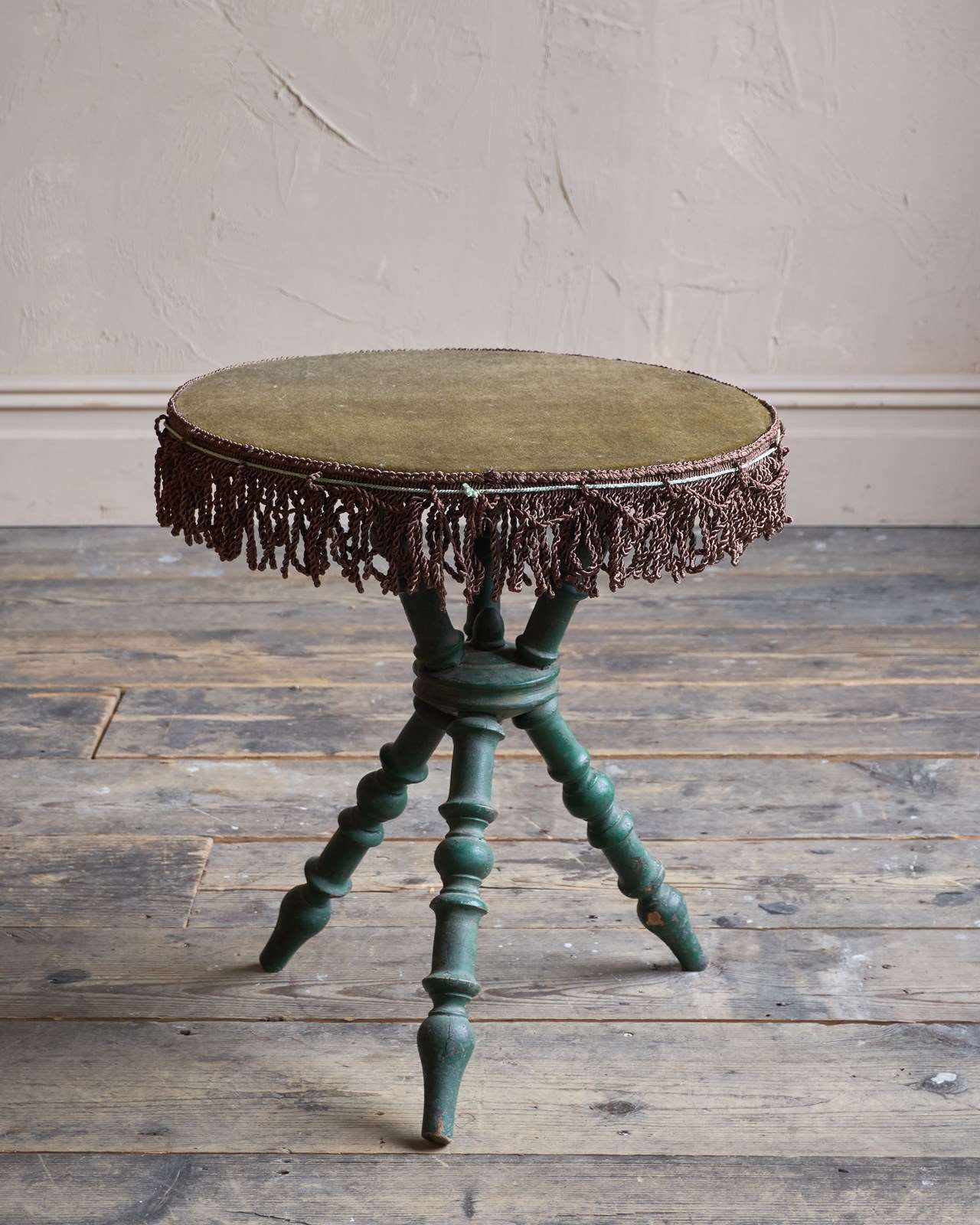 Having a moss green velvet top with a brown tassel trim to the edge.