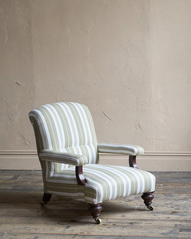 A 19th-century deep-seated open armchair with chunky solid mahogany legs and robust brass castors, complemented by solid mahogany arm supports with linear detailing.